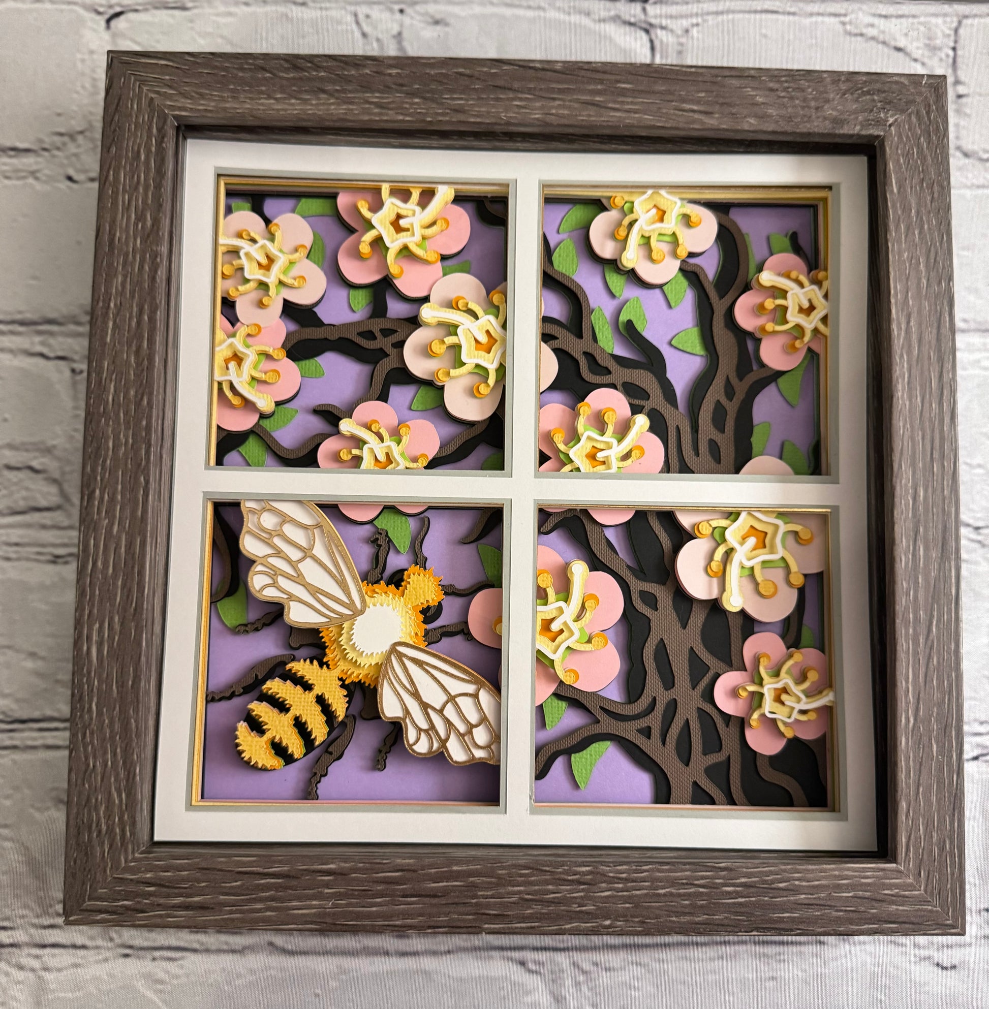 Bee scene bee with floral tree 3D paper art in a shadowbox