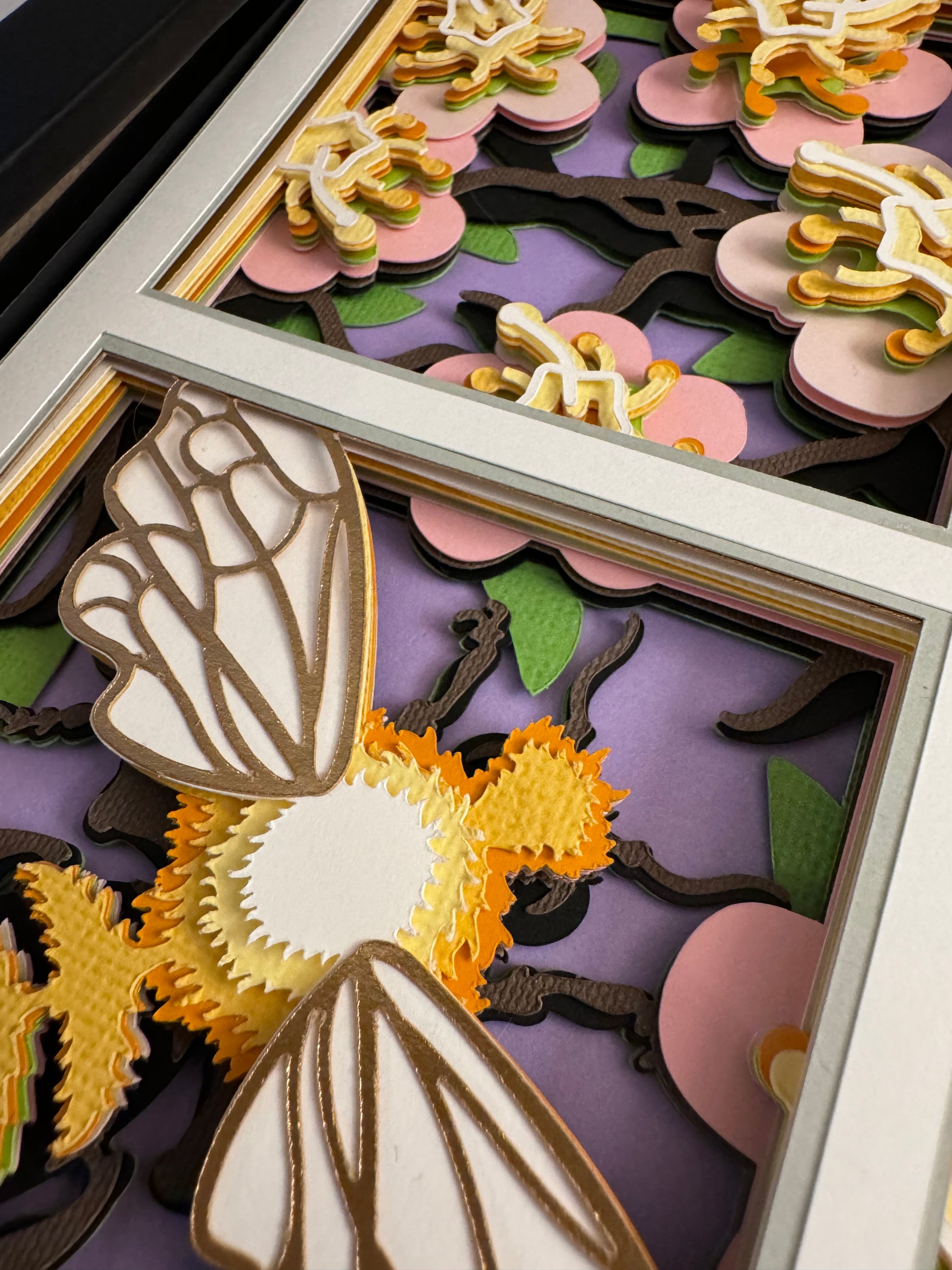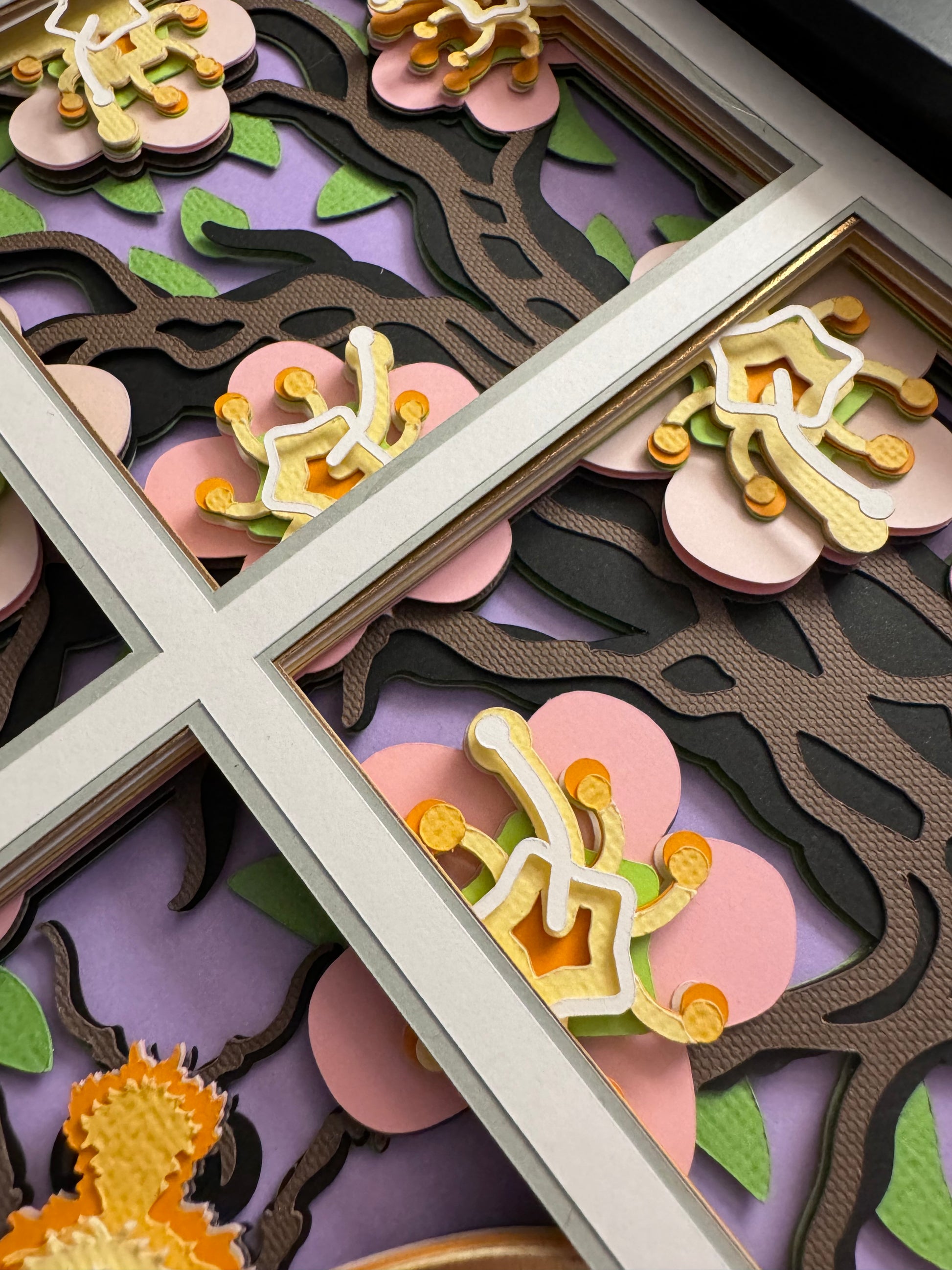 Multi-layered cardstock art. Cut and assembled by hand, this art has adhesive foam in between the layers to give it a 3-dimensional look. This listing is for the art in an 8”x8” shadowbox.