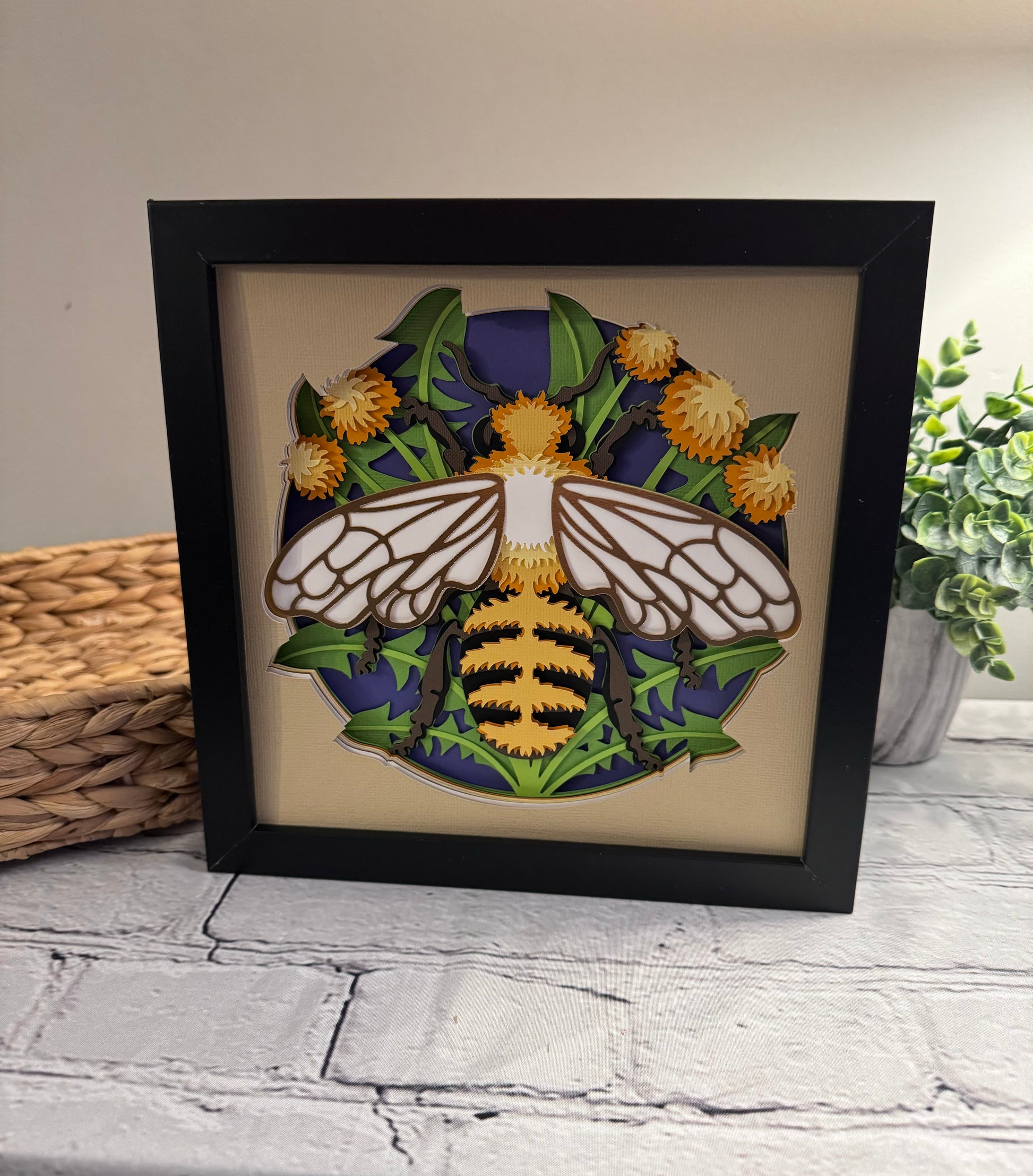 Multi-layered cardstock art. Cut and assembled by hand, this art has adhesive foam in between the layers to give it a 3-dimensional look. This listing is for the art in an 8”x8” shadowbox.