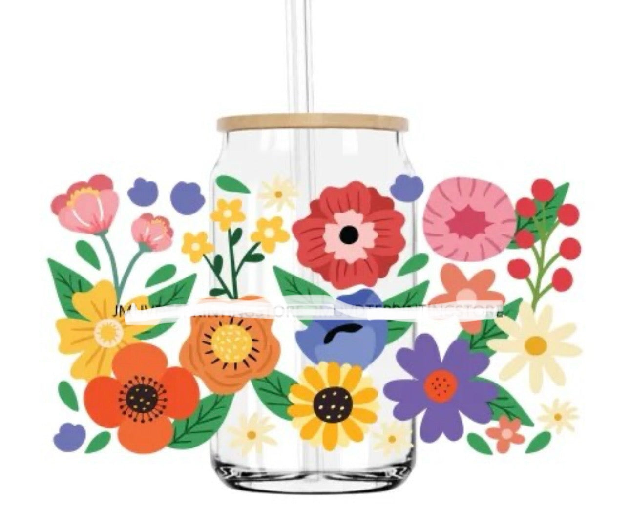 Beer can style glass. Perfect for iced coffee or any other type of cold drink! Designs are a UV DTF transfer and are hand applied. Placement and color of designs may vary slightly from glass to glass. Bamboo lid and glass straw are included. This glass makes the perfect gift!