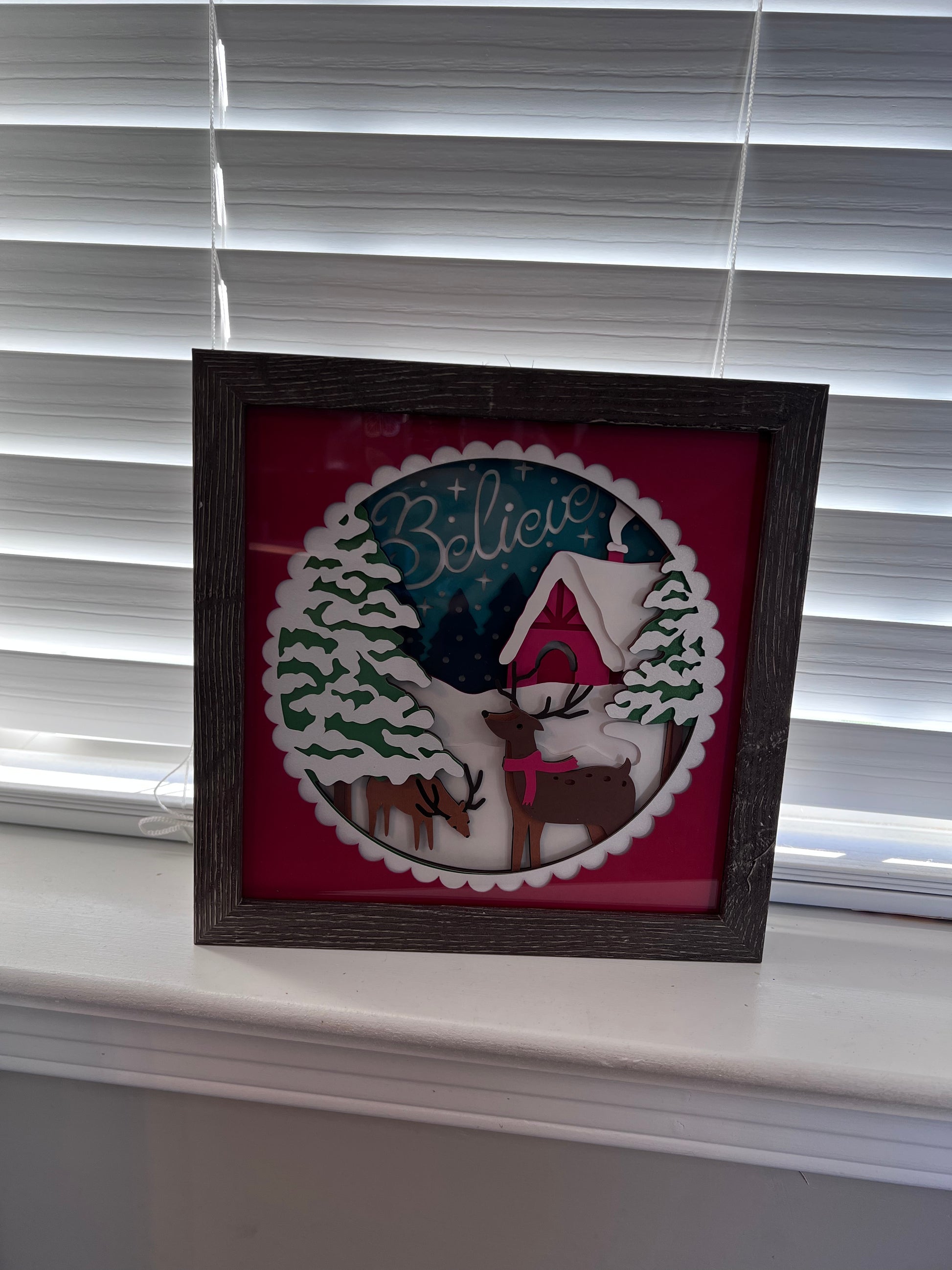 Multi-layered cardstock art. Cut and assembled by hand, this art has adhesive foam in between the layers to give it a 3-dimensional look. This listing is for the art in an 8”x8” shadowbox.