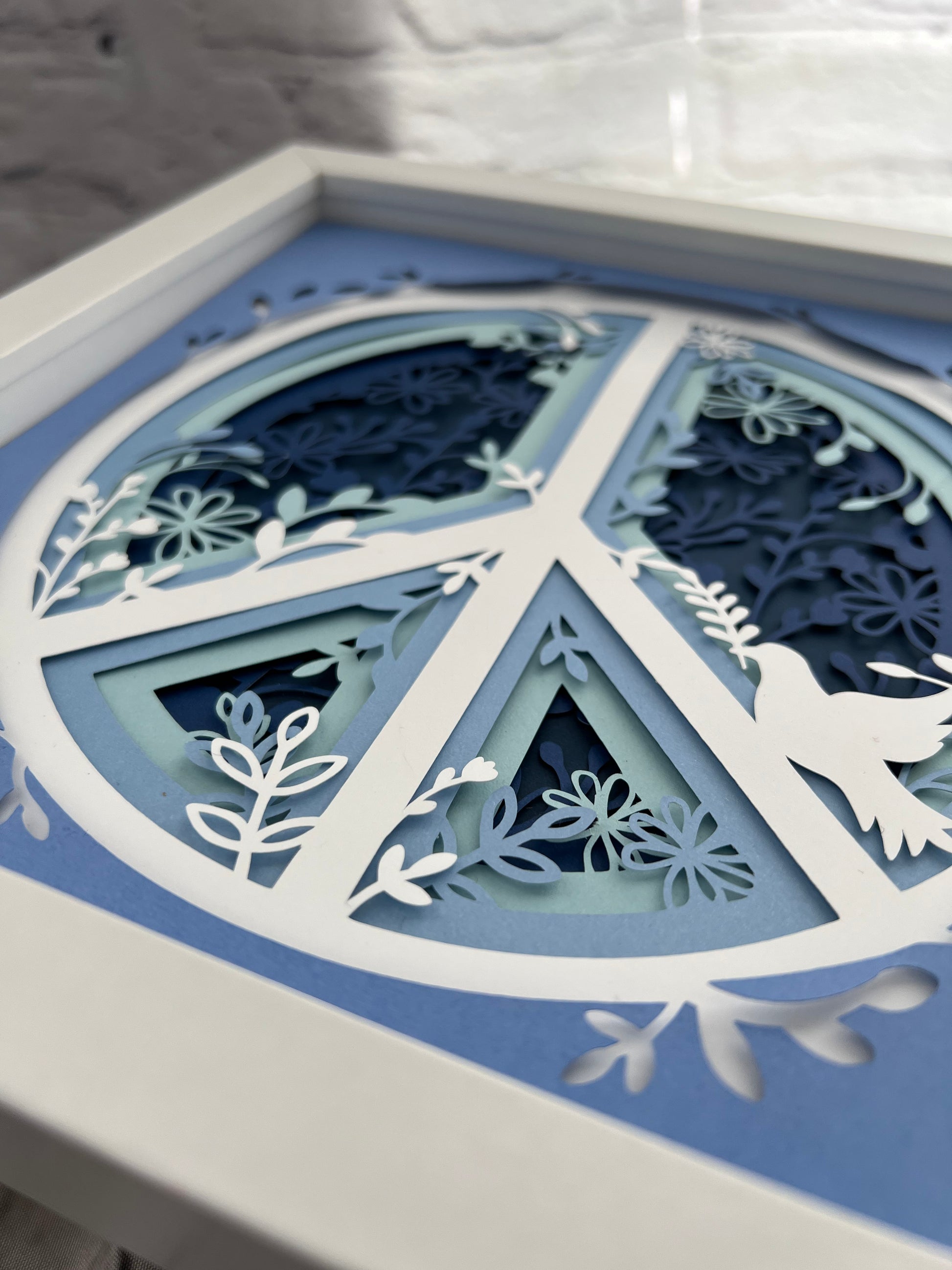 Multi-layered cardstock art. Cut and assembled by hand, this art has adhesive foam in between the layers to give it a 3-dimensional look. This listing is for the art in an 8”x8” shadowbox.