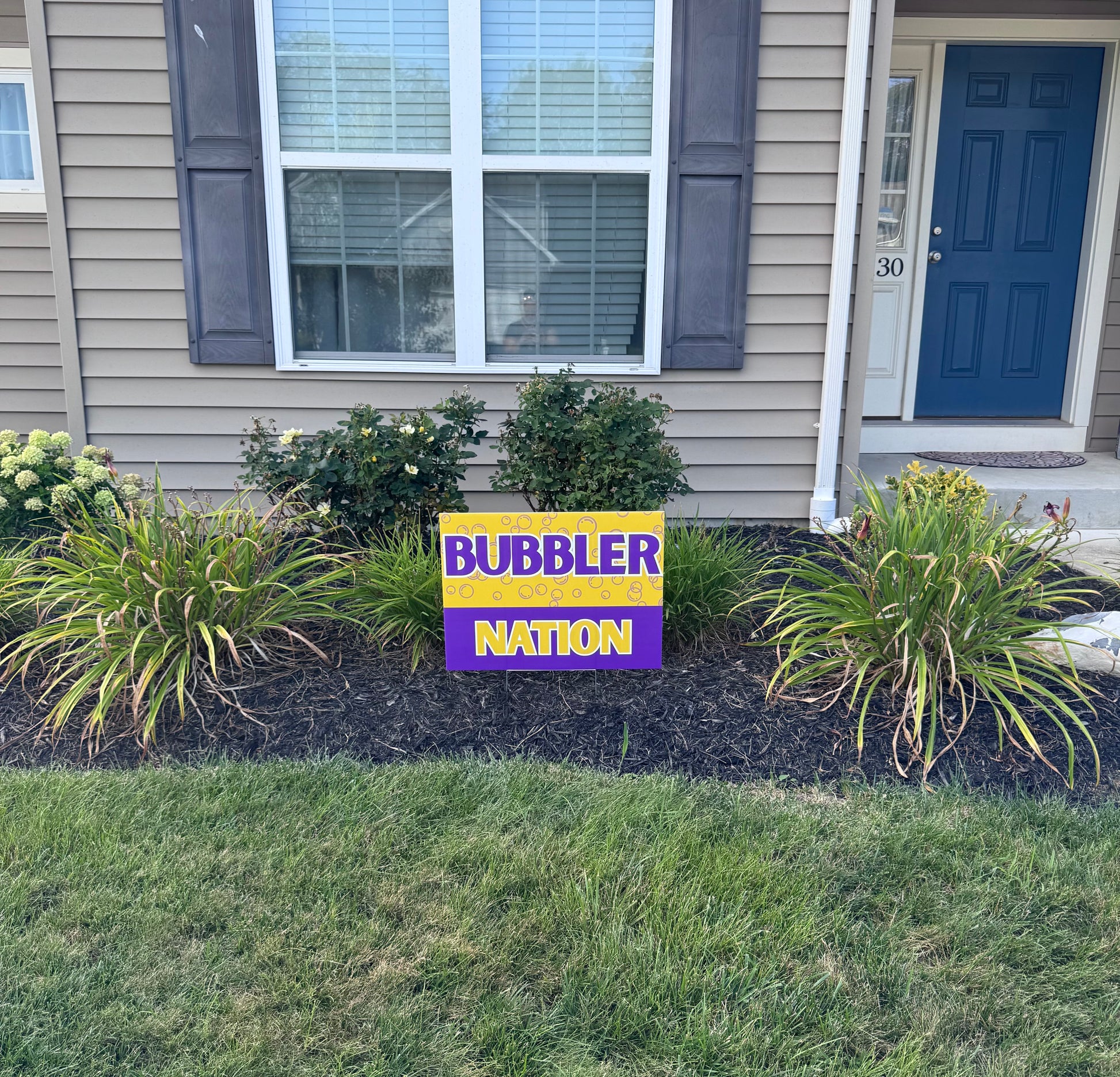 Show your Bubbler pride! This listing is for the Bubbler Nation yard sign with a metal frame. This is a double-sided sign (in the purple and gold bubble graphic) made of corrugated plastic, 24” x 18”, and includes a metal frame for displaying. The sign was designed for the Bubbler Cheer Booster Club to help spread Bubbler pride through our whole district and beyond! Display your sign in your yard, in your window, at your local business, or even in your annual back to school photo. (Details on a how to share your Bubbler Nation photos and win a gift card will be coming soon!)
