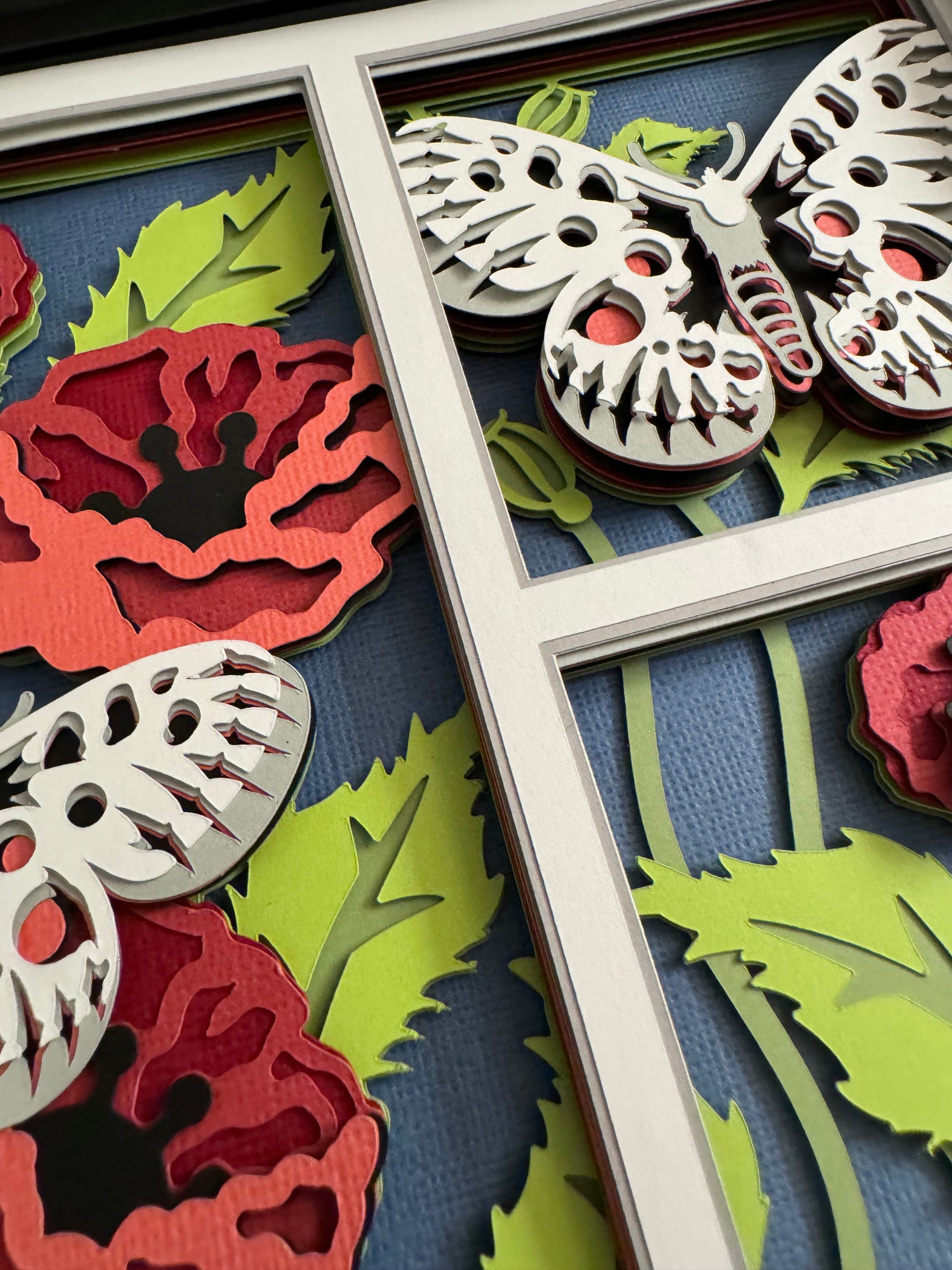Butterfly 3 panel scene apollo butterfly 3D paper art in a shadowbox