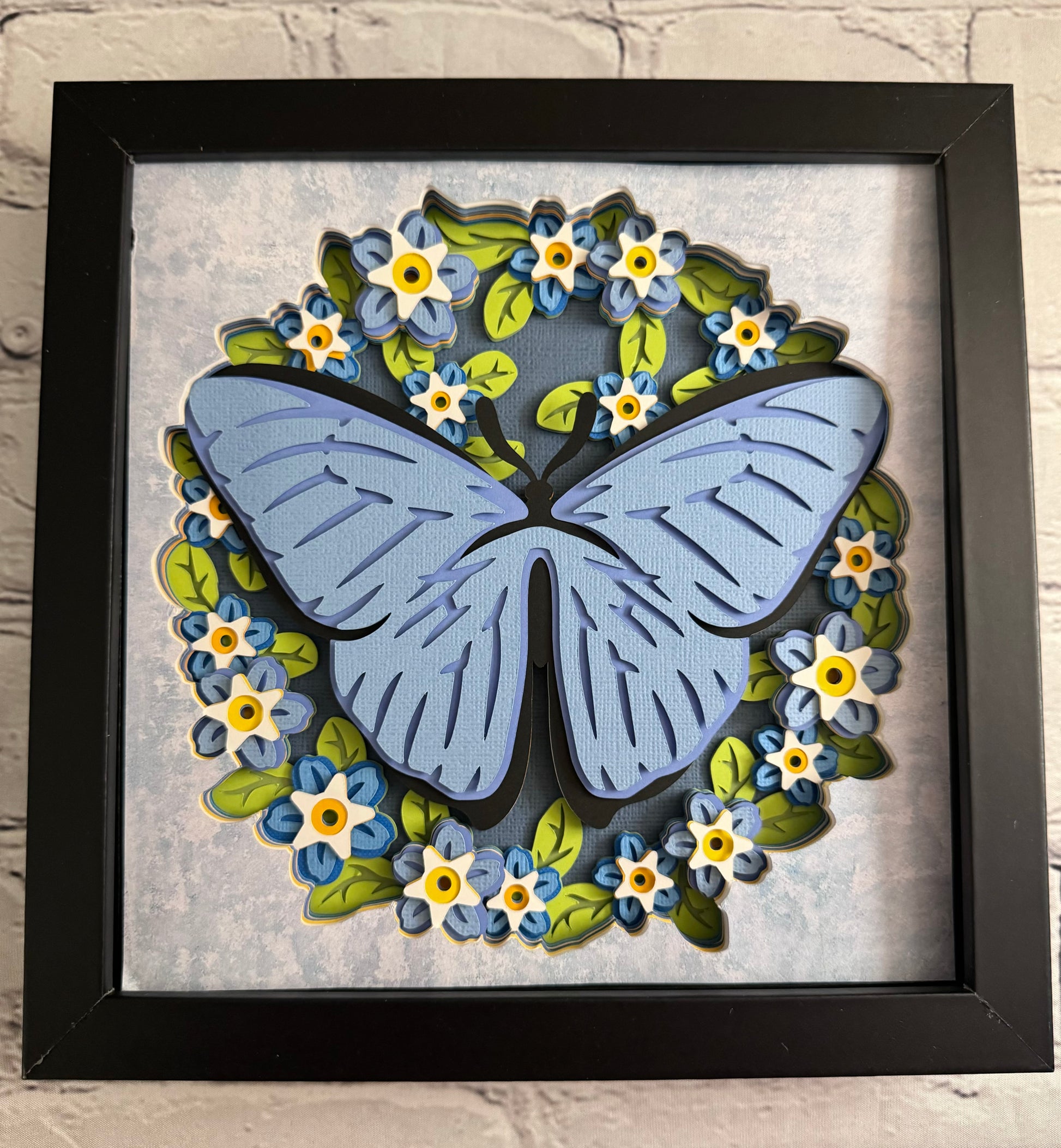 Butterfly solo scene blue morpho butterfly 3D paper art in a shadowbox