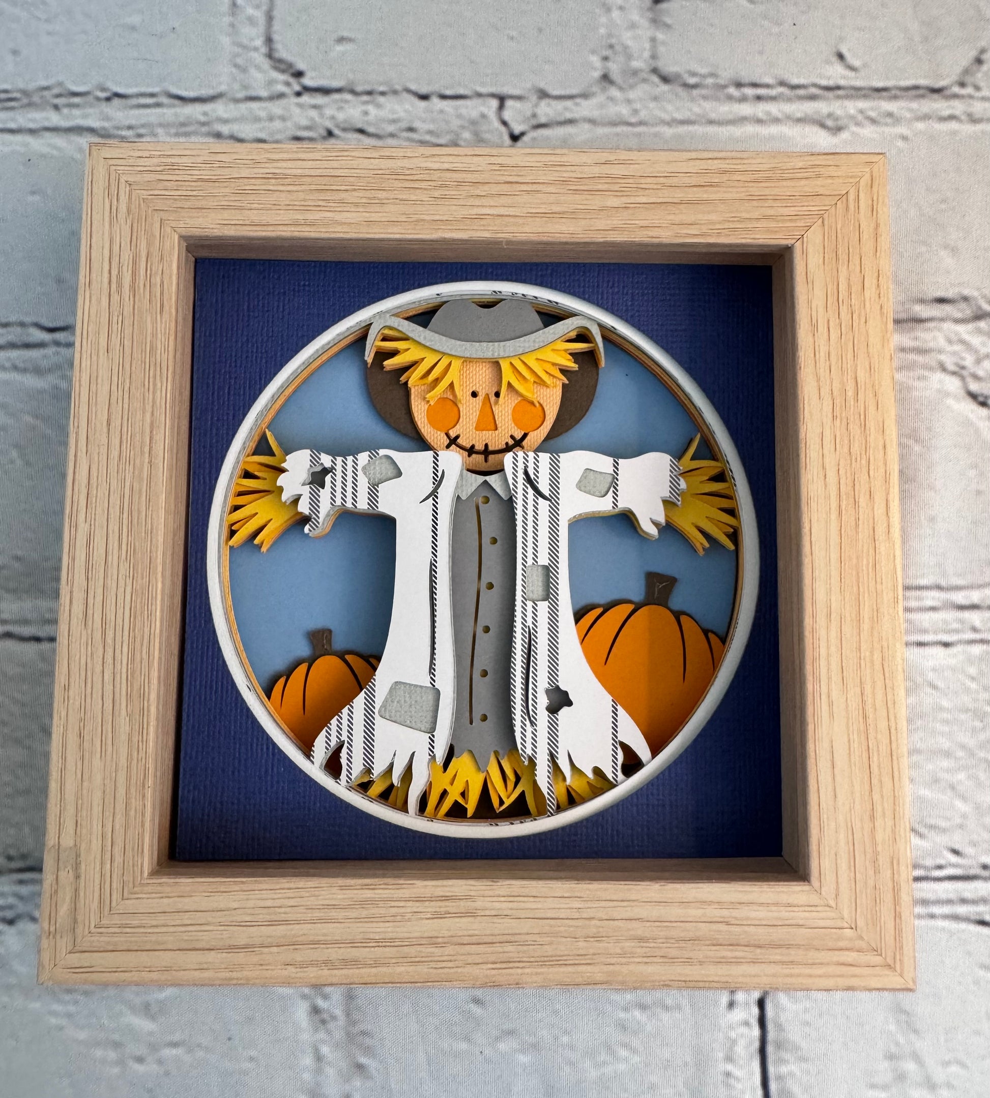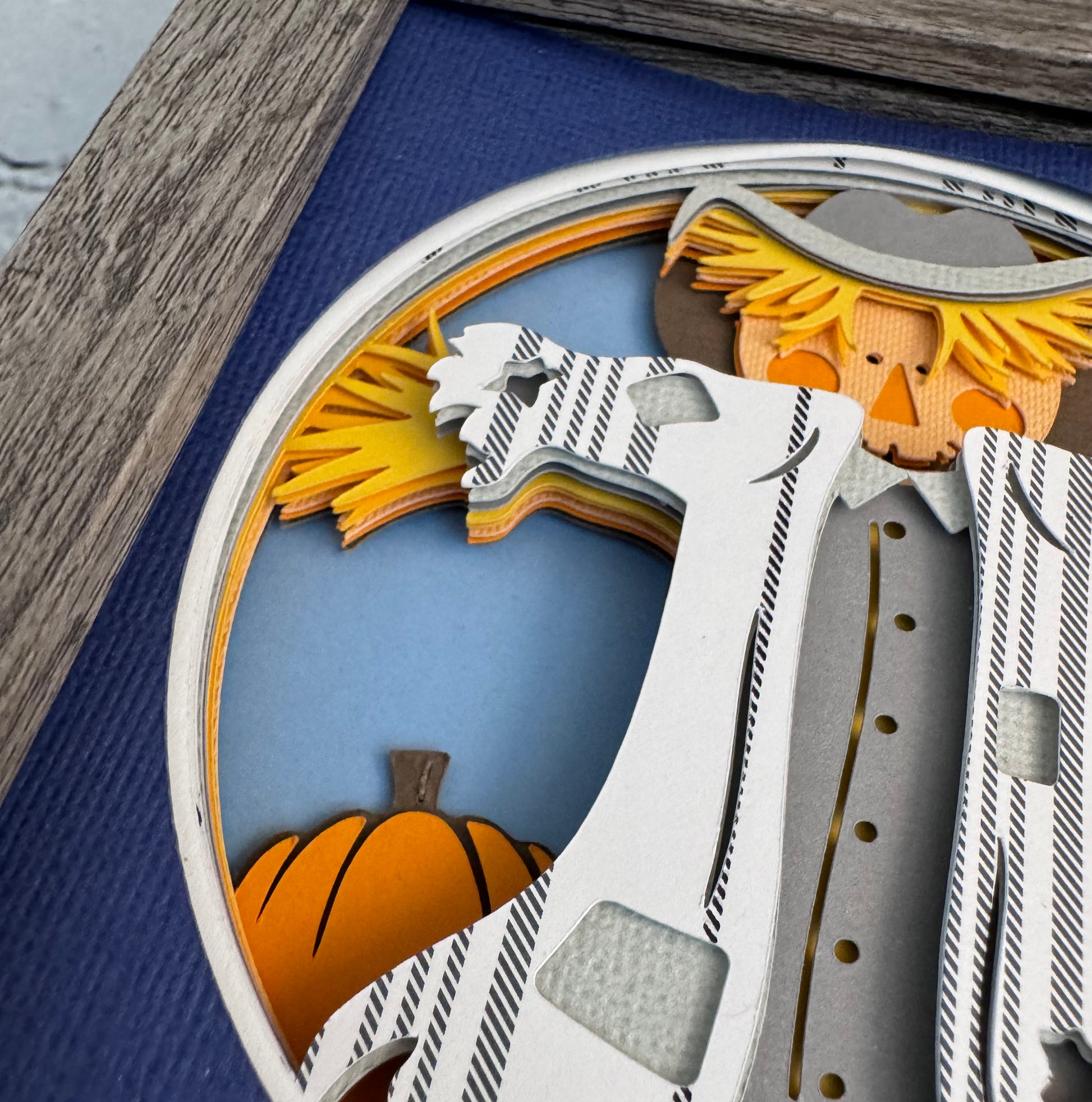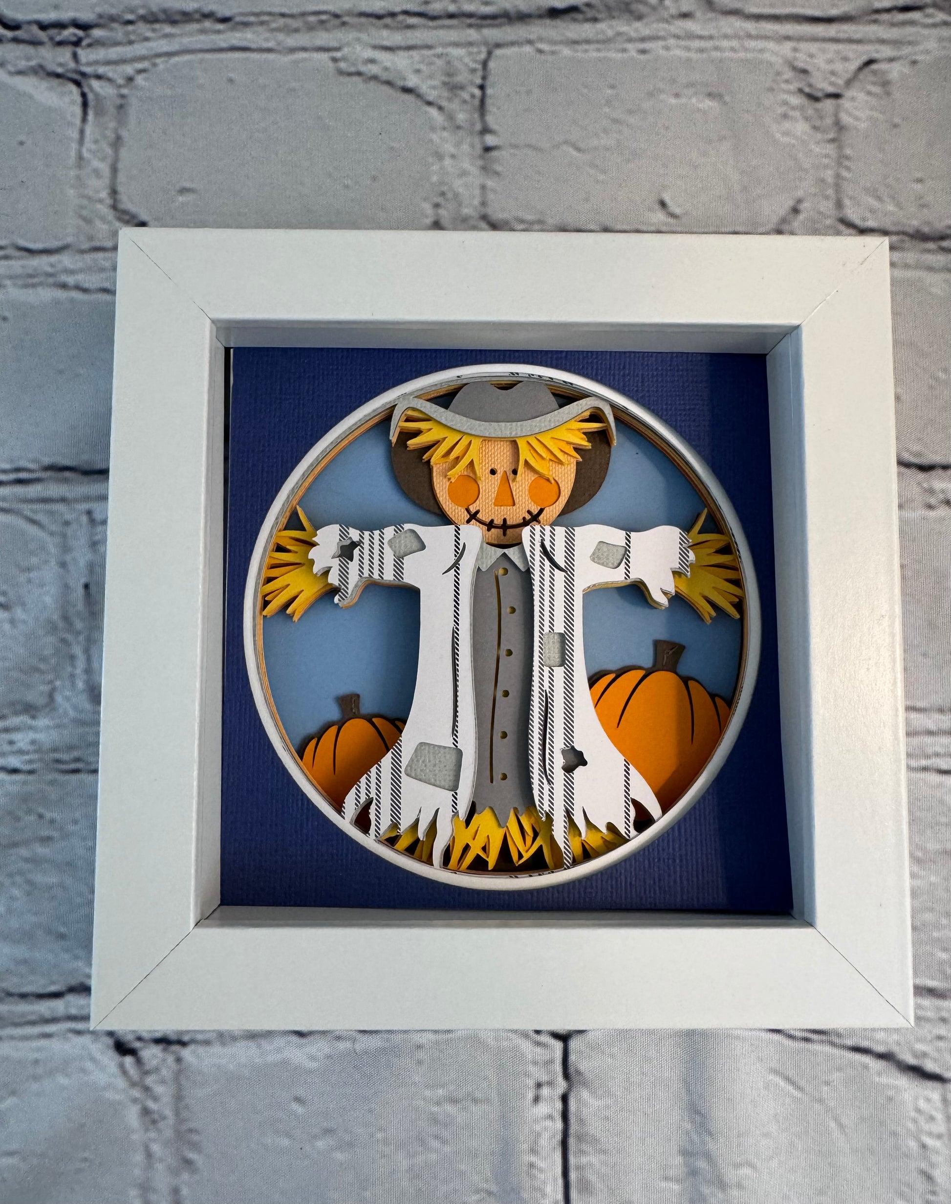 Multi-layered cardstock art. Cut and assembled by hand, this art has adhesive foam in between the layers to give it a 3-dimensional look. This listing is for the art in a 5”x5” shadowbox.