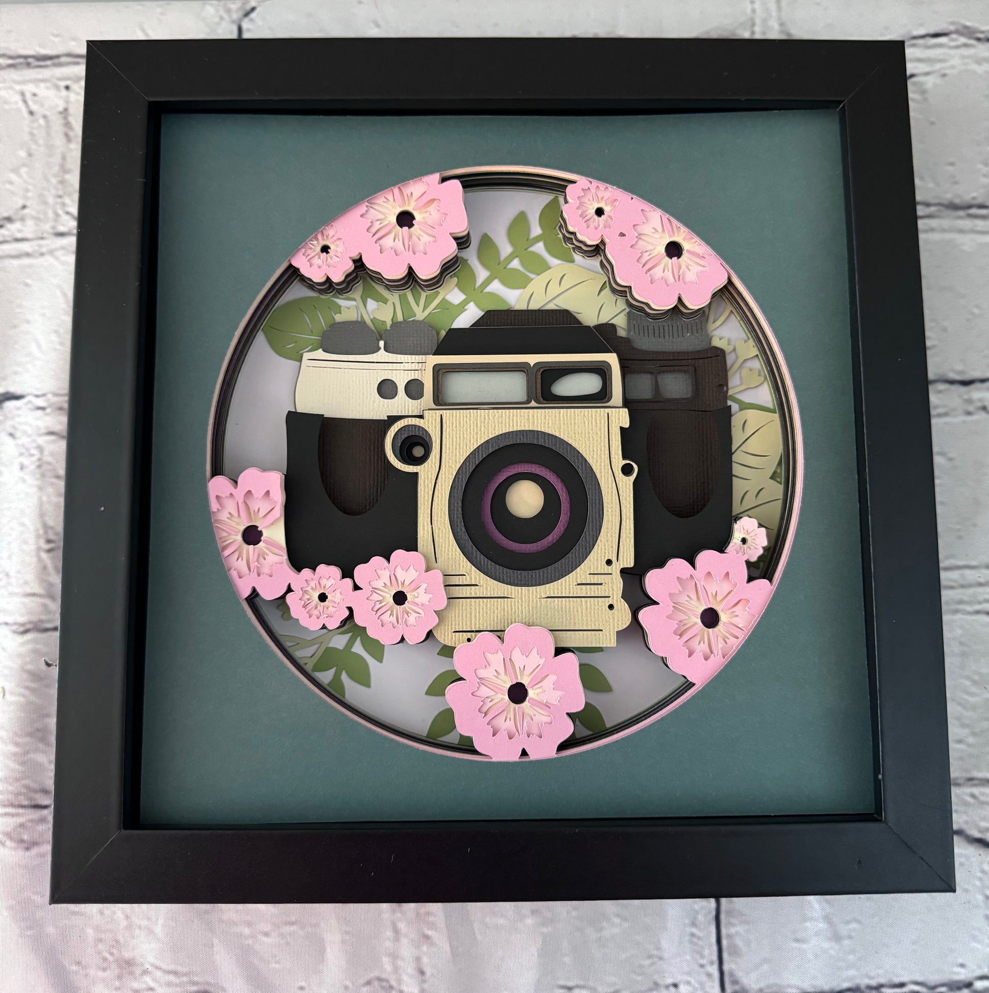 Multi-layered cardstock art. Cut and assembled by hand, this art has adhesive foam in between the layers to give it a 3-dimensional look. This listing is for the art in an 8”x8” shadowbox.
