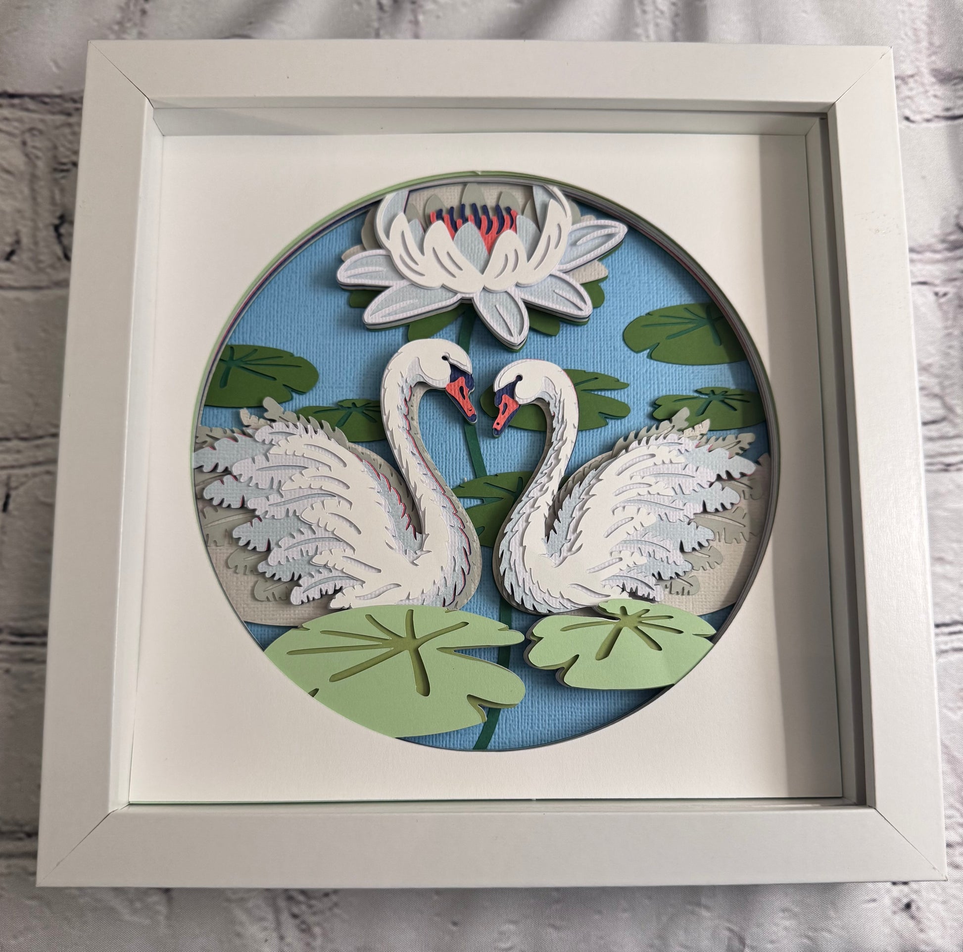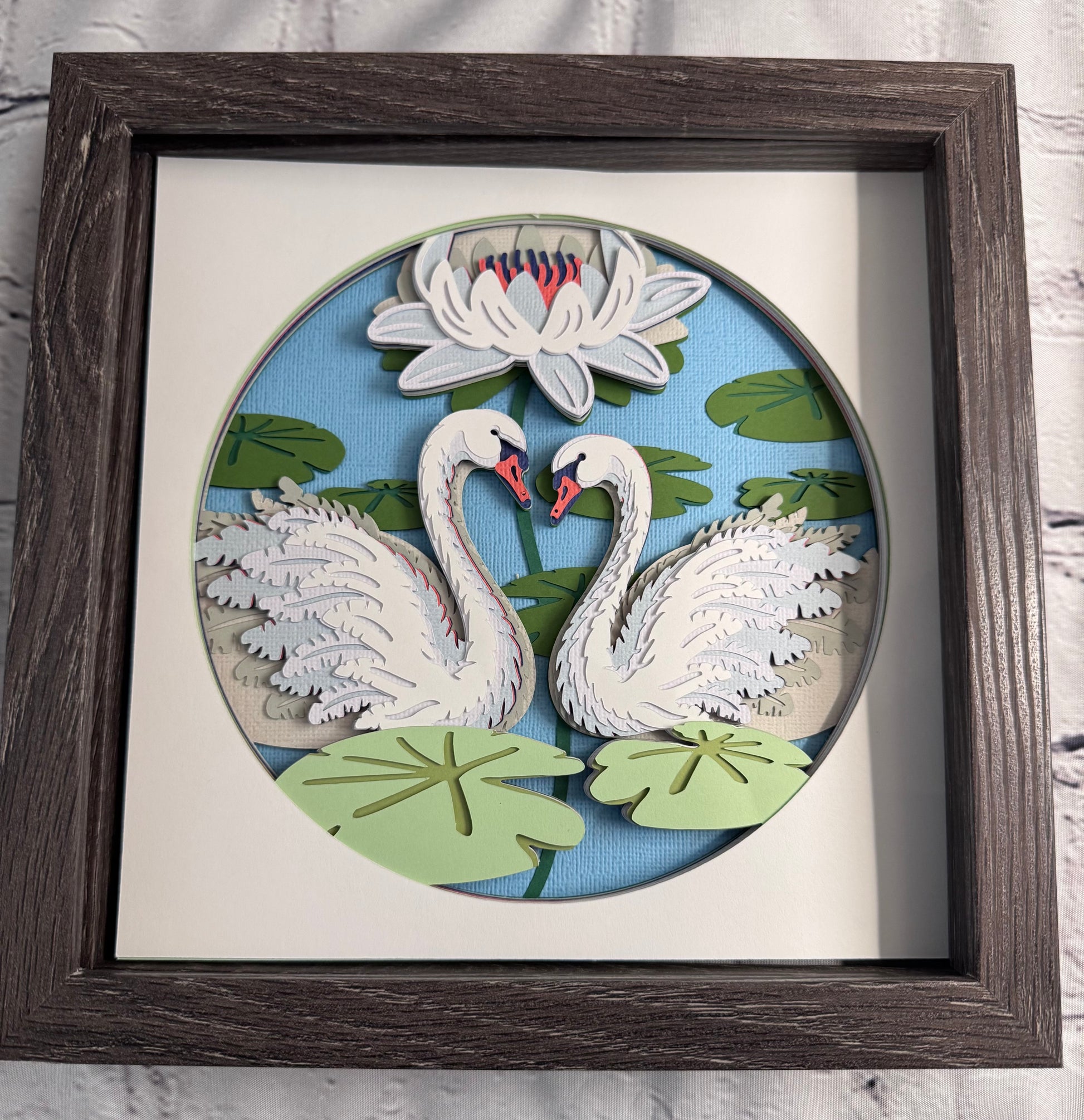 Multi-layered cardstock art. Cut and assembled by hand, this art has adhesive foam in between the layers to give it a 3-dimensional look. This listing is for the art in an 8”x8” shadowbox.