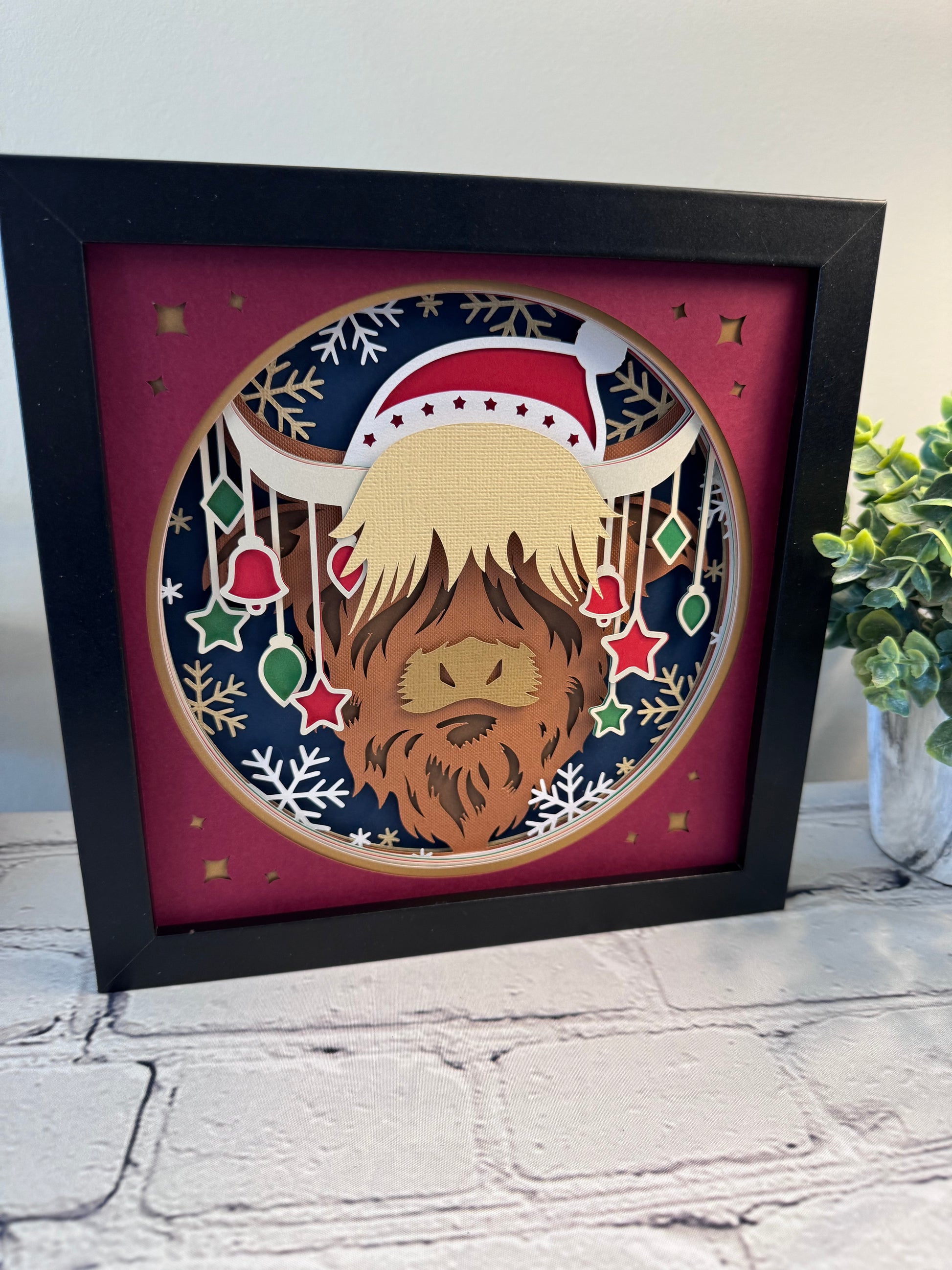 Christmas highland cow with ornaments 3D paper art shadowbox