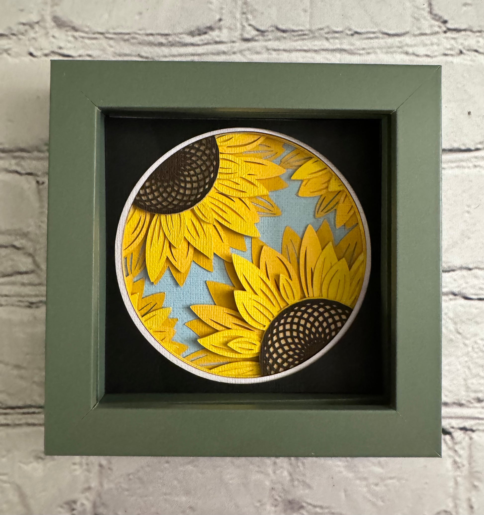 Multi-layered cardstock art. Cut and assembled by hand, this art has adhesive foam in between the layers to give it a 3-dimensional look. This listing is for the art in an 5”x5” shadowbox.