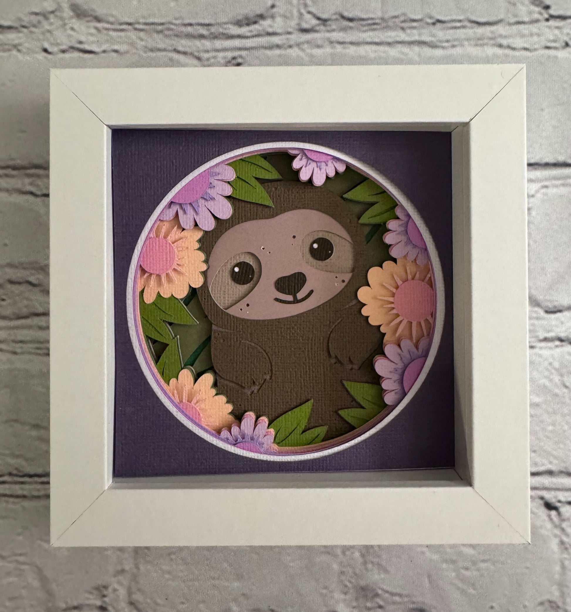 Multi-layered cardstock art. Cut and assembled by hand, this art has adhesive foam in between the layers to give it a 3-dimensional look. This listing is for the art in an 5”x5” shadowbox.