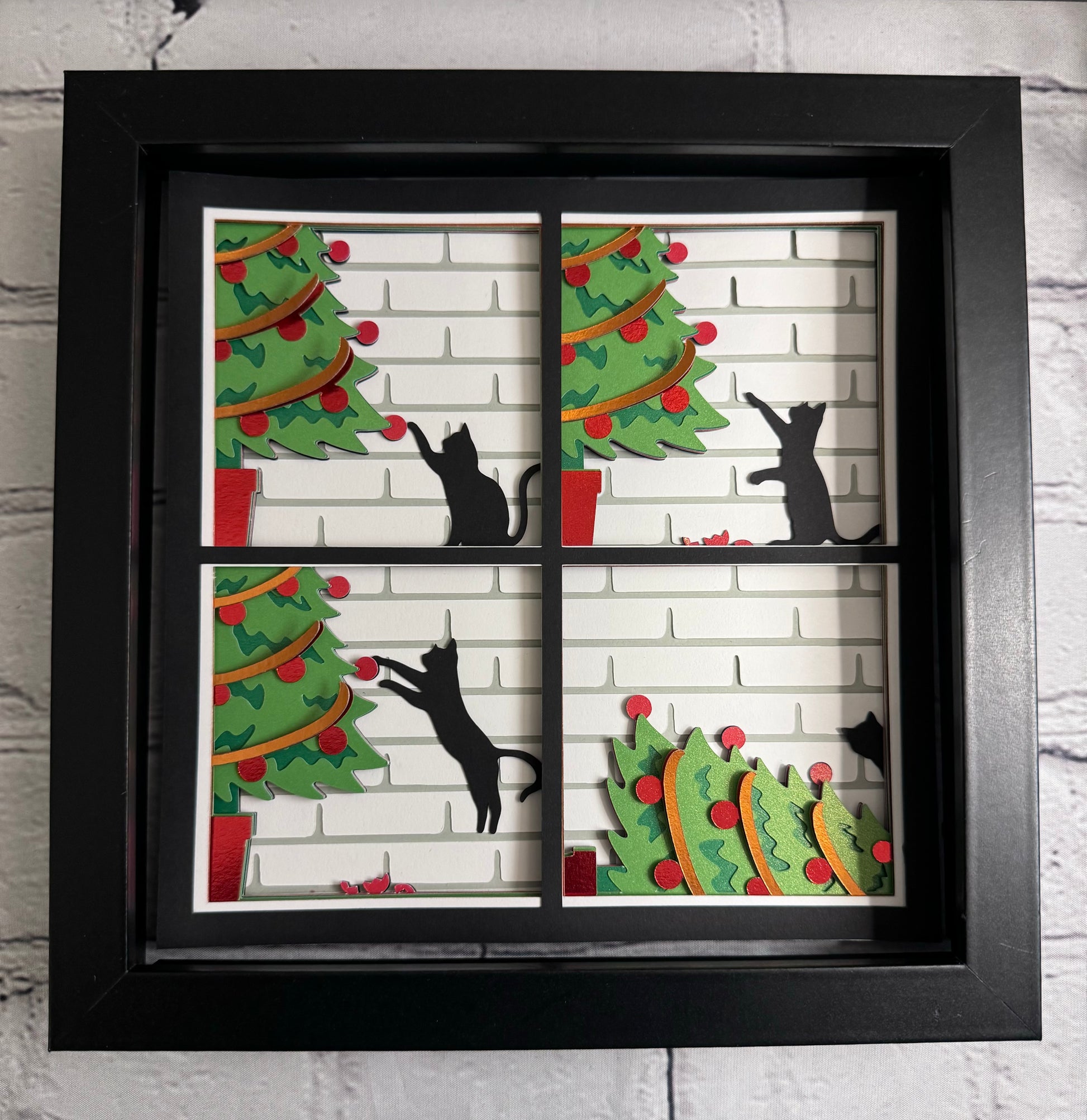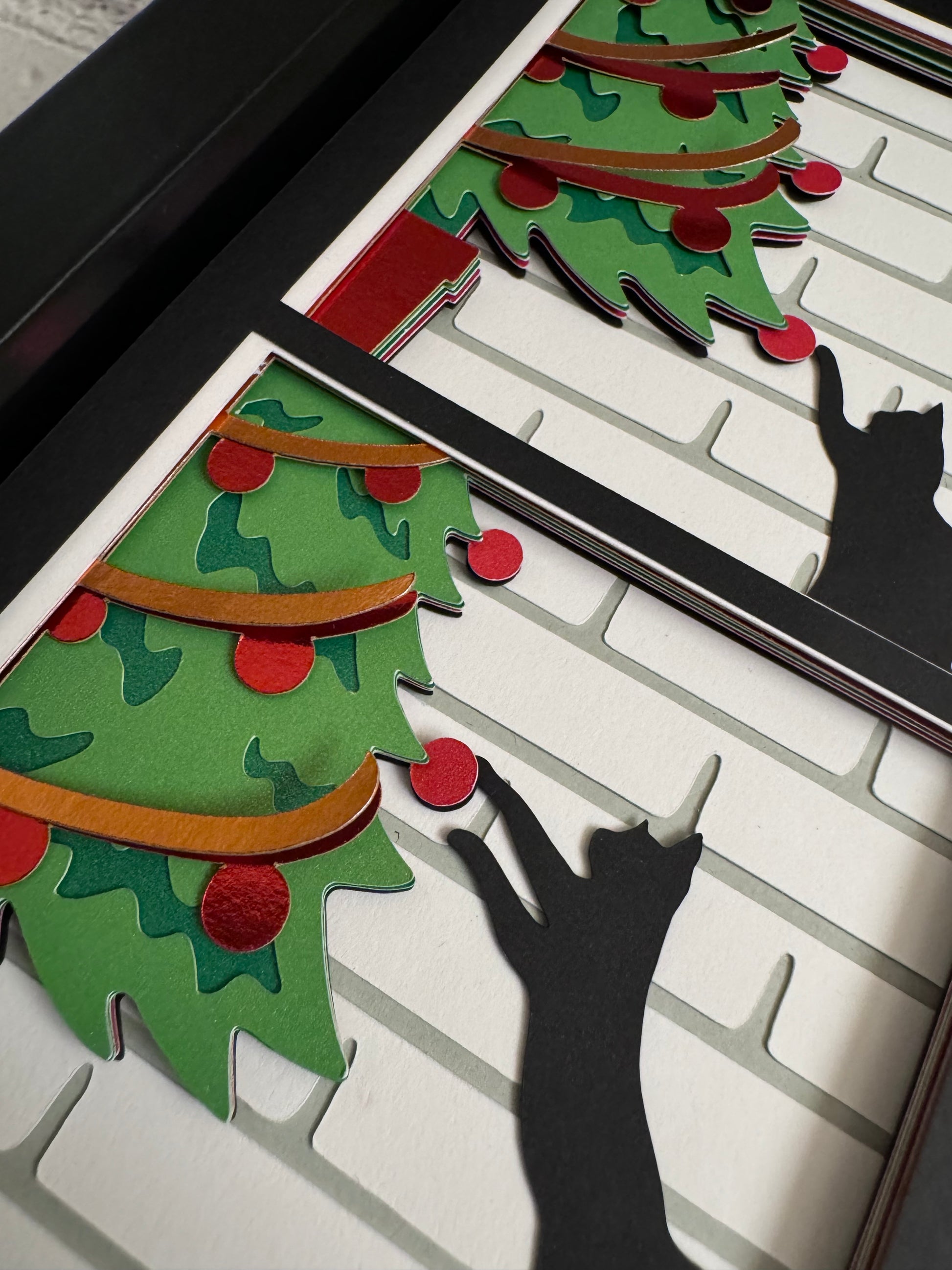 Crazy cat with Christmas tree mini 3D paper art shadowbox