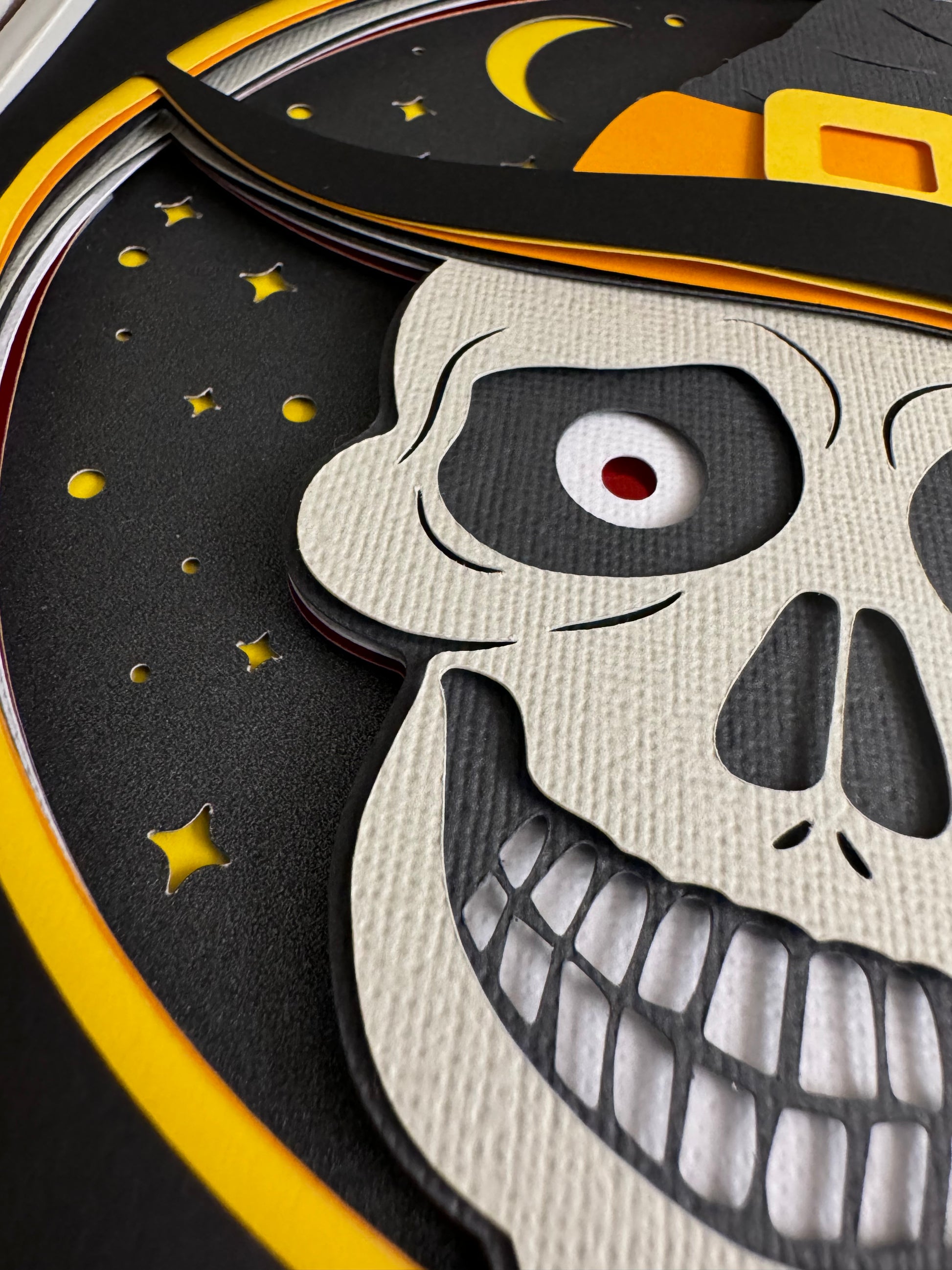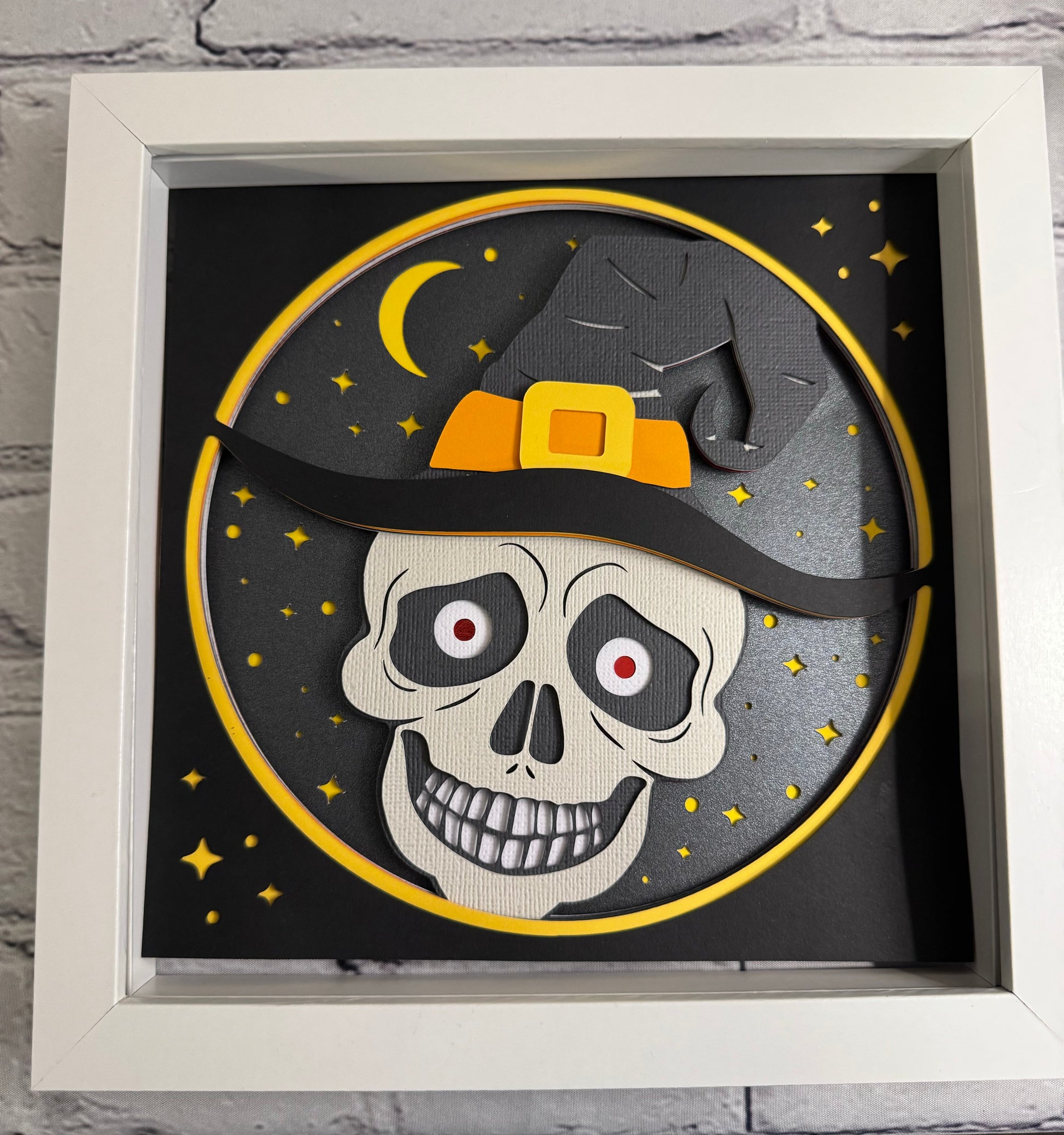 Multi-layered cardstock art. Cut and assembled by hand, this art has adhesive foam in between the layers to give it a 3-dimensional look. This listing is for the art in an 8”x8” shadowbox.