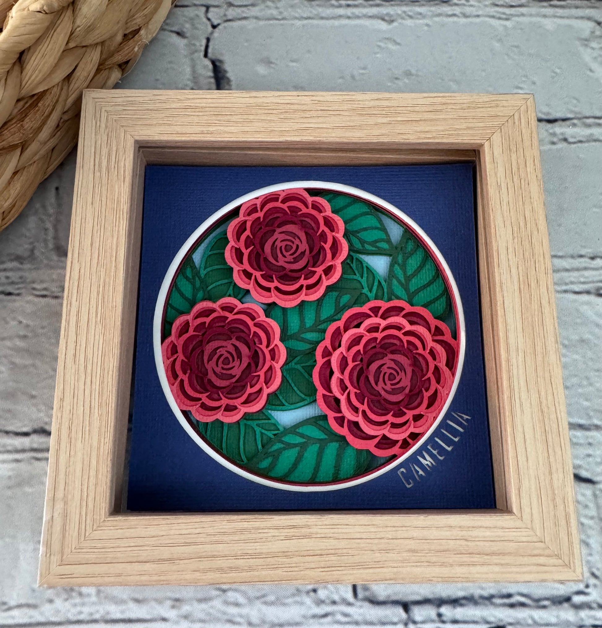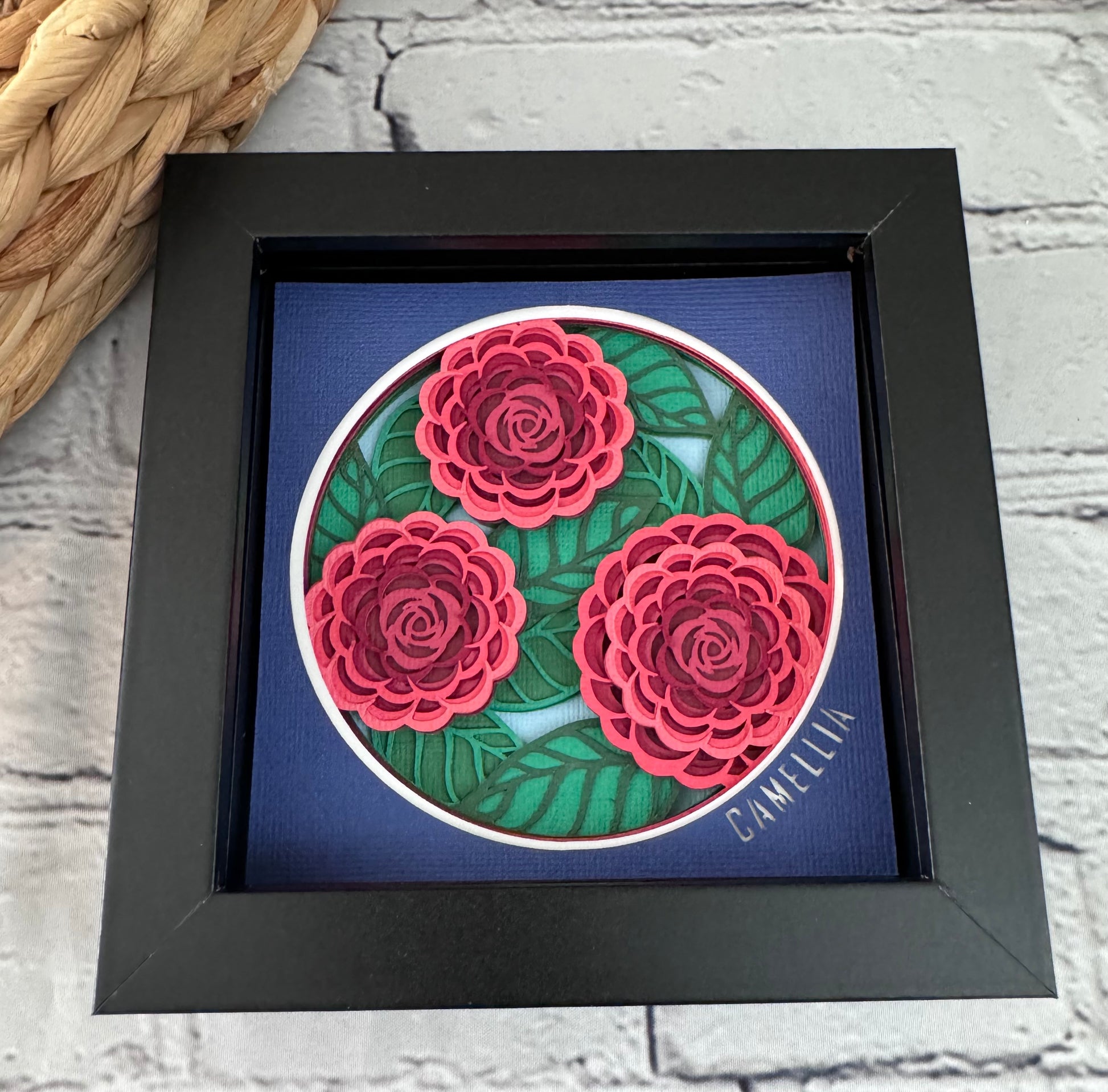 Multi-layered cardstock art. Cut and assembled by hand, this art has adhesive foam in between the layers to give it a 3-dimensional look. This listing is for the art in a 5”x5” shadowbox.