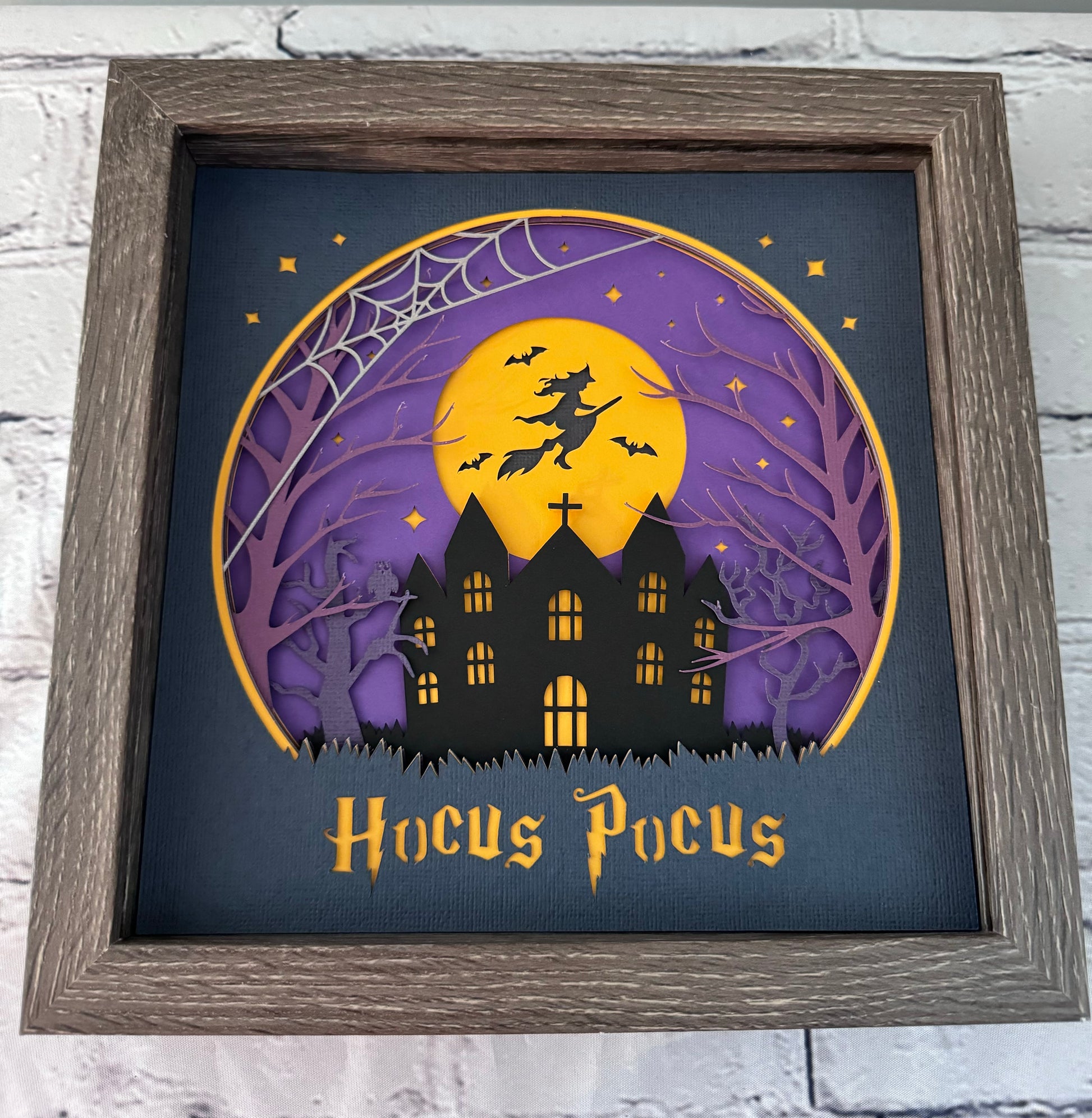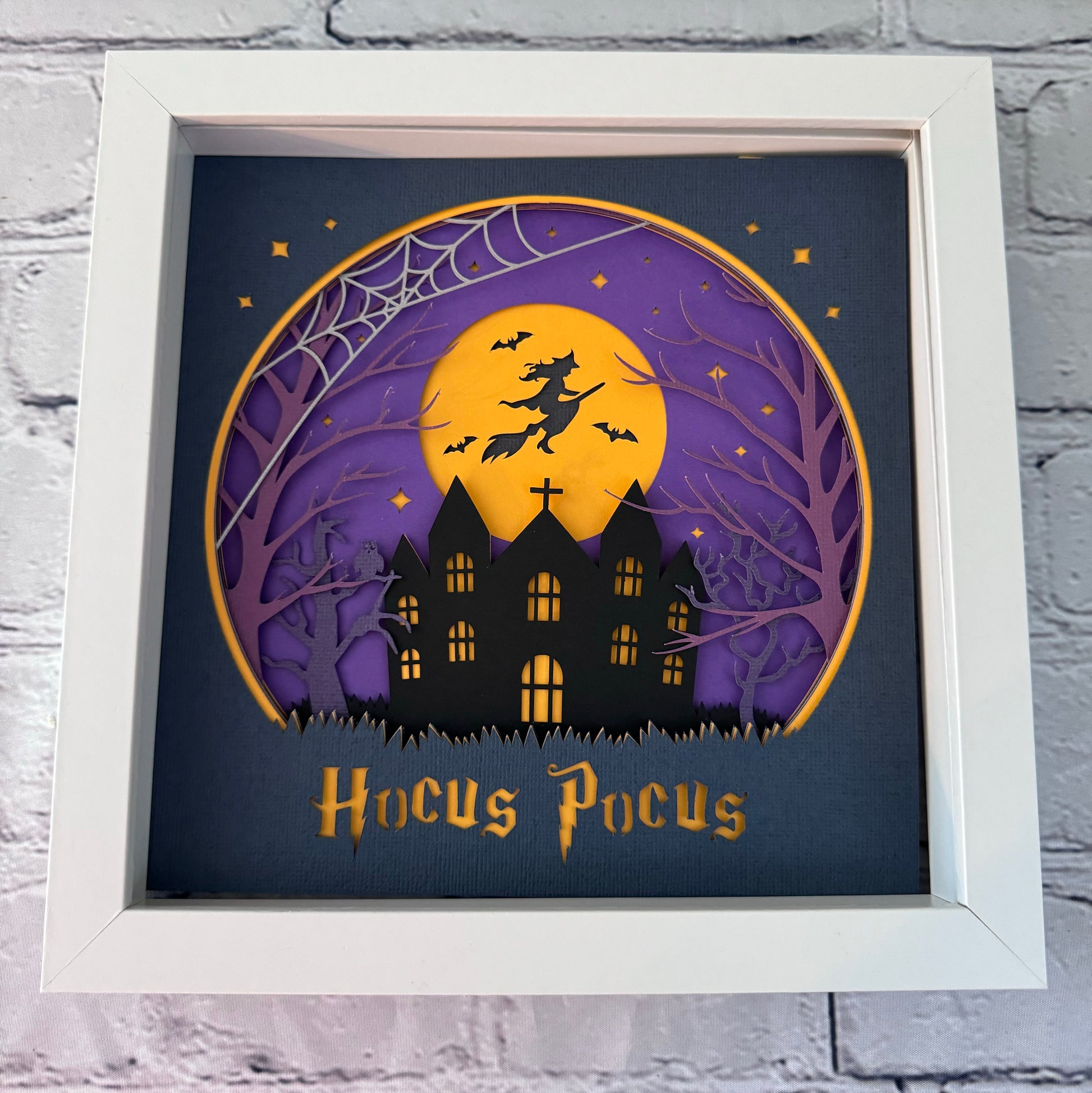 Purple hocus pocus witch flying design 3D paper art in a shadowbox
