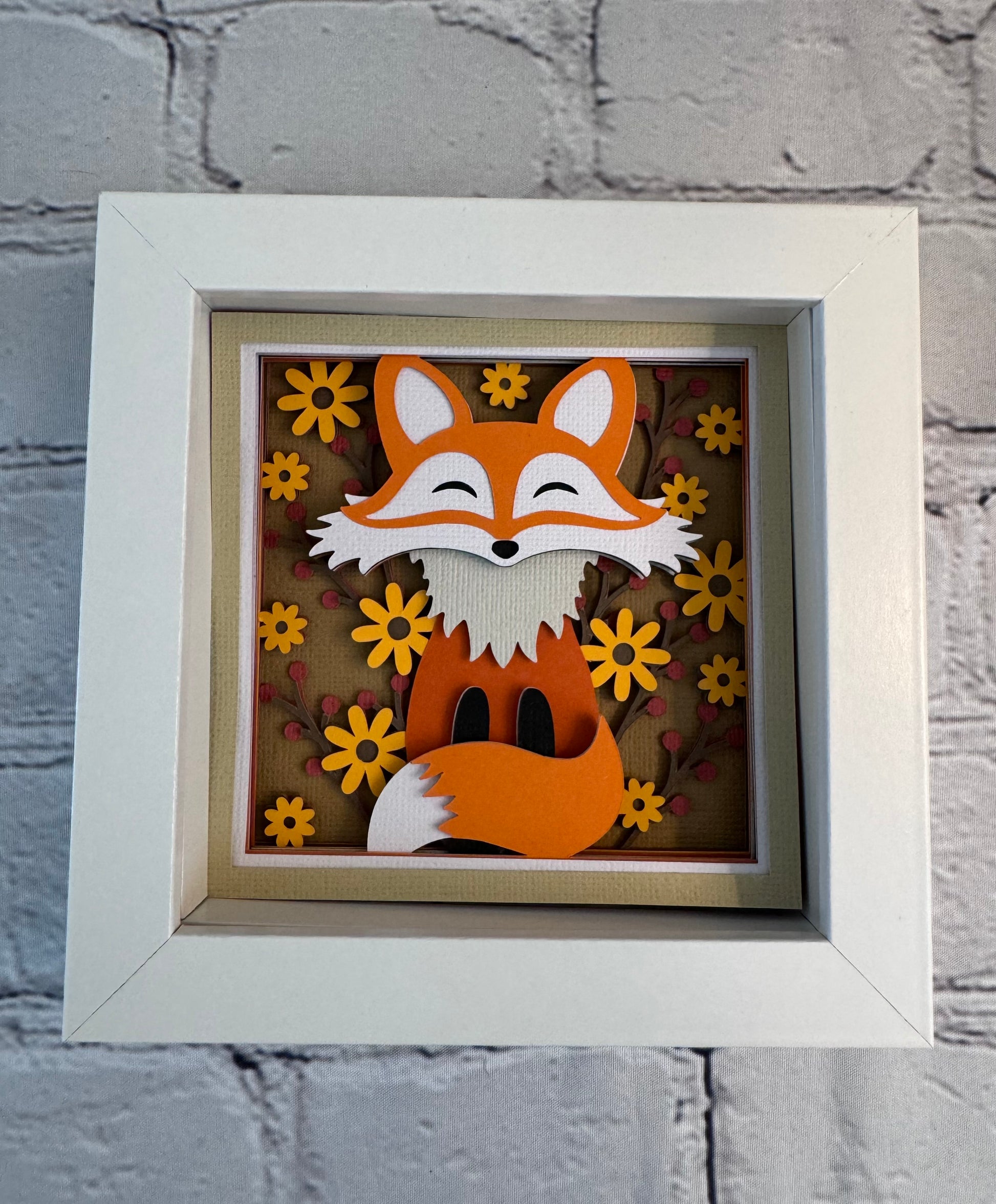 Multi-layered cardstock art. Cut and assembled by hand, this art has adhesive foam in between the layers to give it a 3-dimensional look. This listing is for the art in a 5”x5” shadowbox.