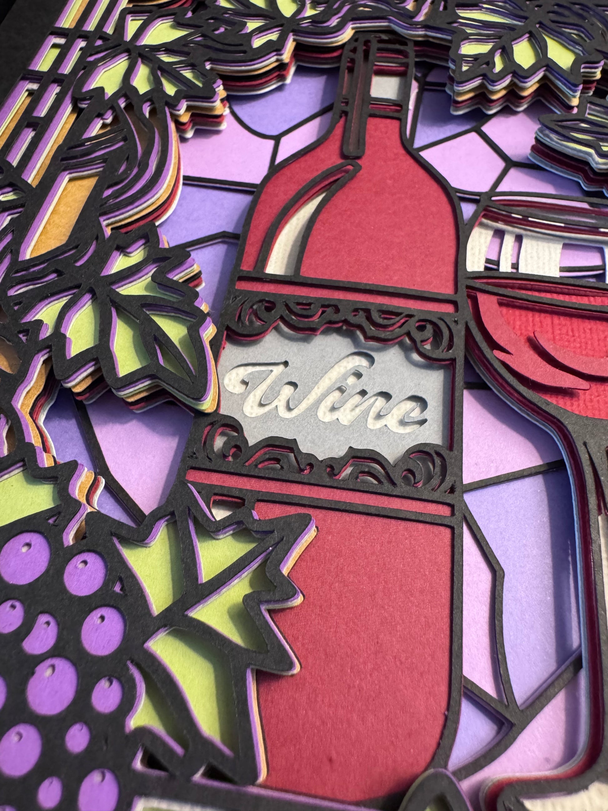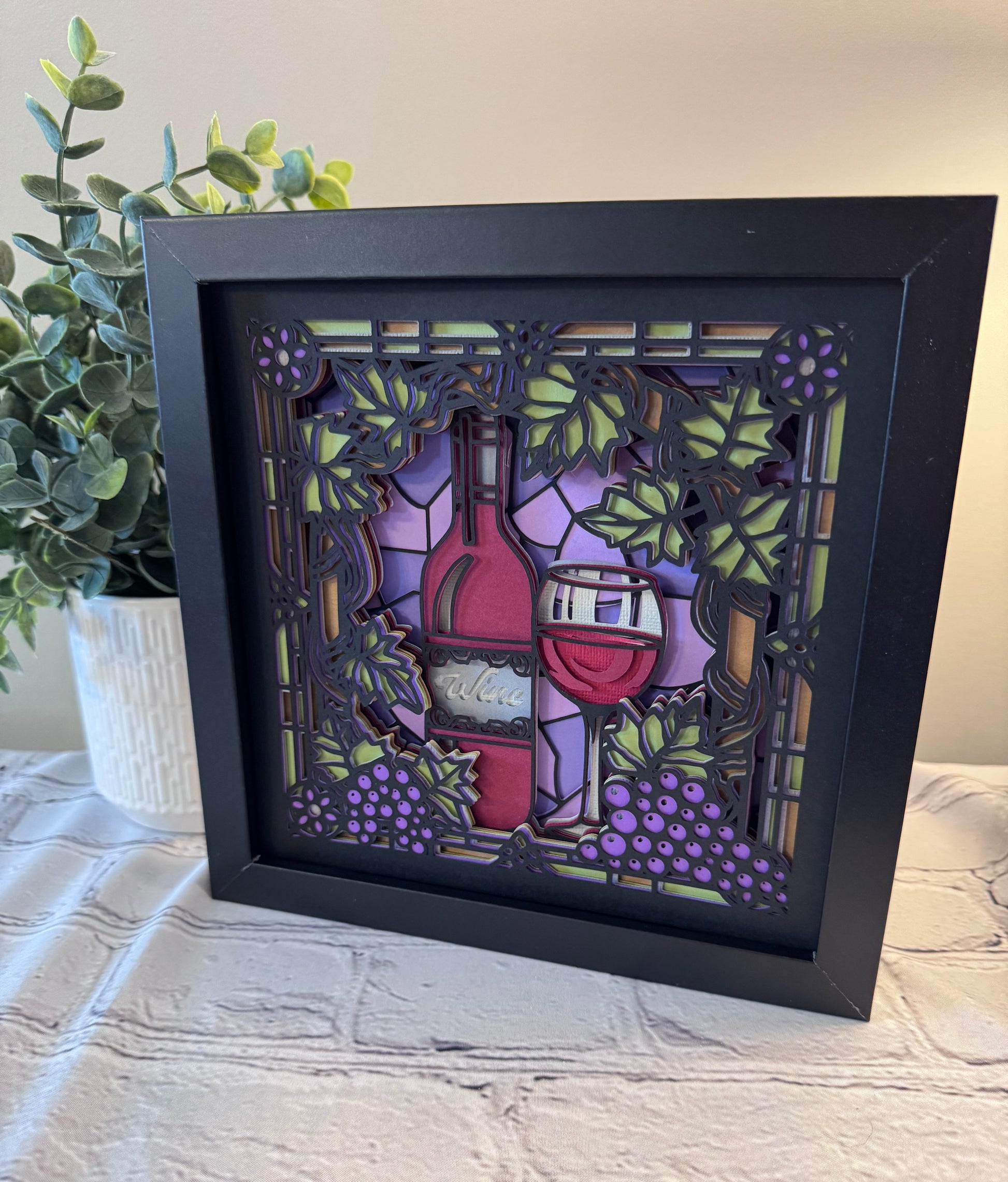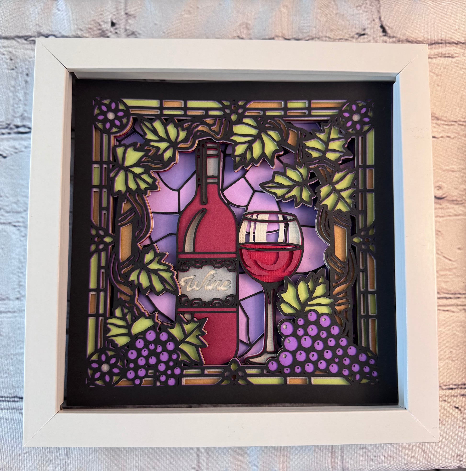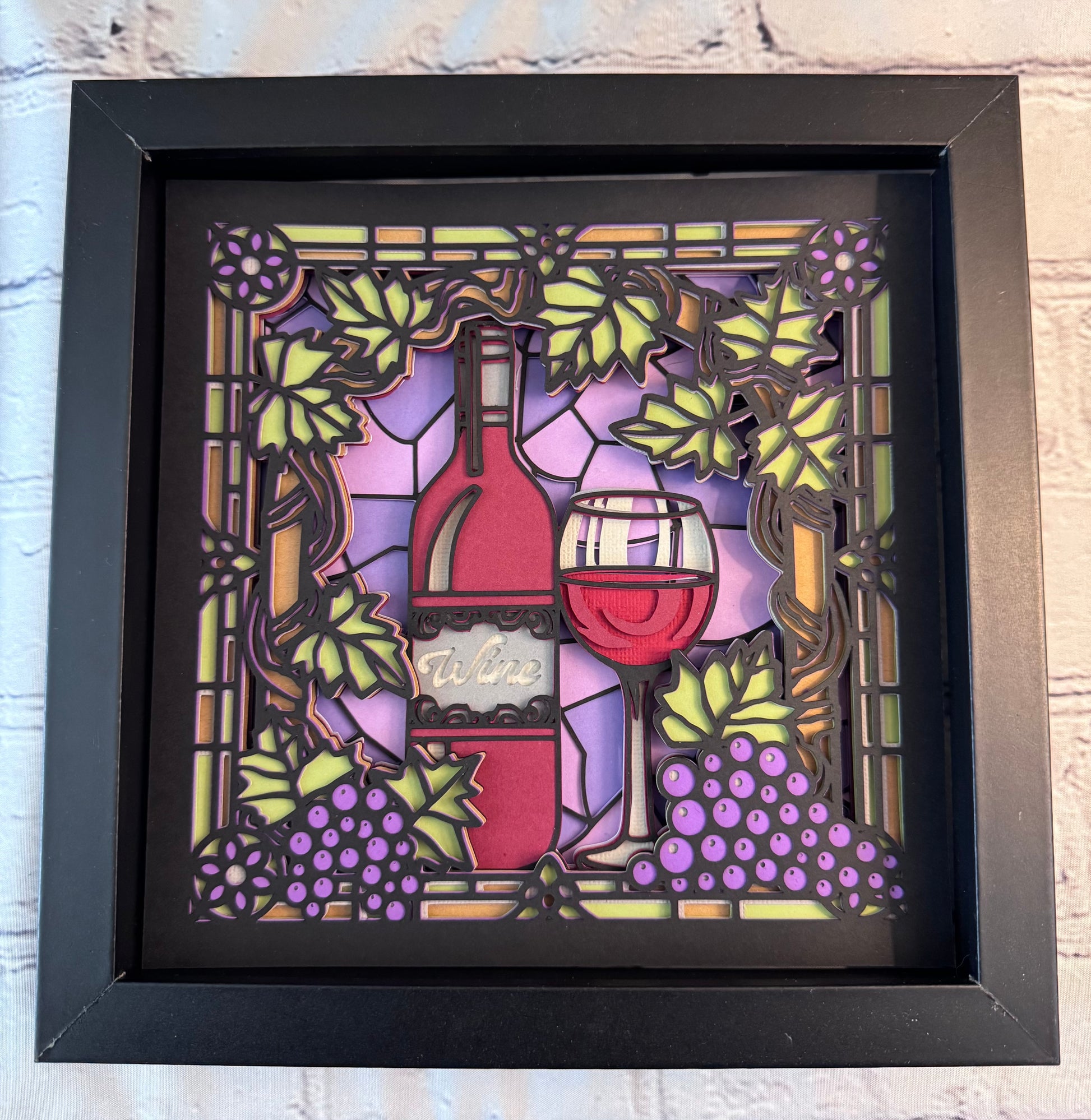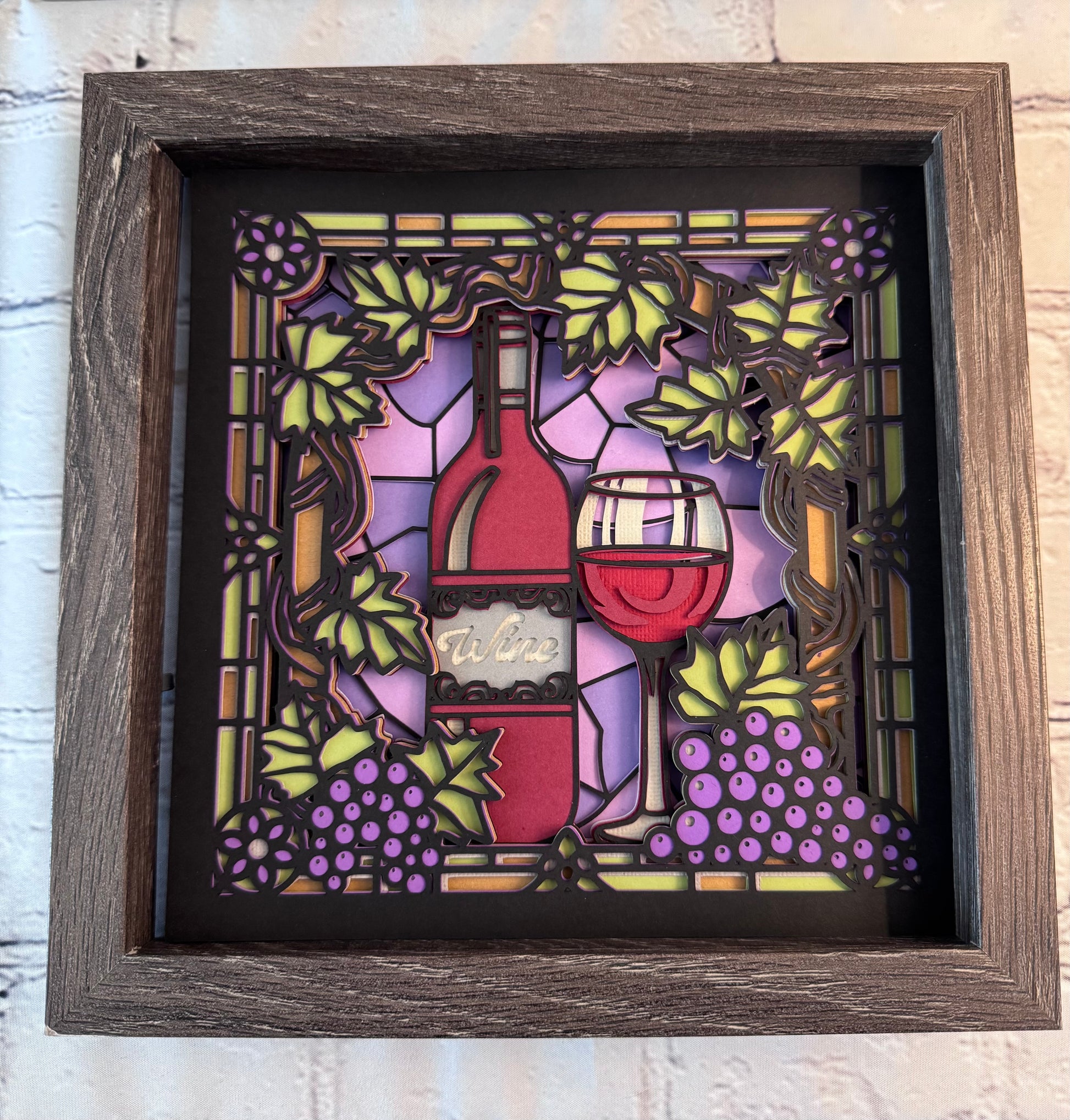 Multi-layered cardstock art. Cut and assembled by hand, this art has adhesive foam in between the layers to give it a 3-dimensional look. This listing is for the art in an 8”x8” shadowbox.