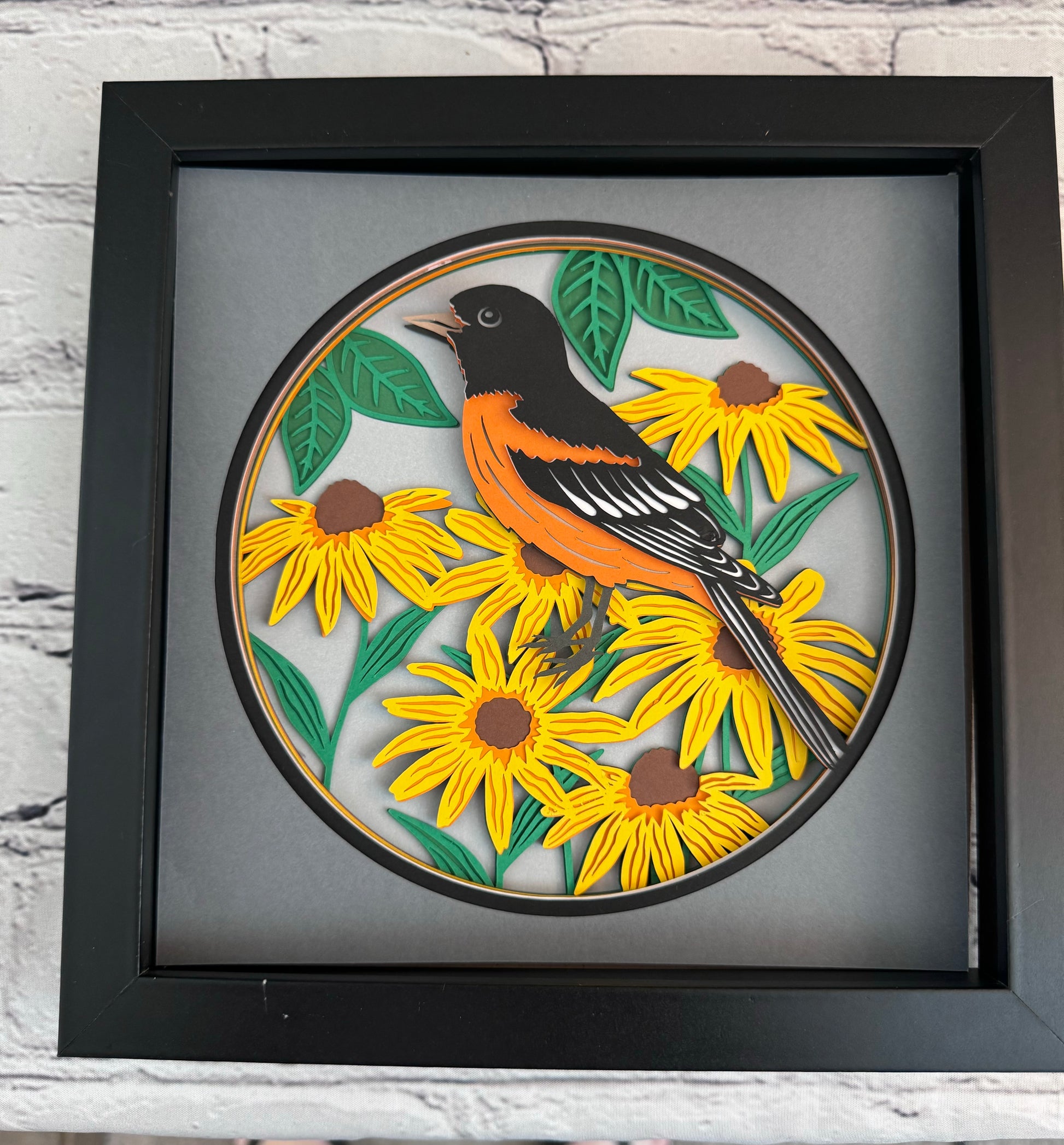 Baltimore oriole Maryland state bird 3D paper art in a shadowbox