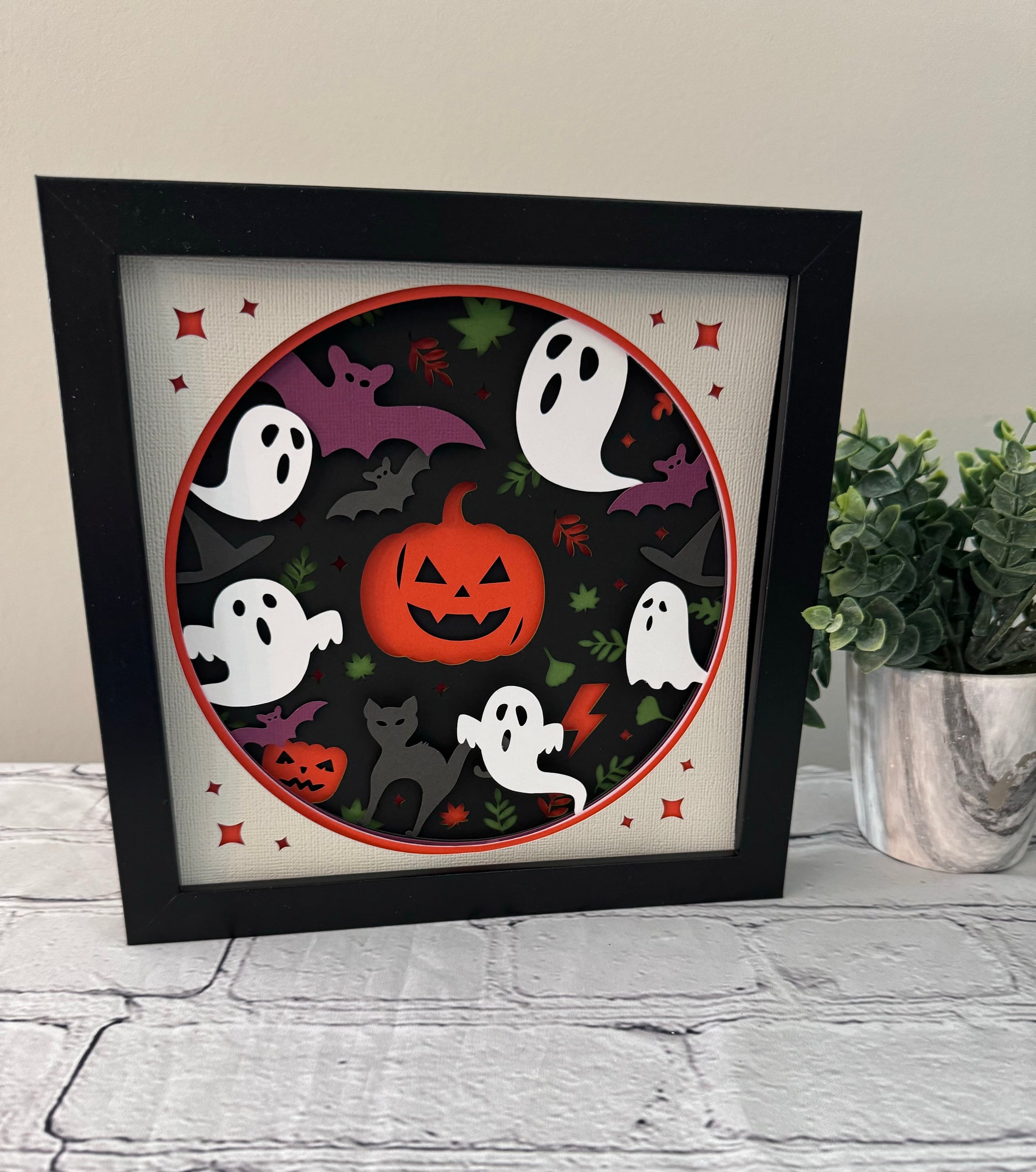 Pumpkin, ghost and bats design 3D paper art in a shadowbox