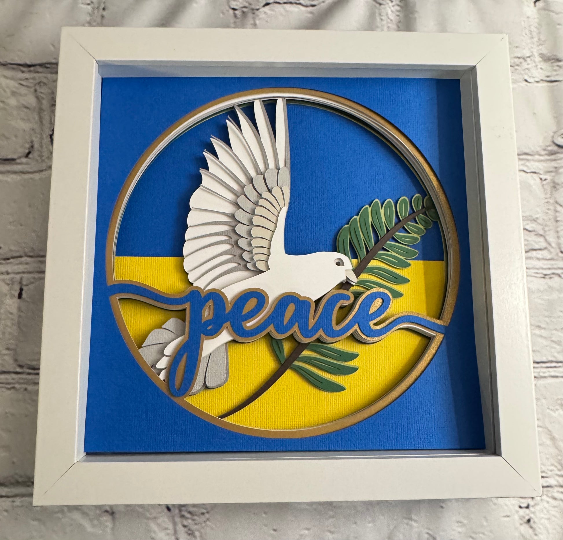 Multi-layered cardstock art. Cut and assembled by hand, this art has adhesive foam in between the layers to give it a 3-dimensional look. This listing is for the art in an 8”x8” shadowbox.