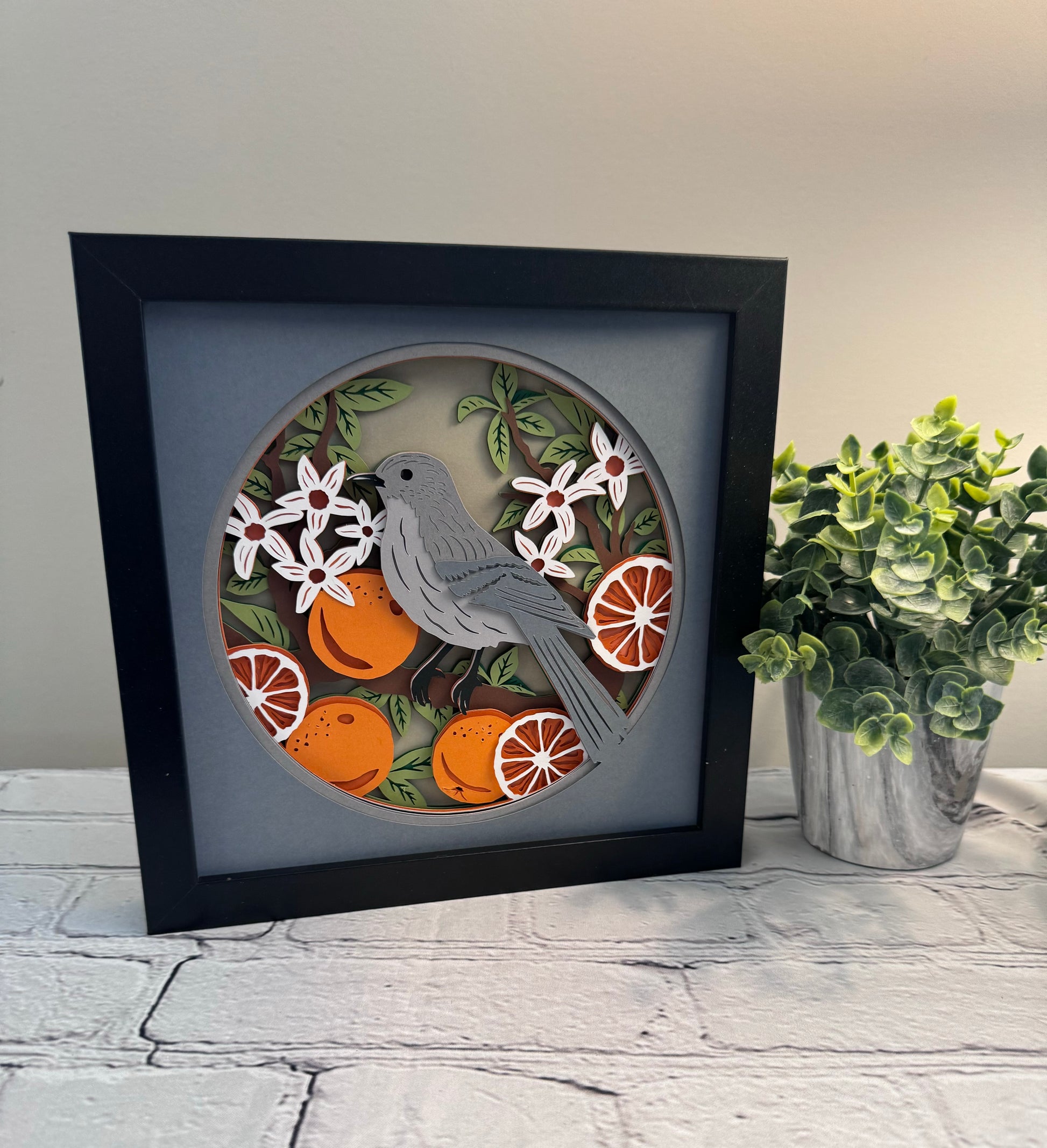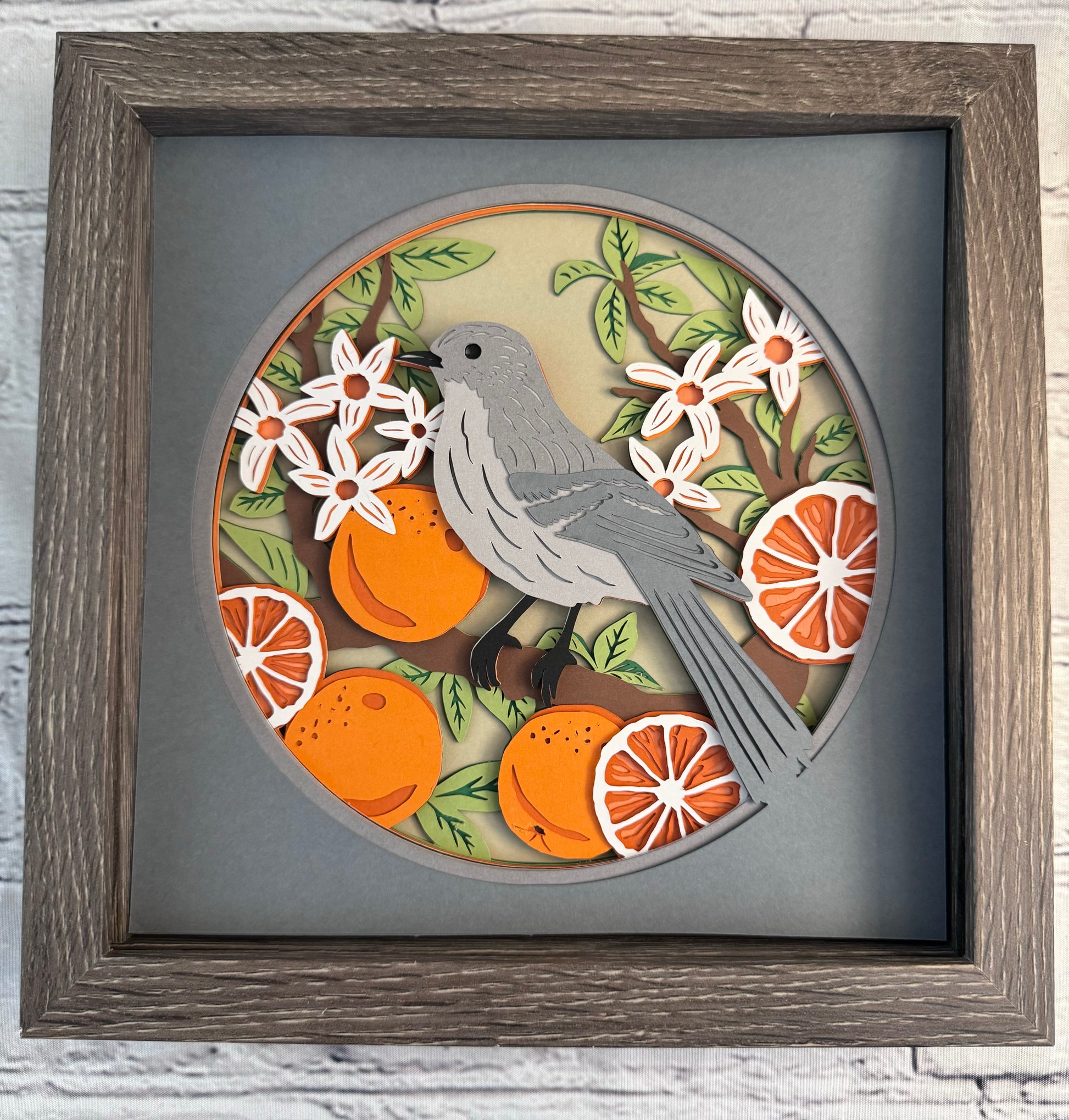 Mockingbird with oranges, Florida state bird 3D paper art in a shadowbox