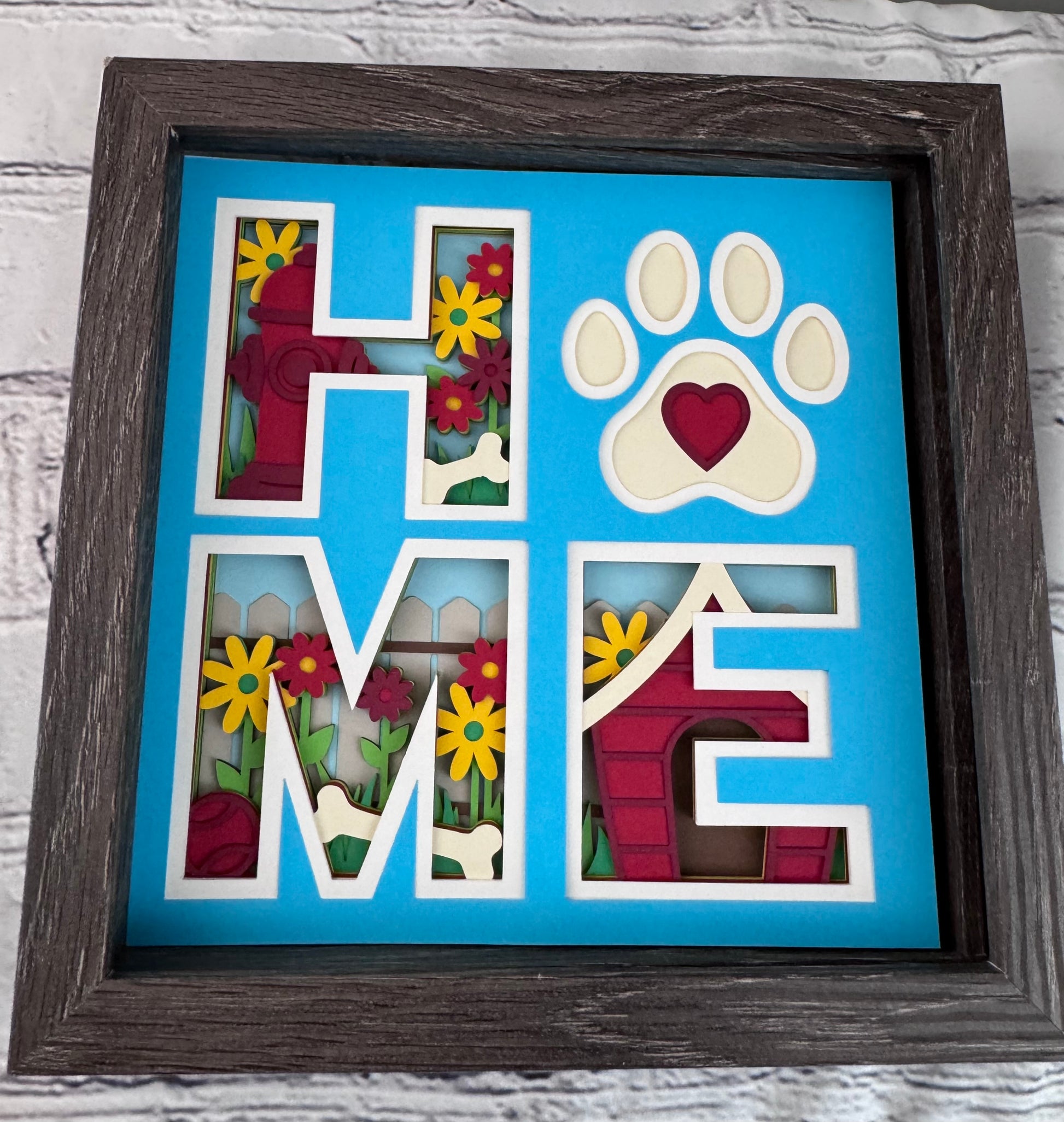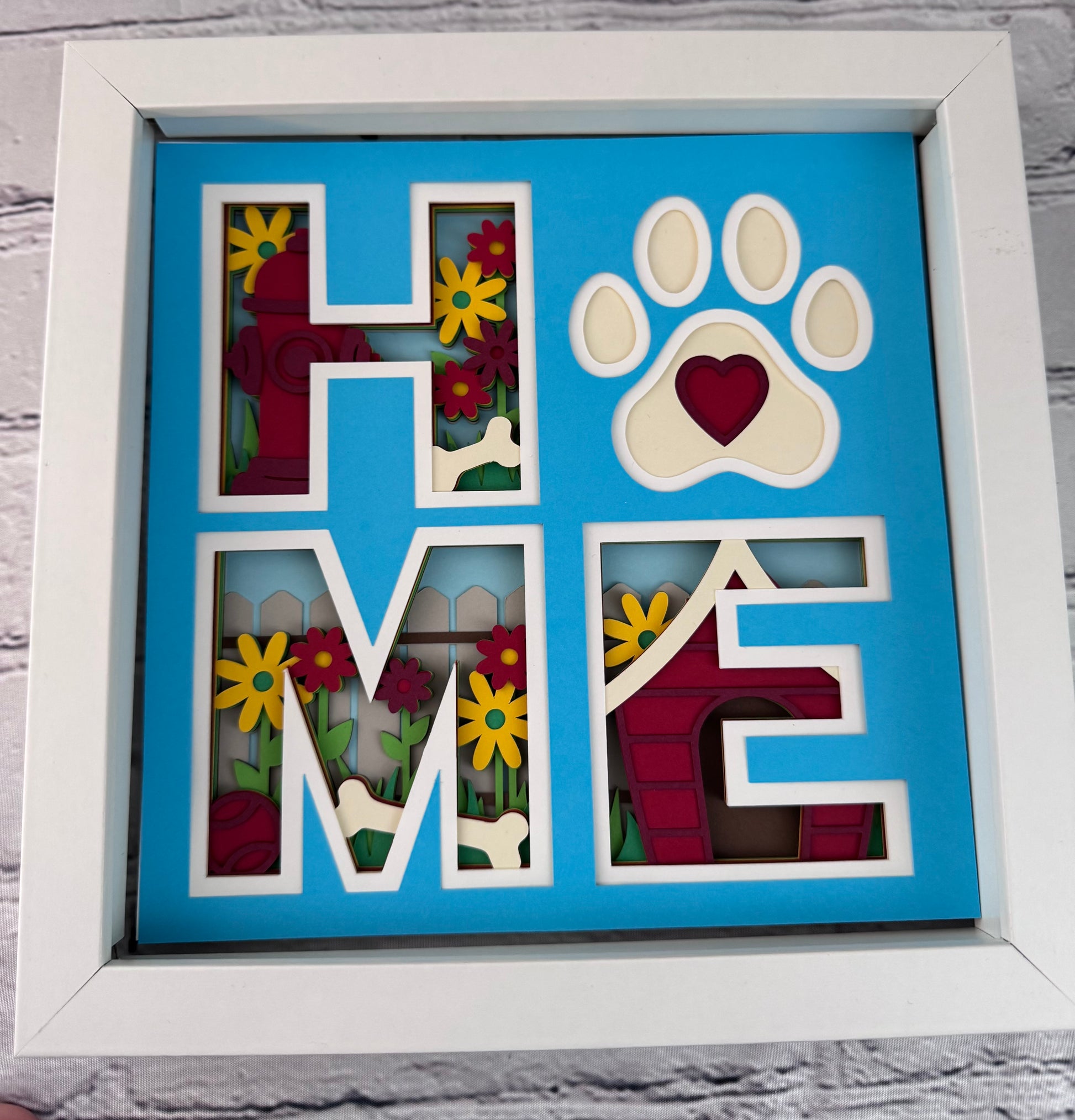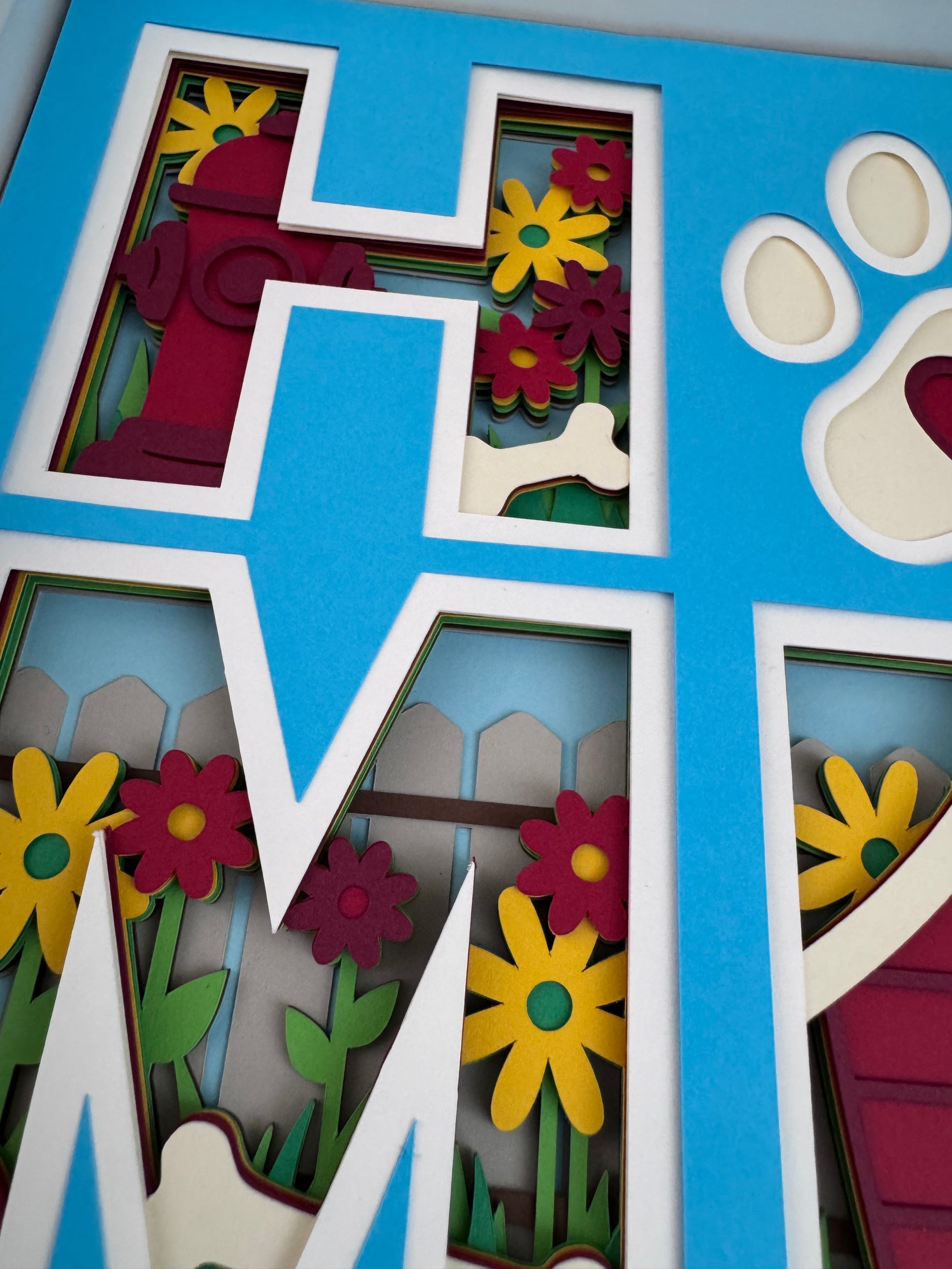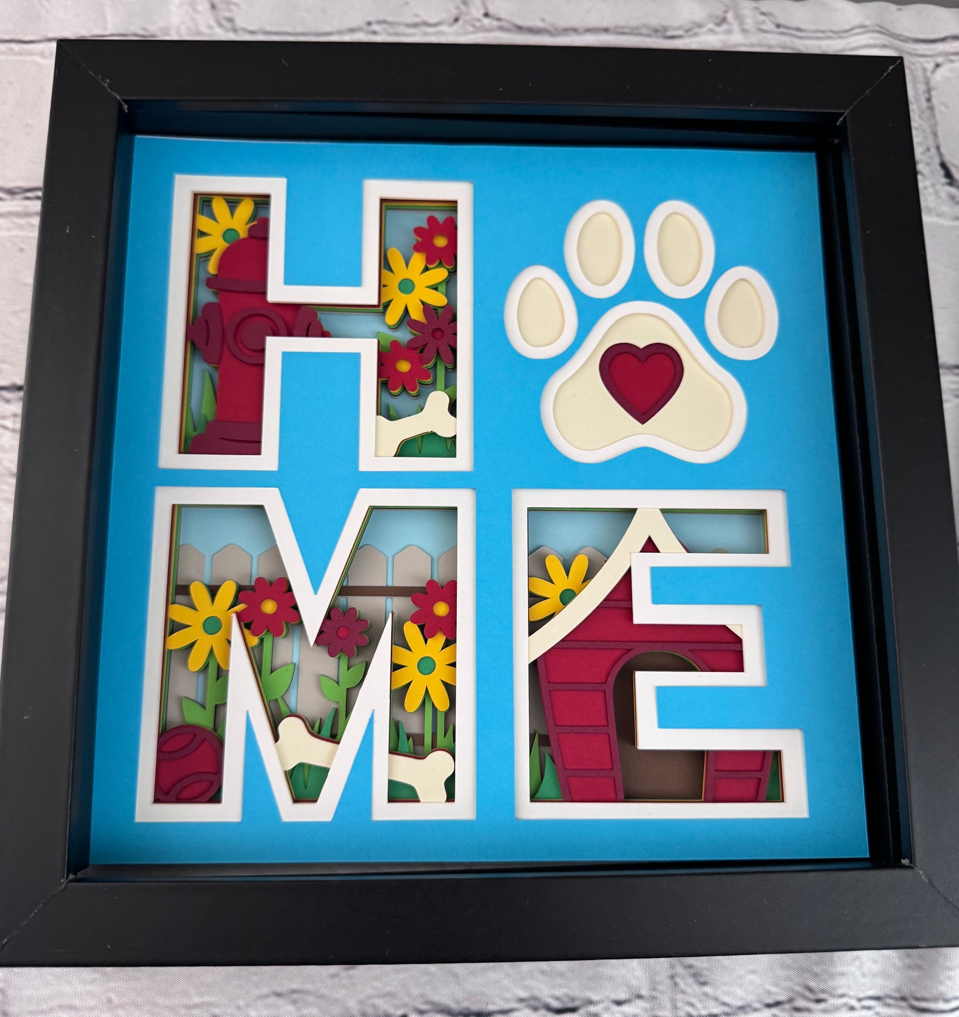 Multi-layered cardstock art. Cut and assembled by hand, this art has adhesive foam in between the layers to give it a 3-dimensional look. This listing is for the art in an 8”x8” shadowbox.
