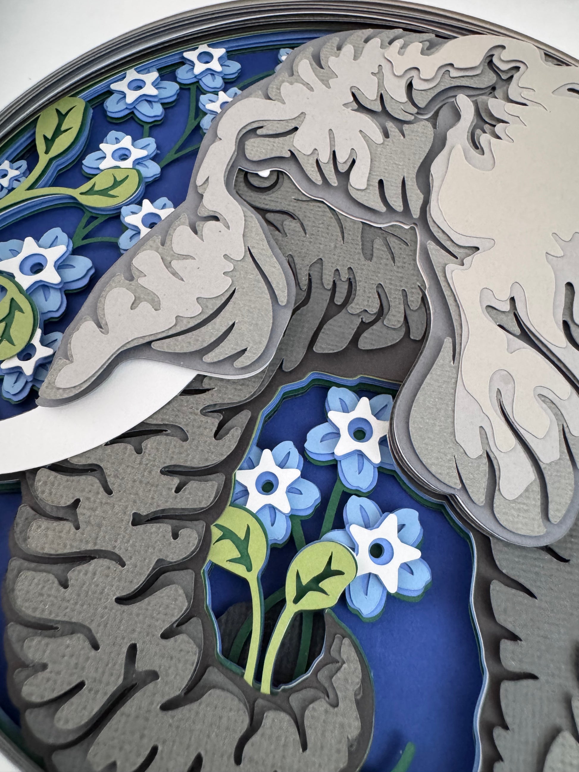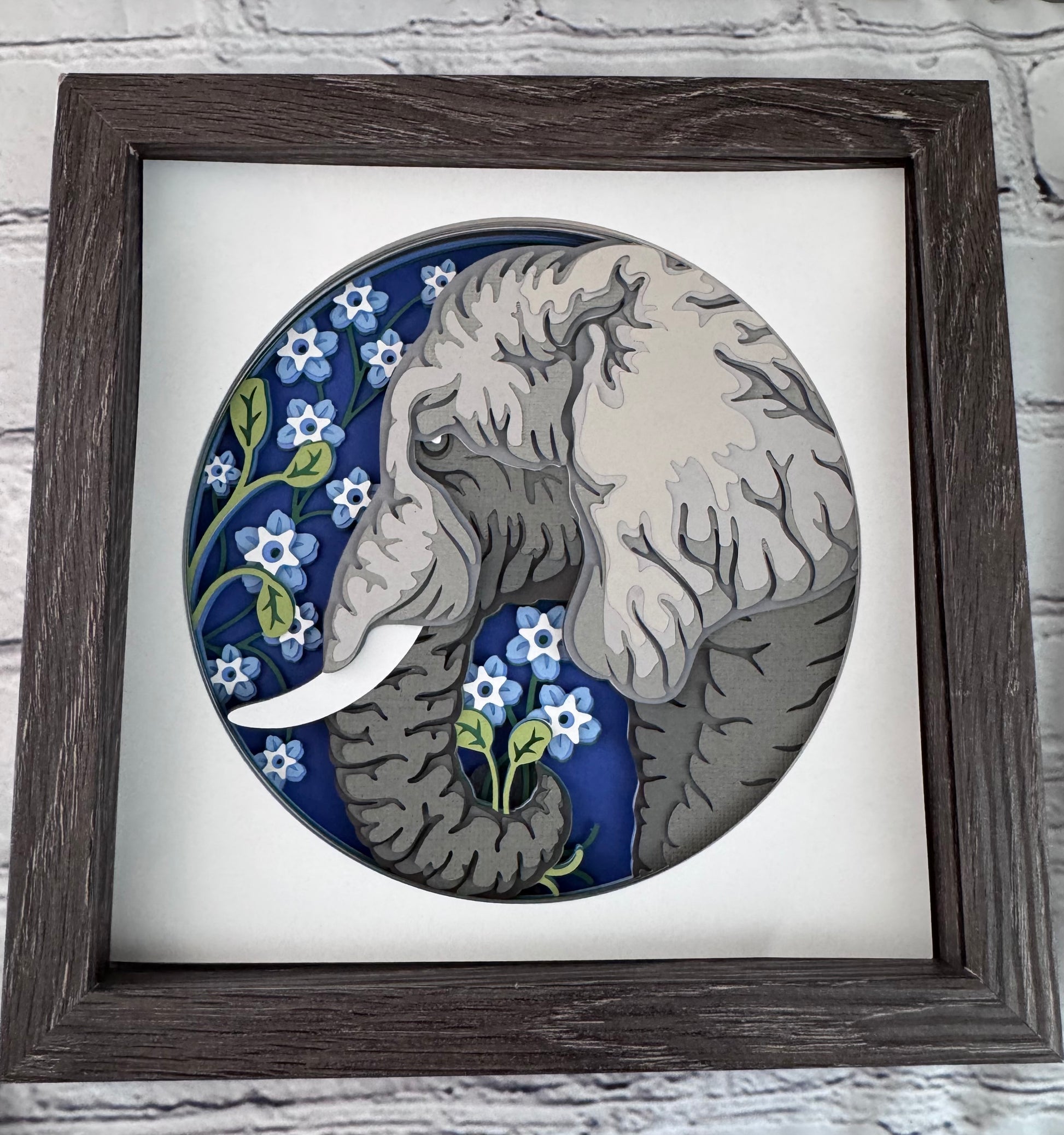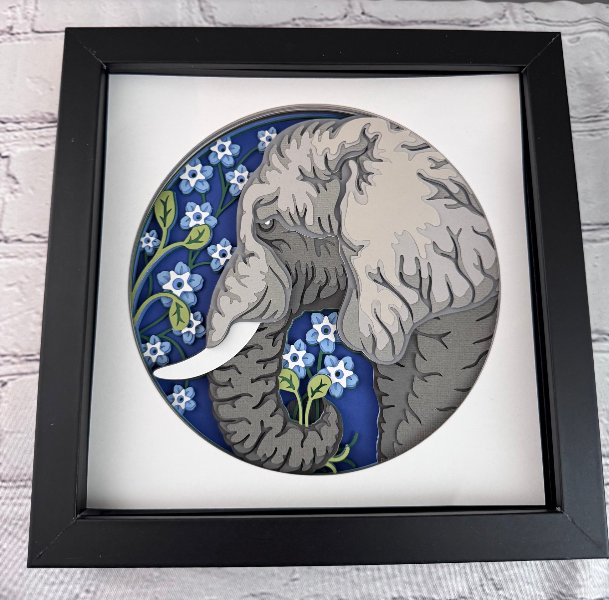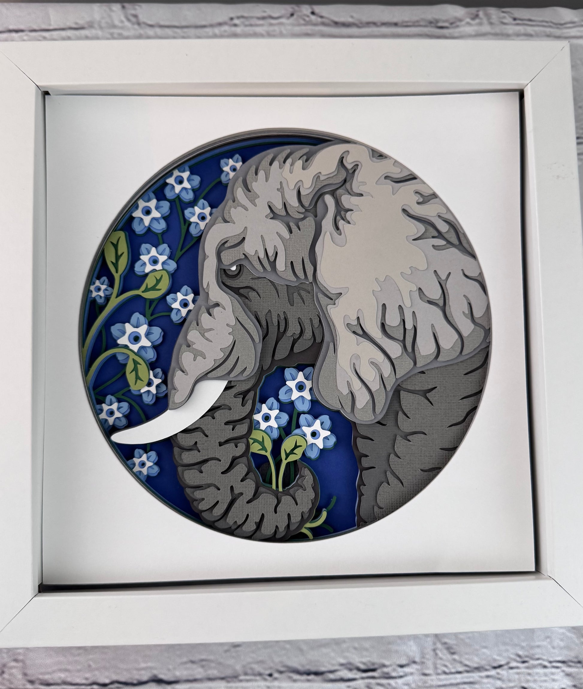 Multi-layered cardstock art. Cut and assembled by hand, this art has adhesive foam in between the layers to give it a 3-dimensional look. This listing is for the art in an 8”x8” shadowbox.