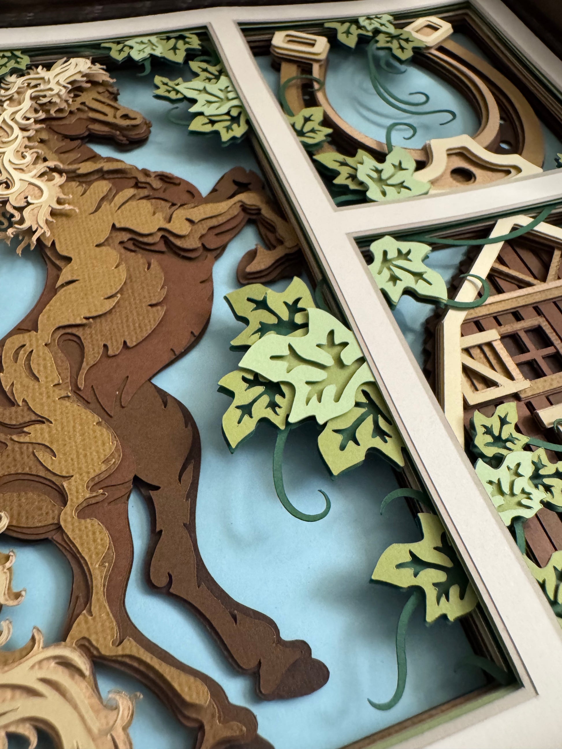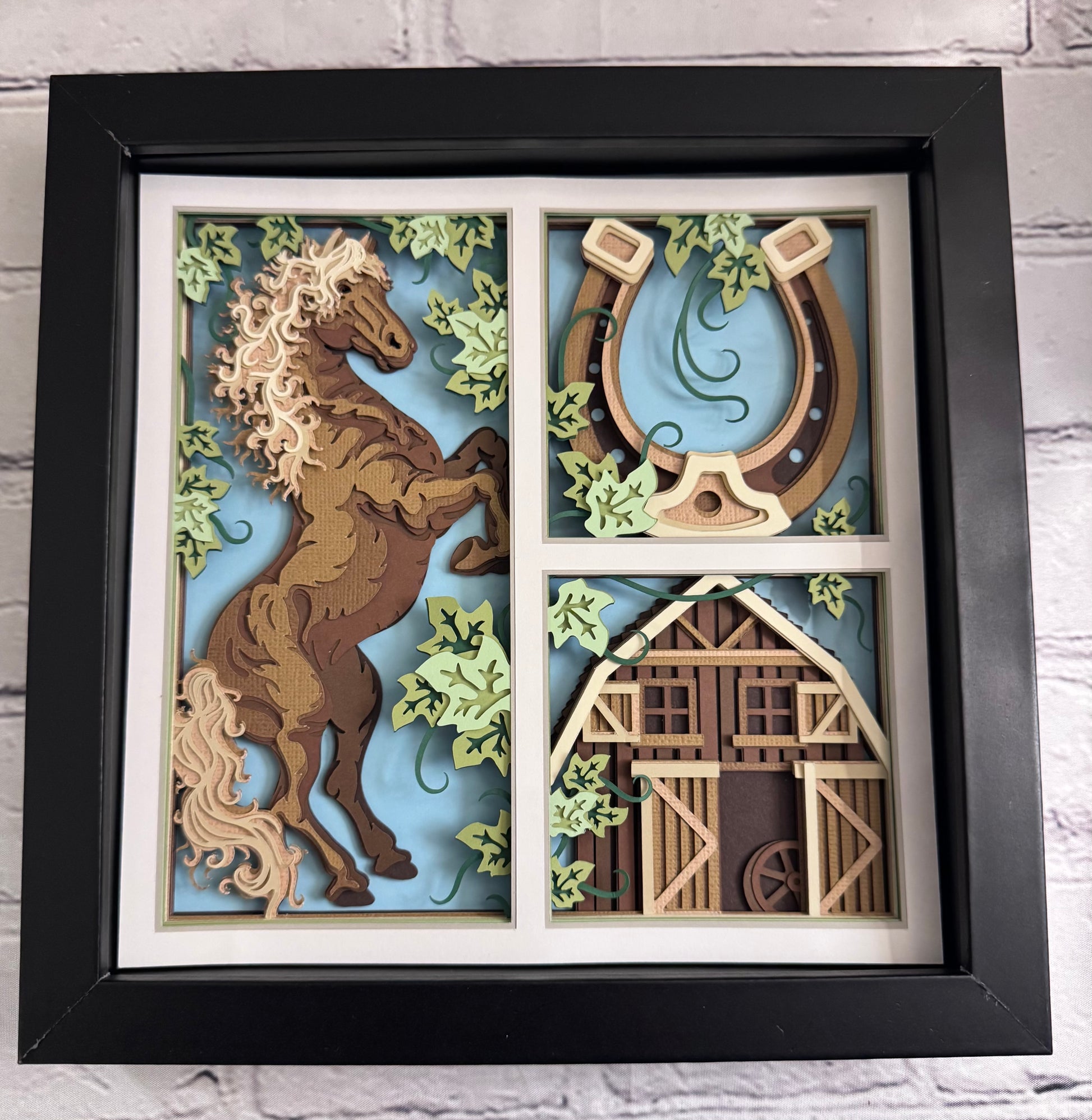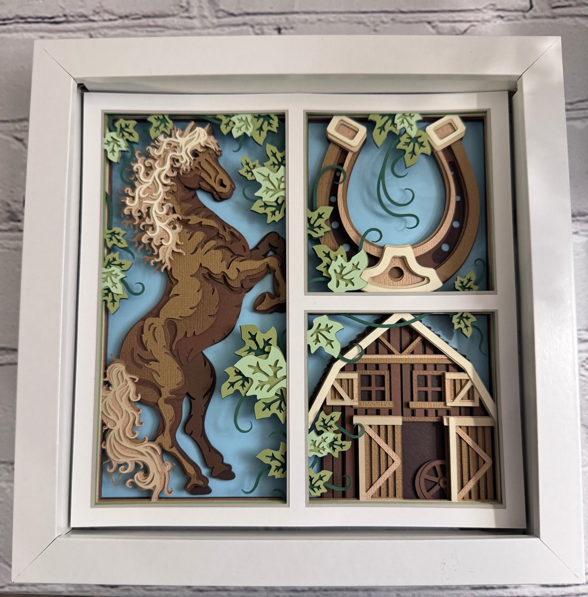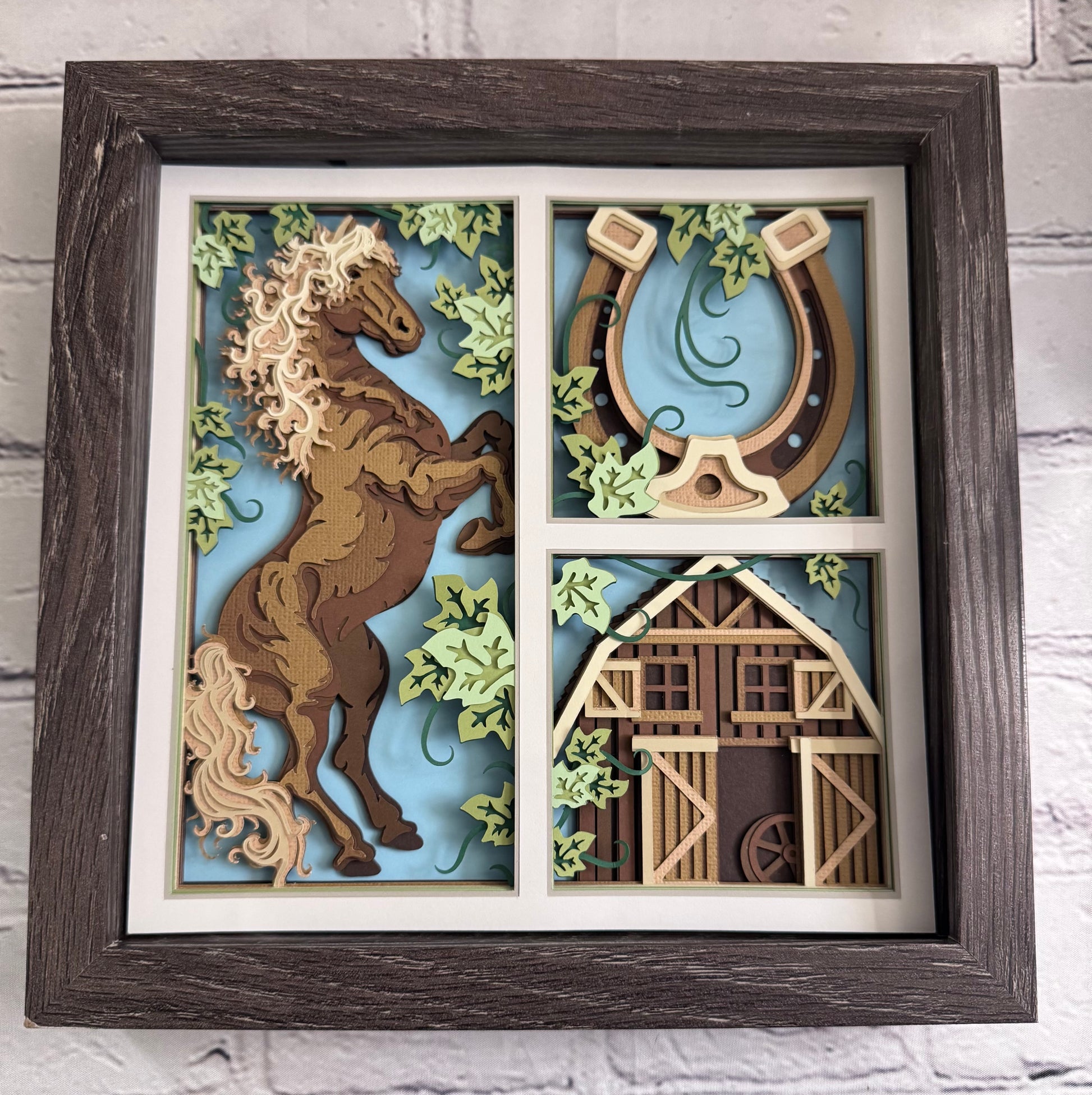 Horse with barn and horseshoe 3D paper art in a shadowbox