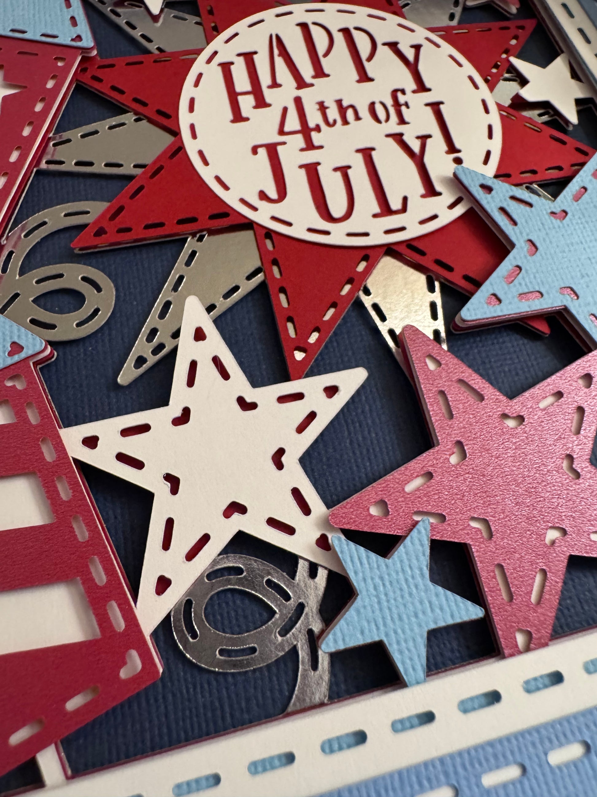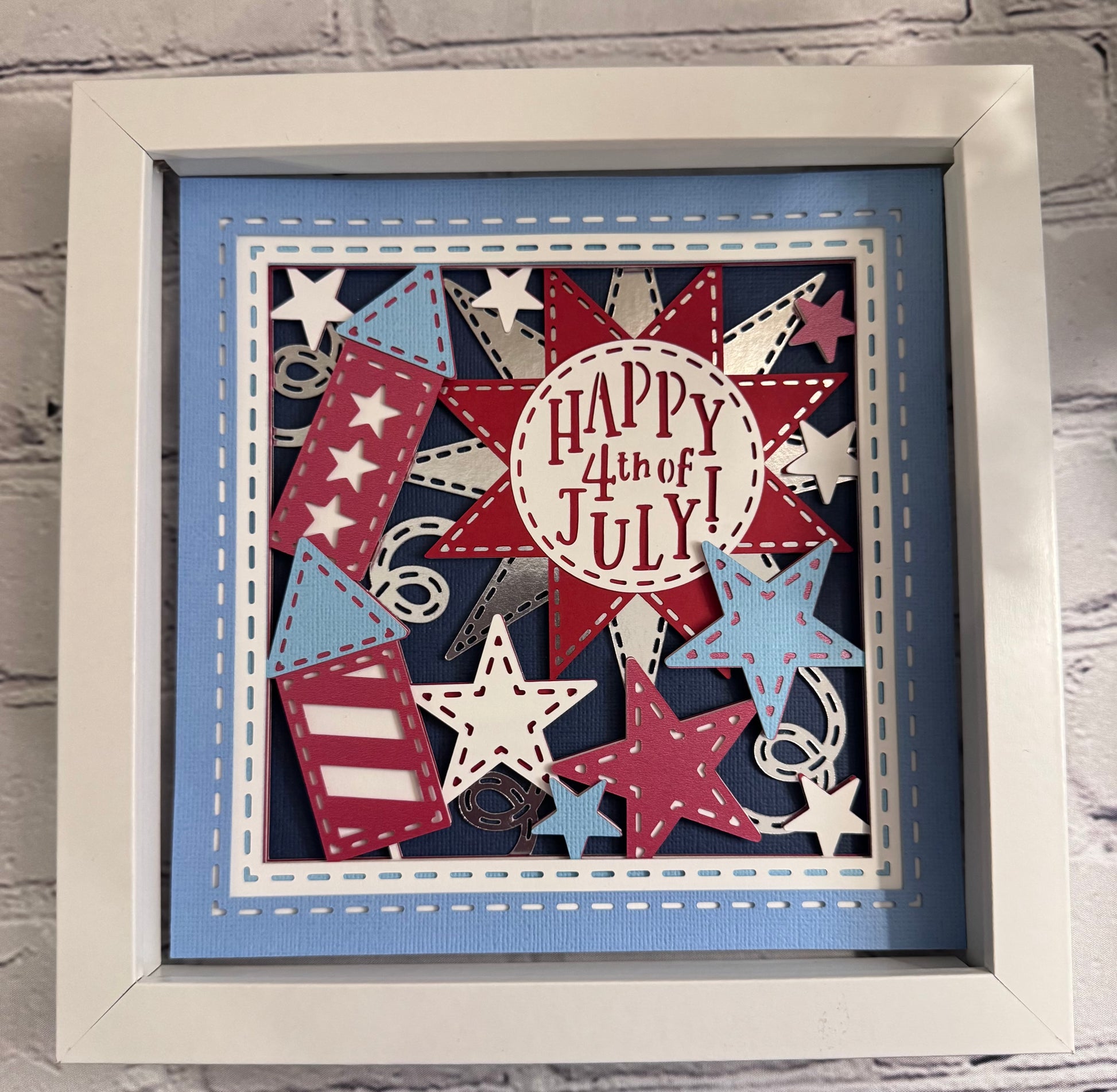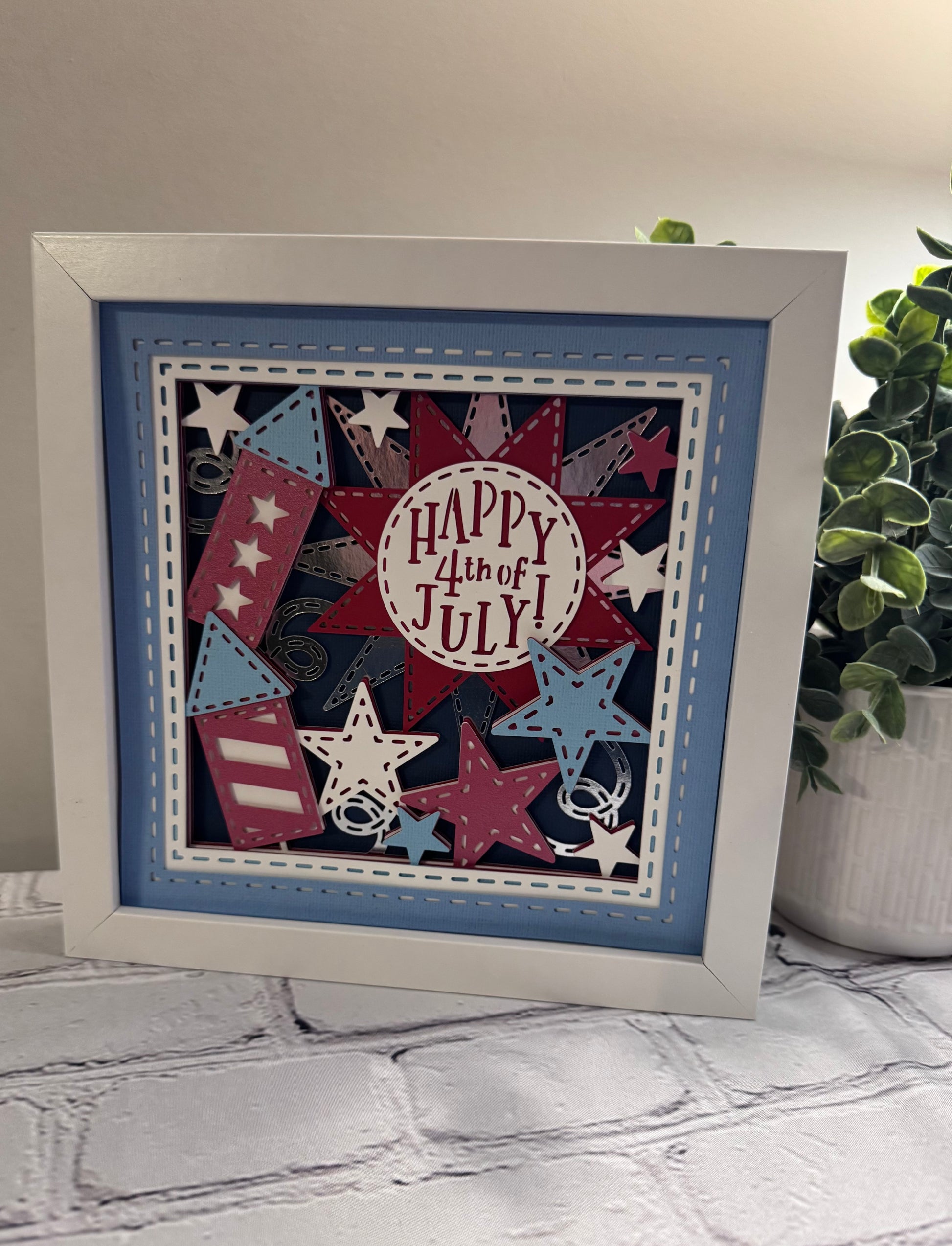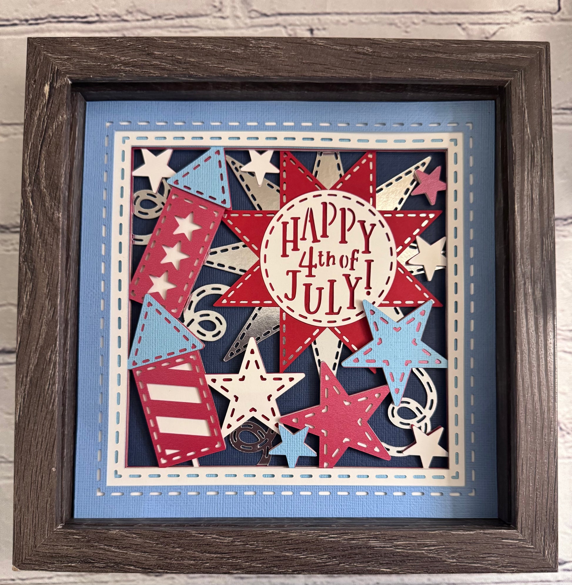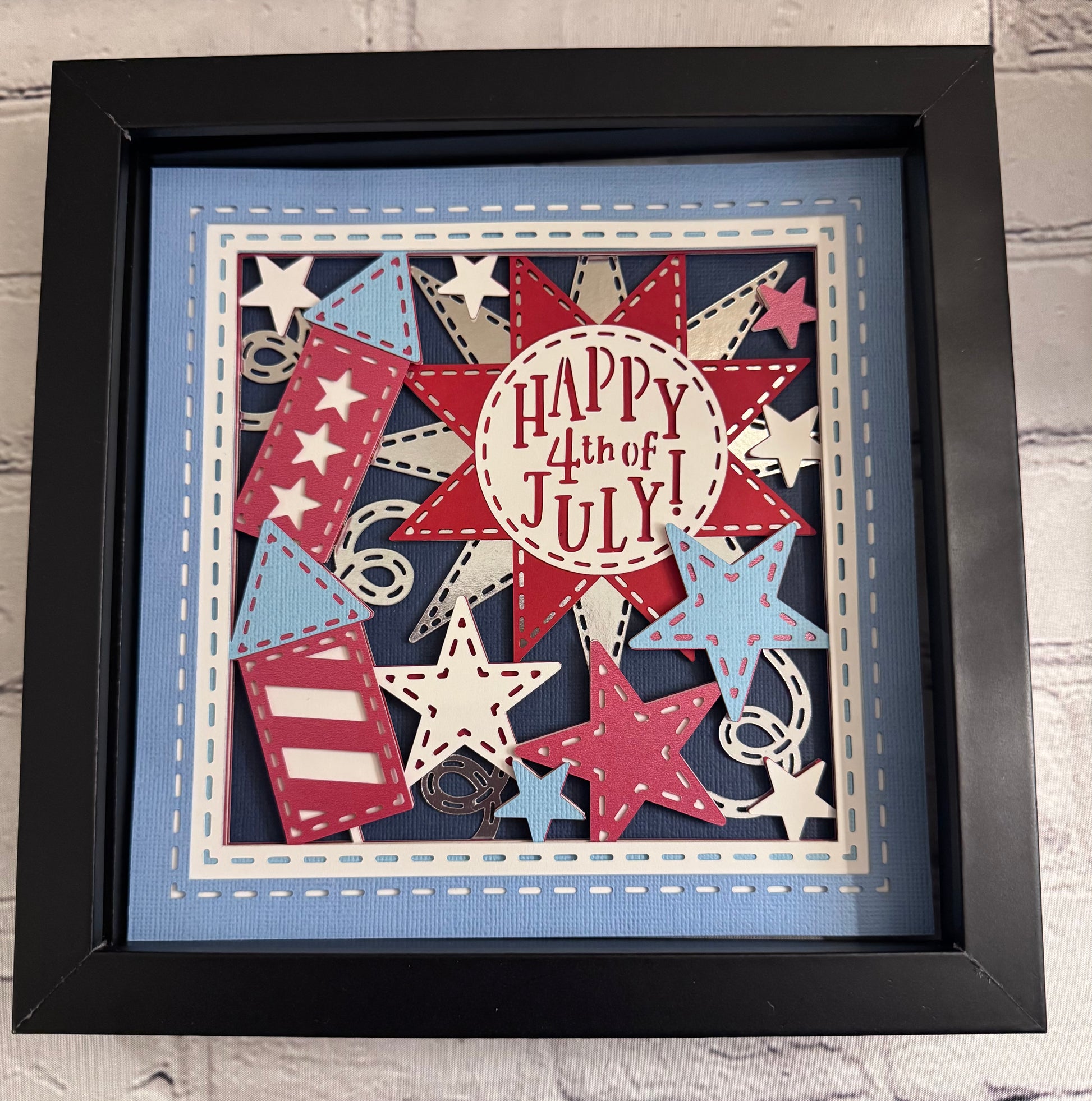 Multi-layered cardstock art. Cut and assembled by hand, this art has adhesive foam in between the layers to give it a 3-dimensional look. This listing is for the art in an 8”x8” shadowbox.