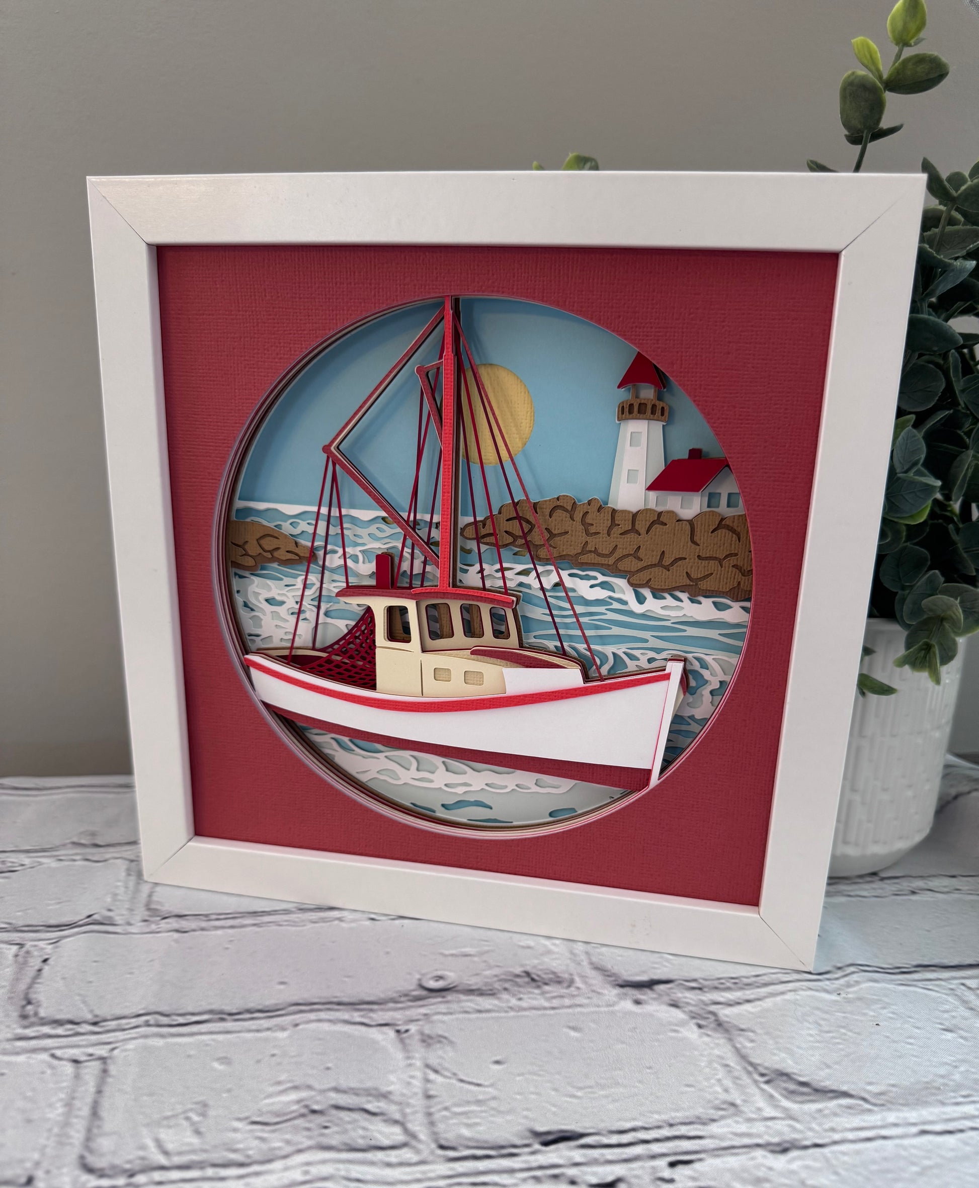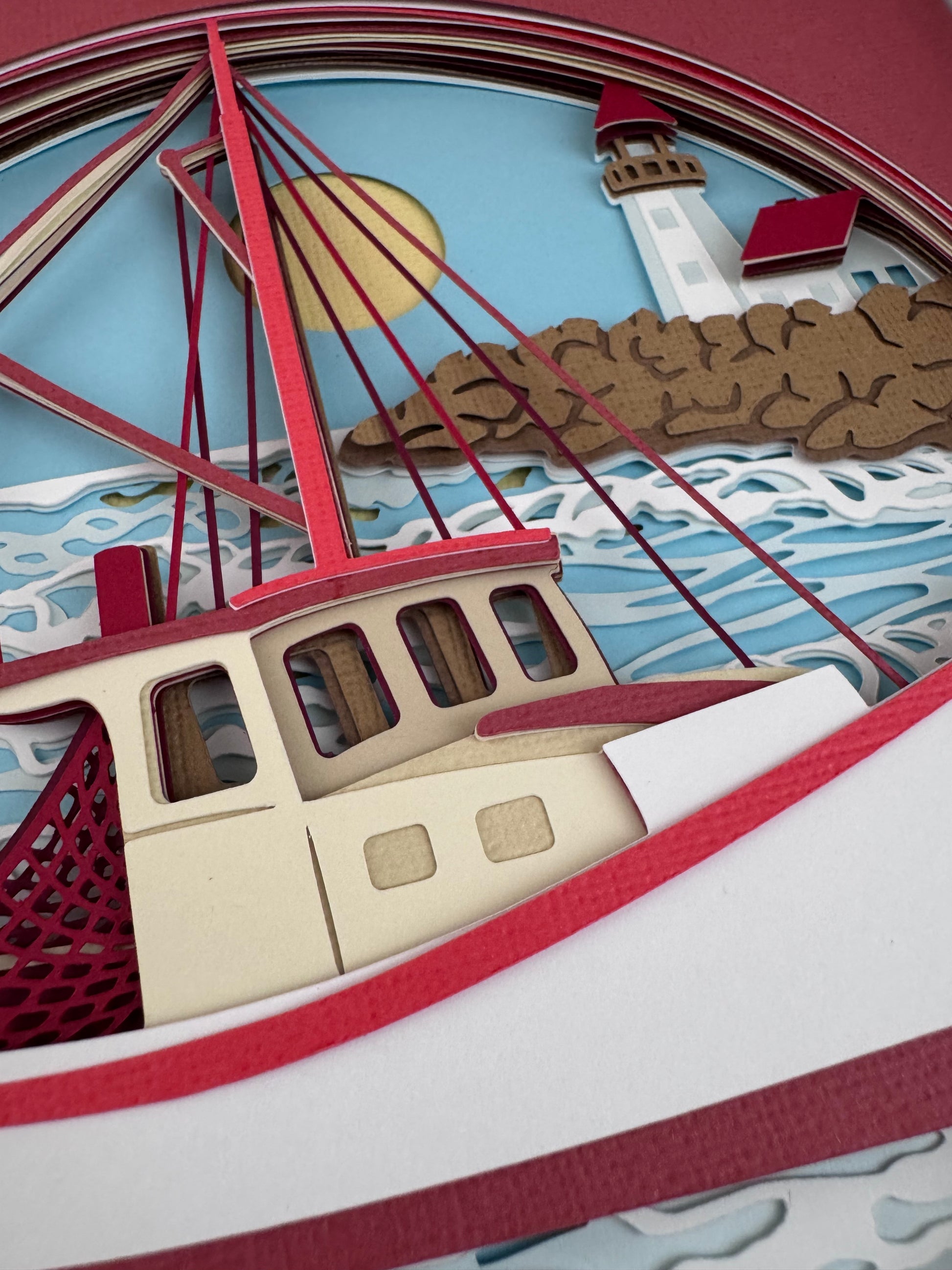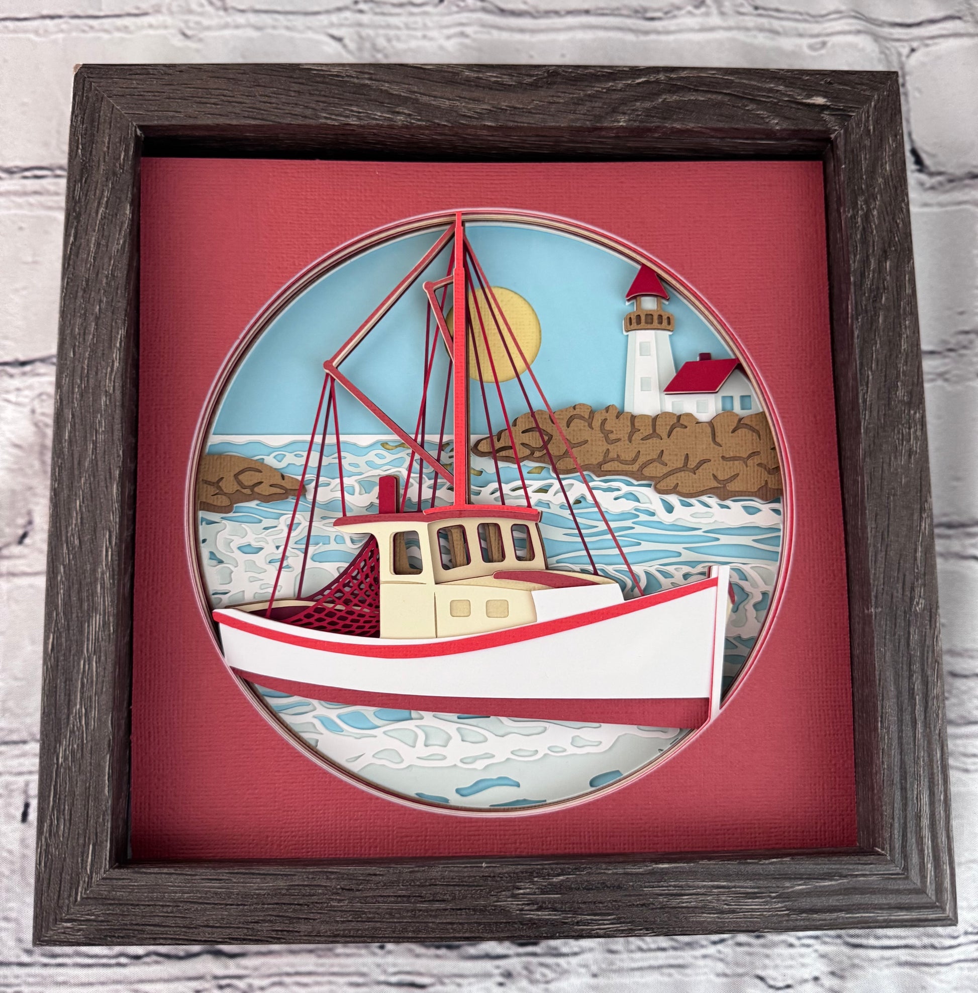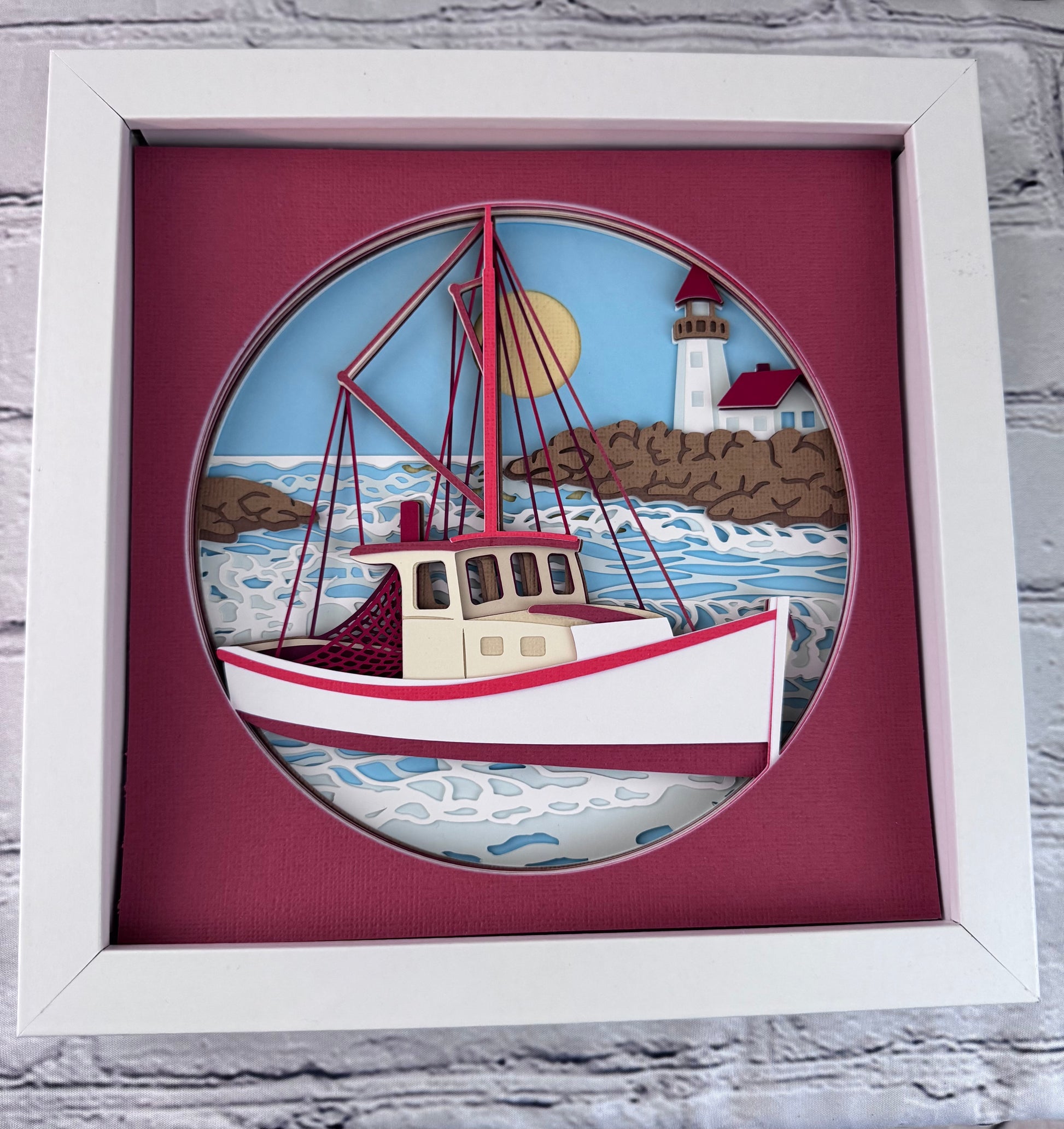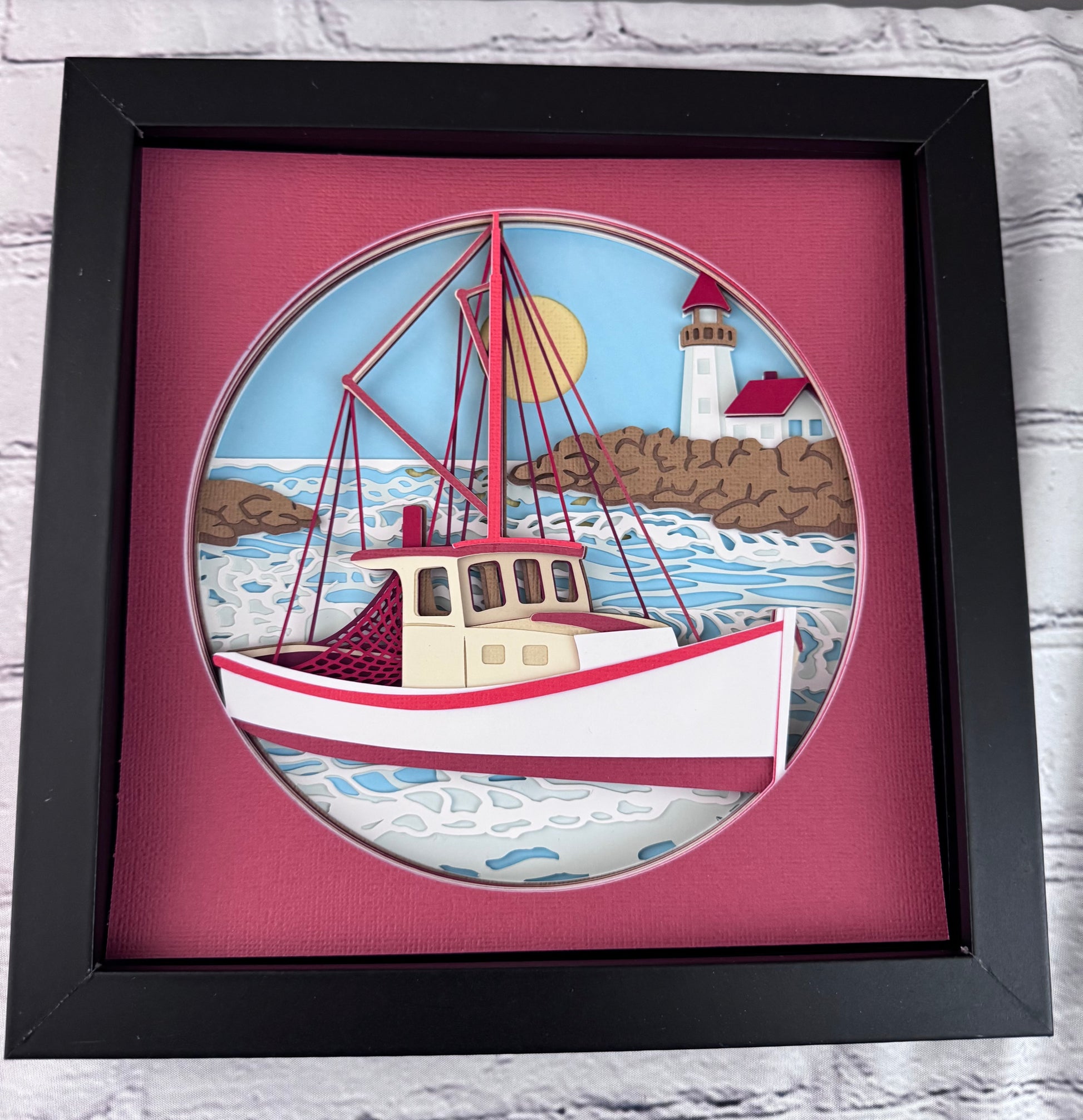 Multi-layered cardstock art. Cut and assembled by hand, this art has adhesive foam in between the layers to give it a 3-dimensional look. This listing is for the art in an 8”x8” shadowbox.