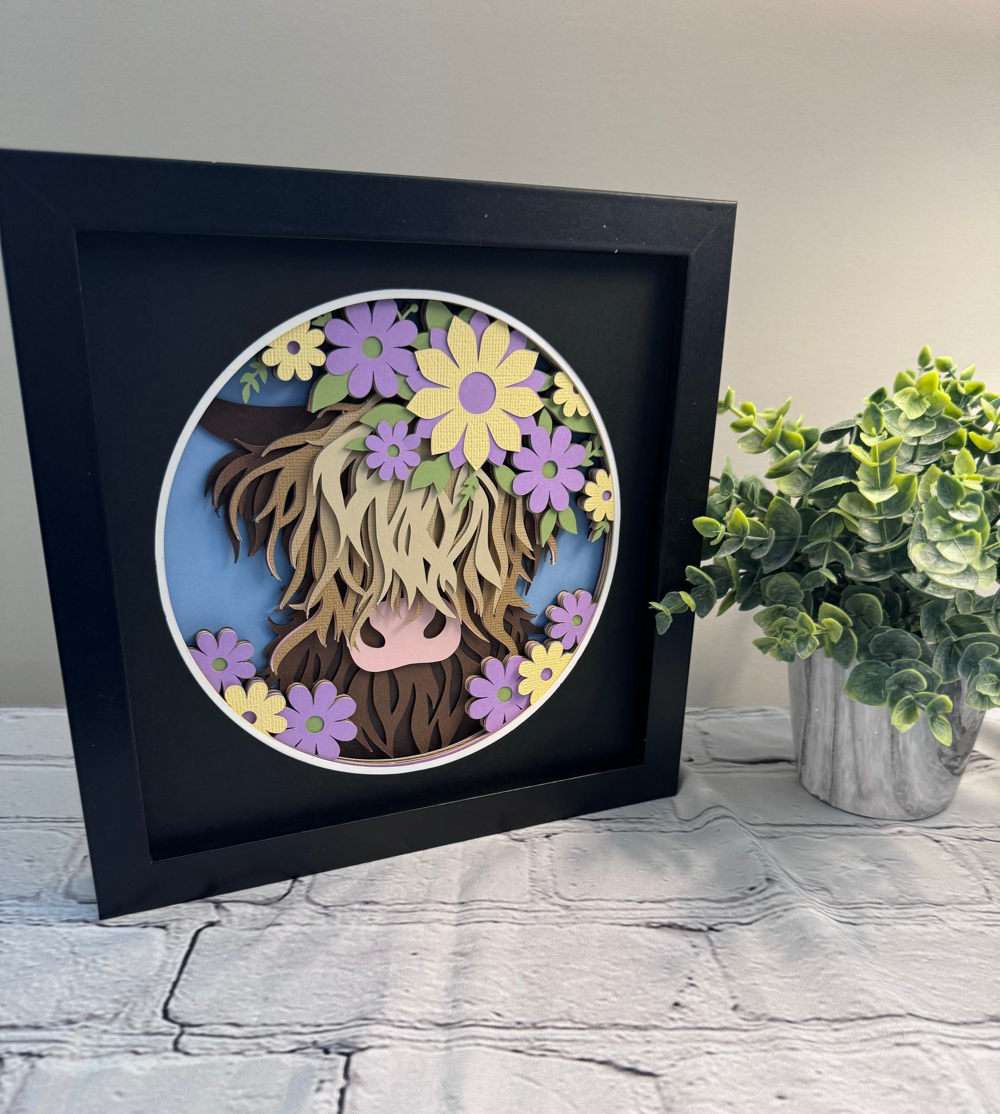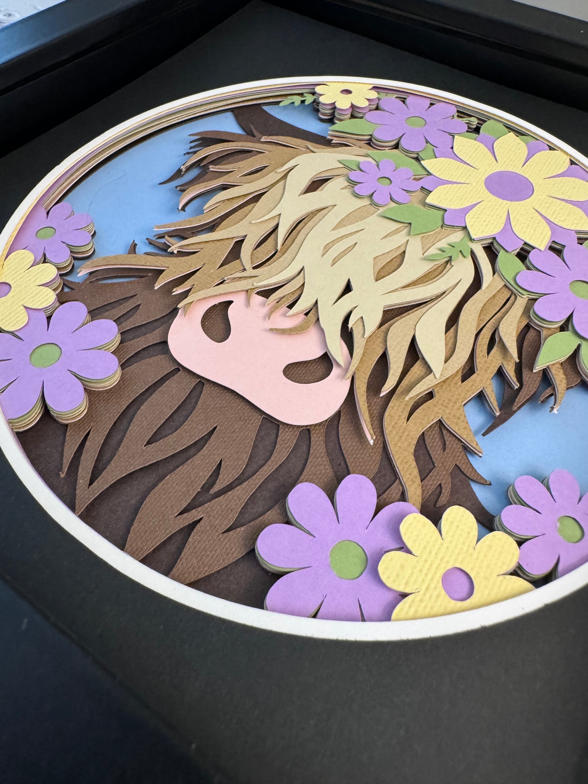 Multi-layered cardstock art. Cut and assembled by hand, this art has adhesive foam in between the layers to give it a 3-dimensional look. This listing is for the art in an 8”x8” shadowbox.