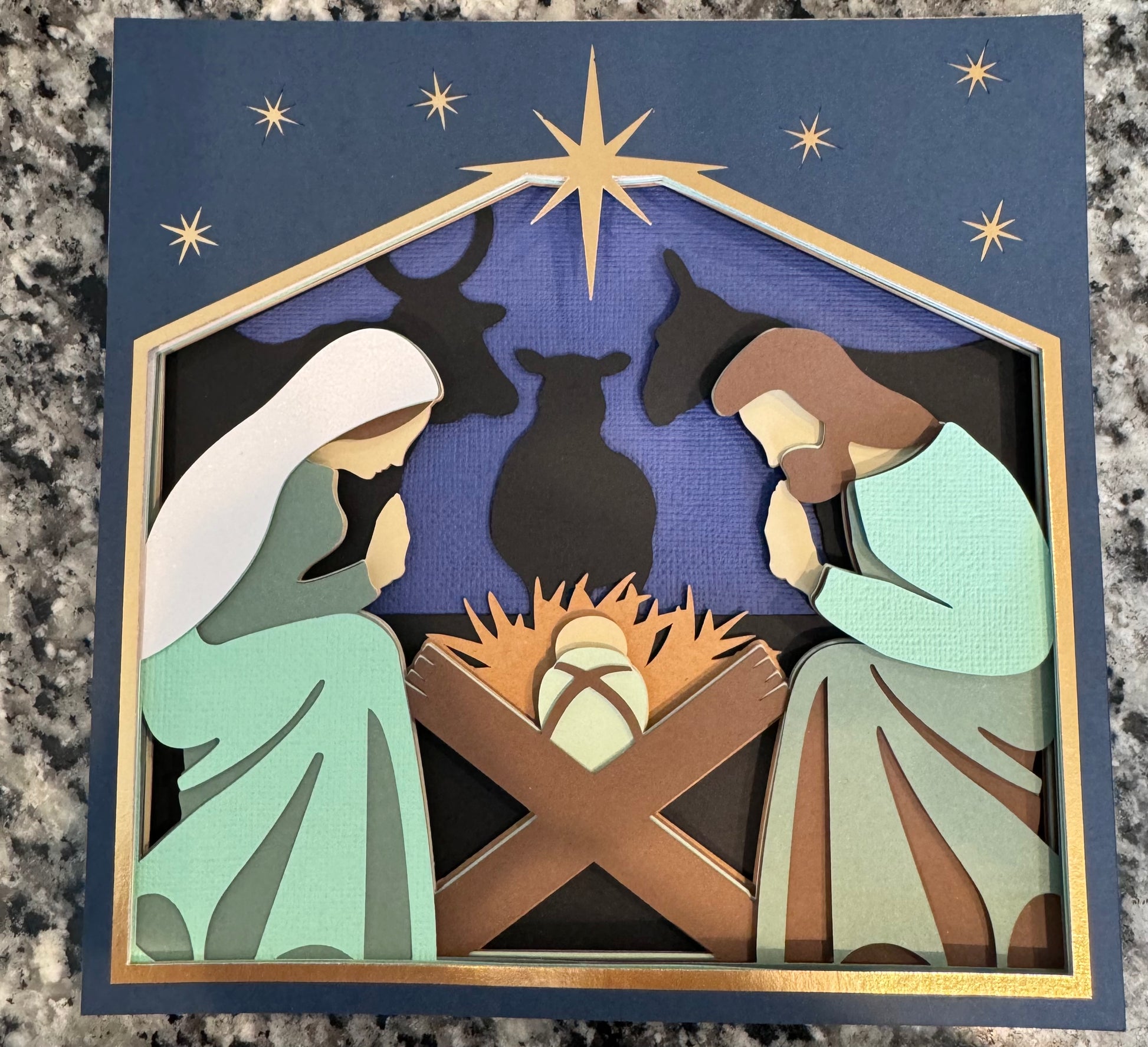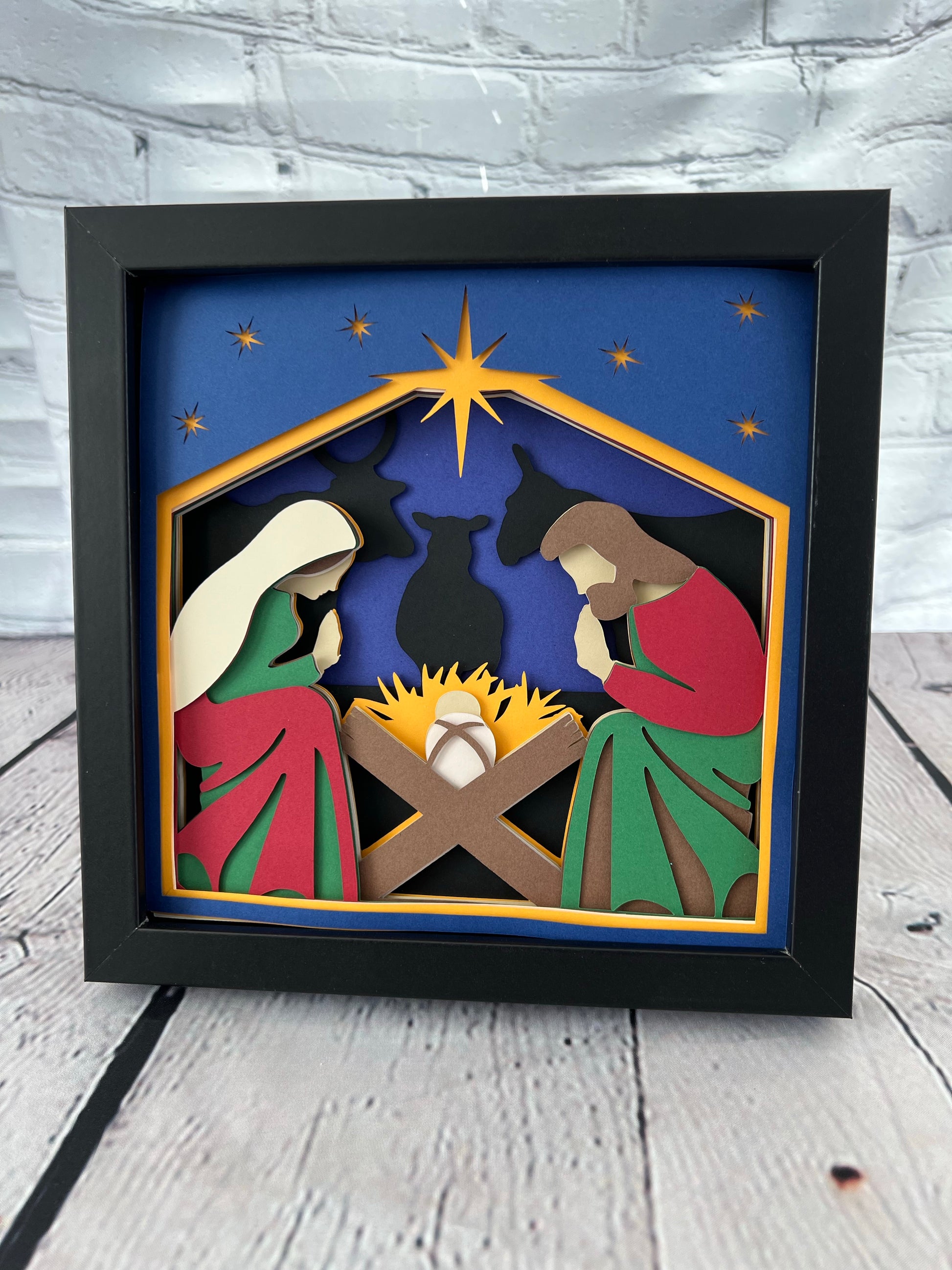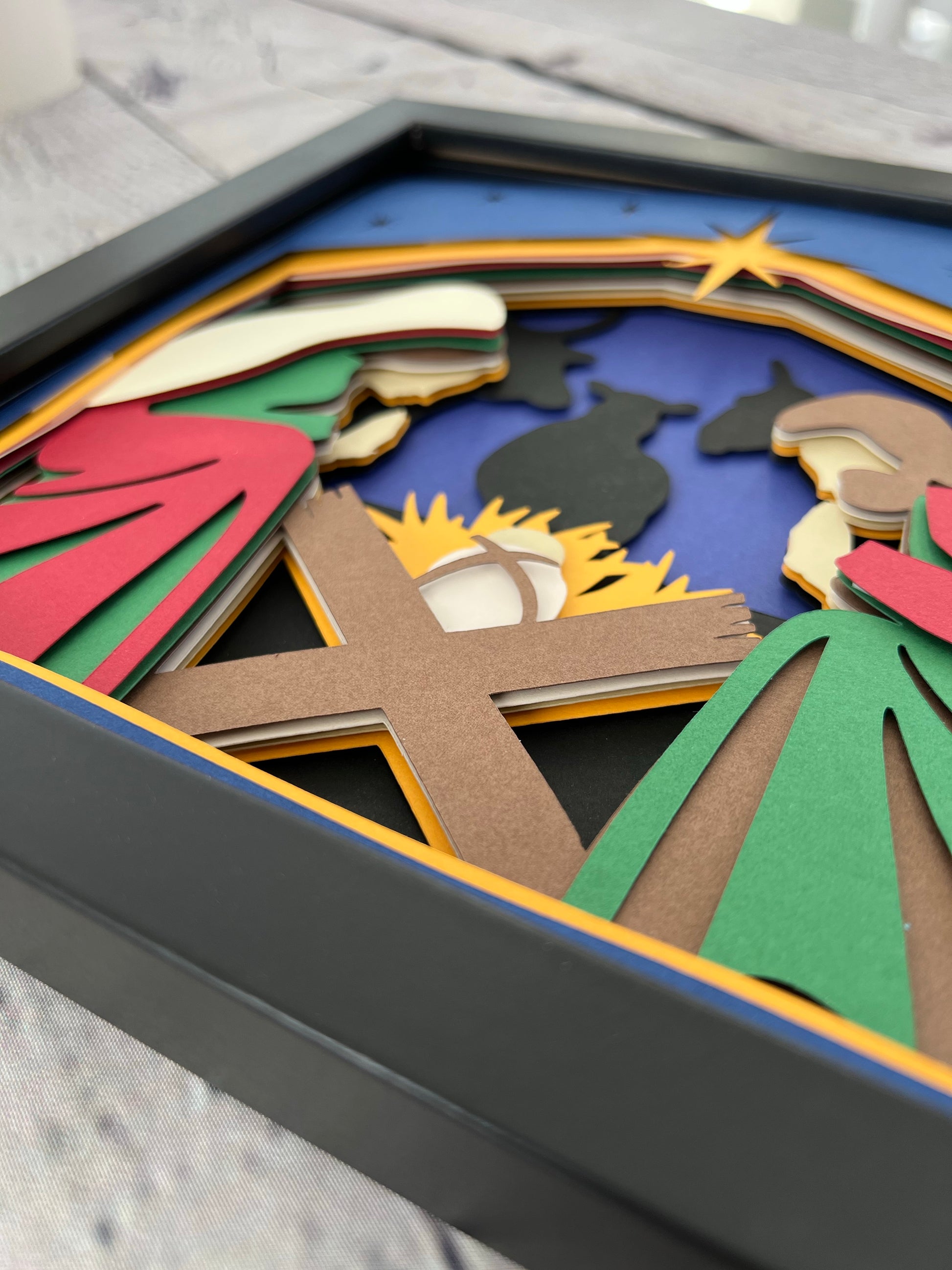Multi-layered cardstock art. Cut and assembled by hand, this art has adhesive foam in between the layers to give it a 3-dimensional look. This listing is for the art in a 5”x5” shadowbox.