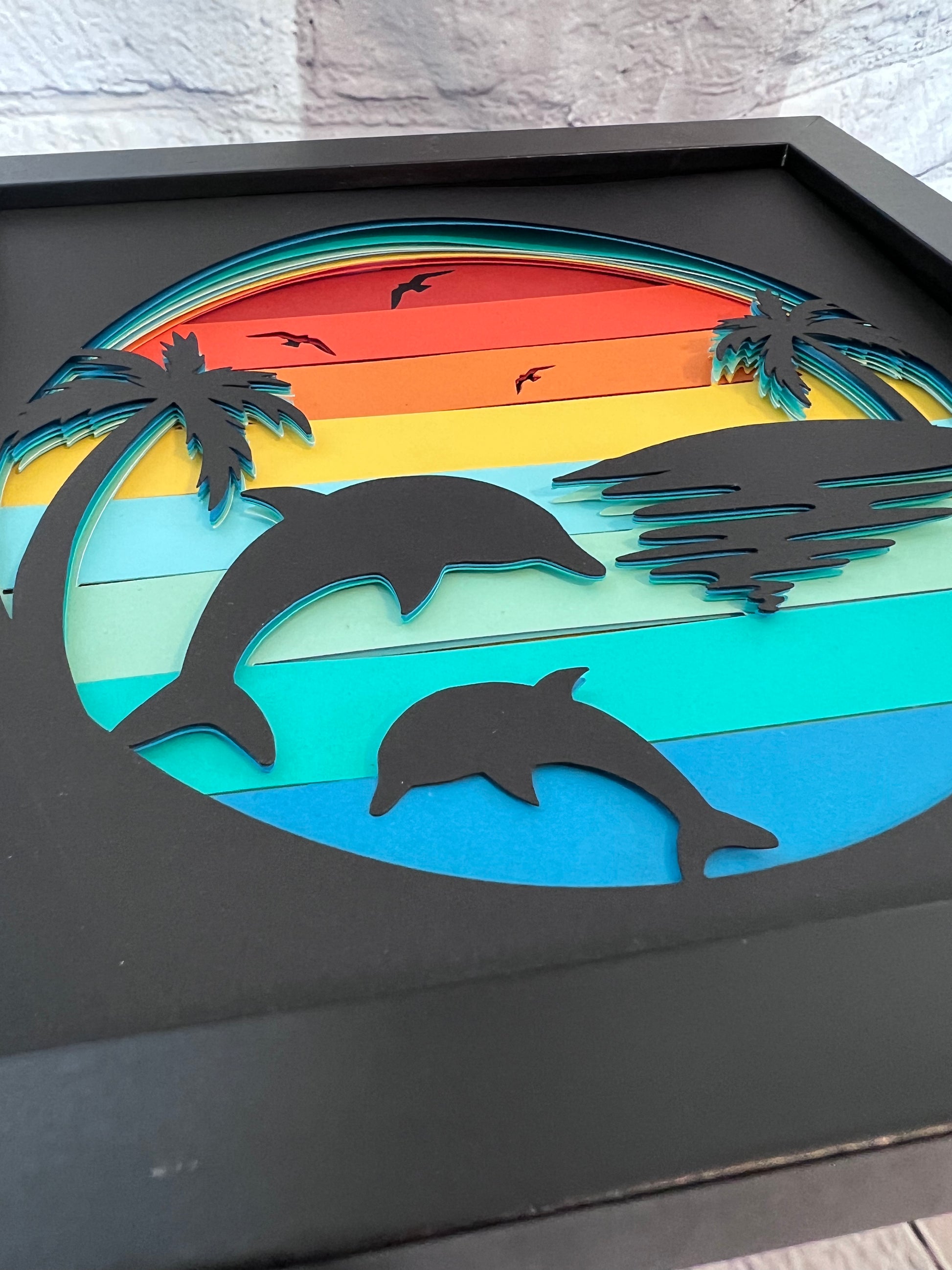 Multi-layered cardstock art. Cut and assembled by hand, this art has adhesive foam in between the layers to give it a 3-dimensional look. This listing is for the art in an 8”x8” shadowbox.