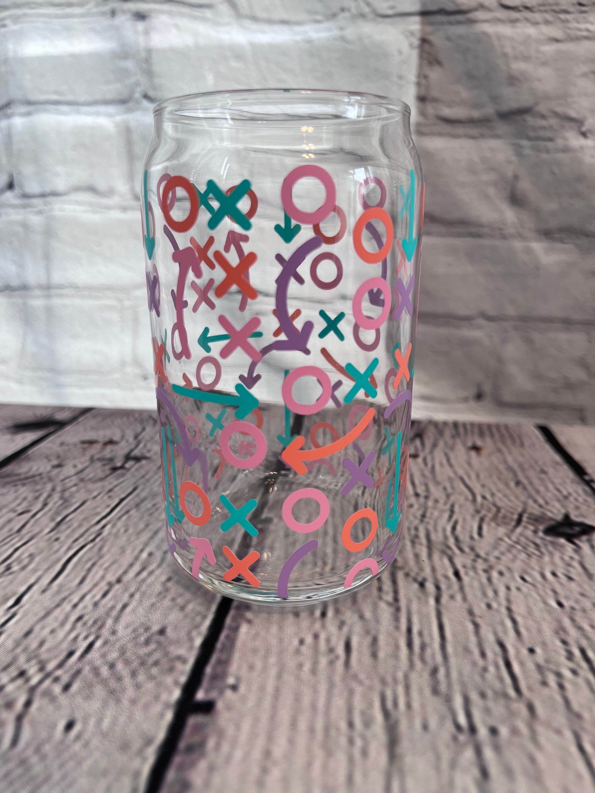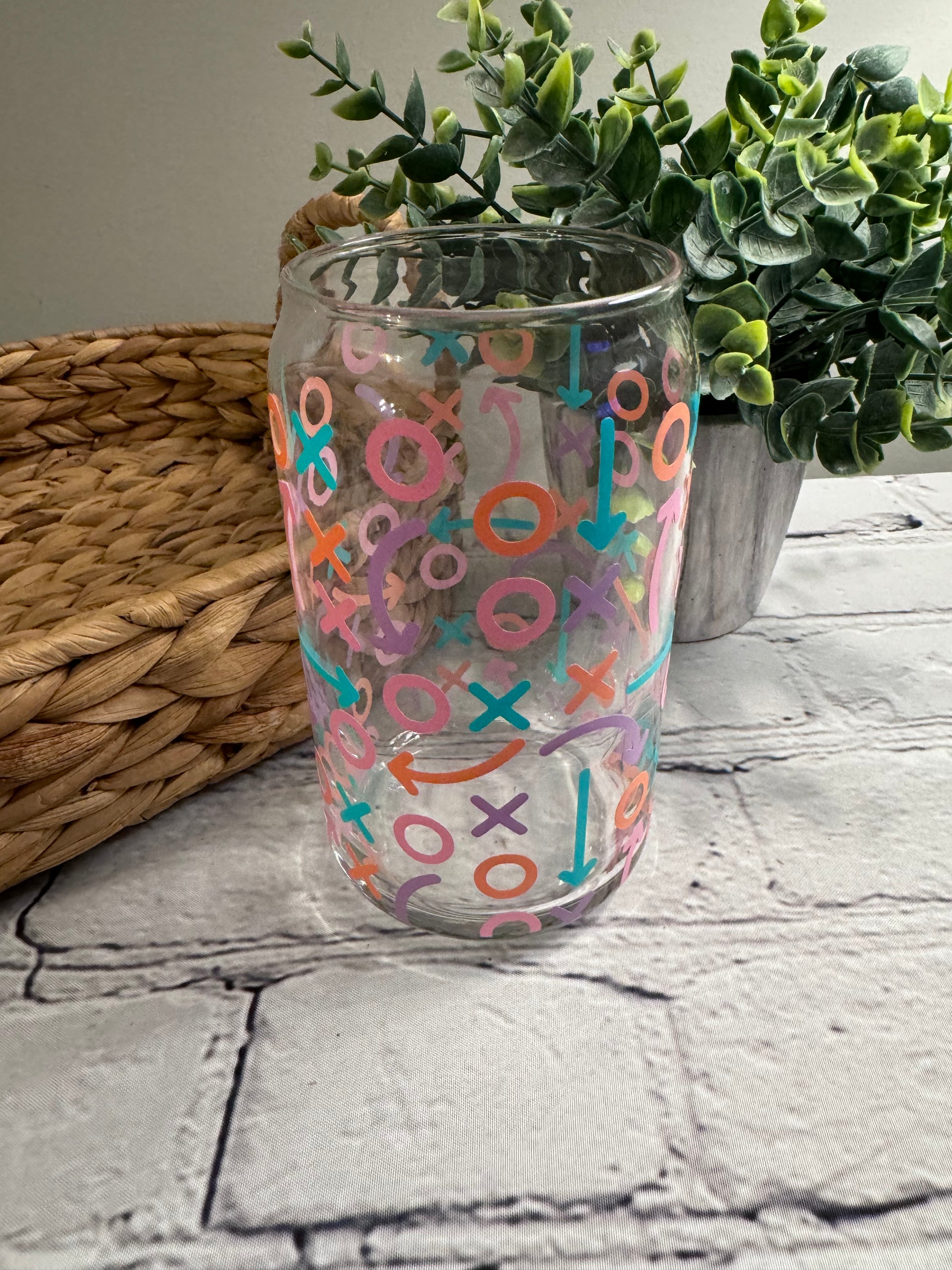 Beer can style glass. Perfect for iced coffee or any other type of cold drink! Designs are made from premium permanent vinyl and hand applied. Placement and color of designs may vary slightly from glass to glass. Bamboo lid and glass straw are included. This glass makes the perfect gift!