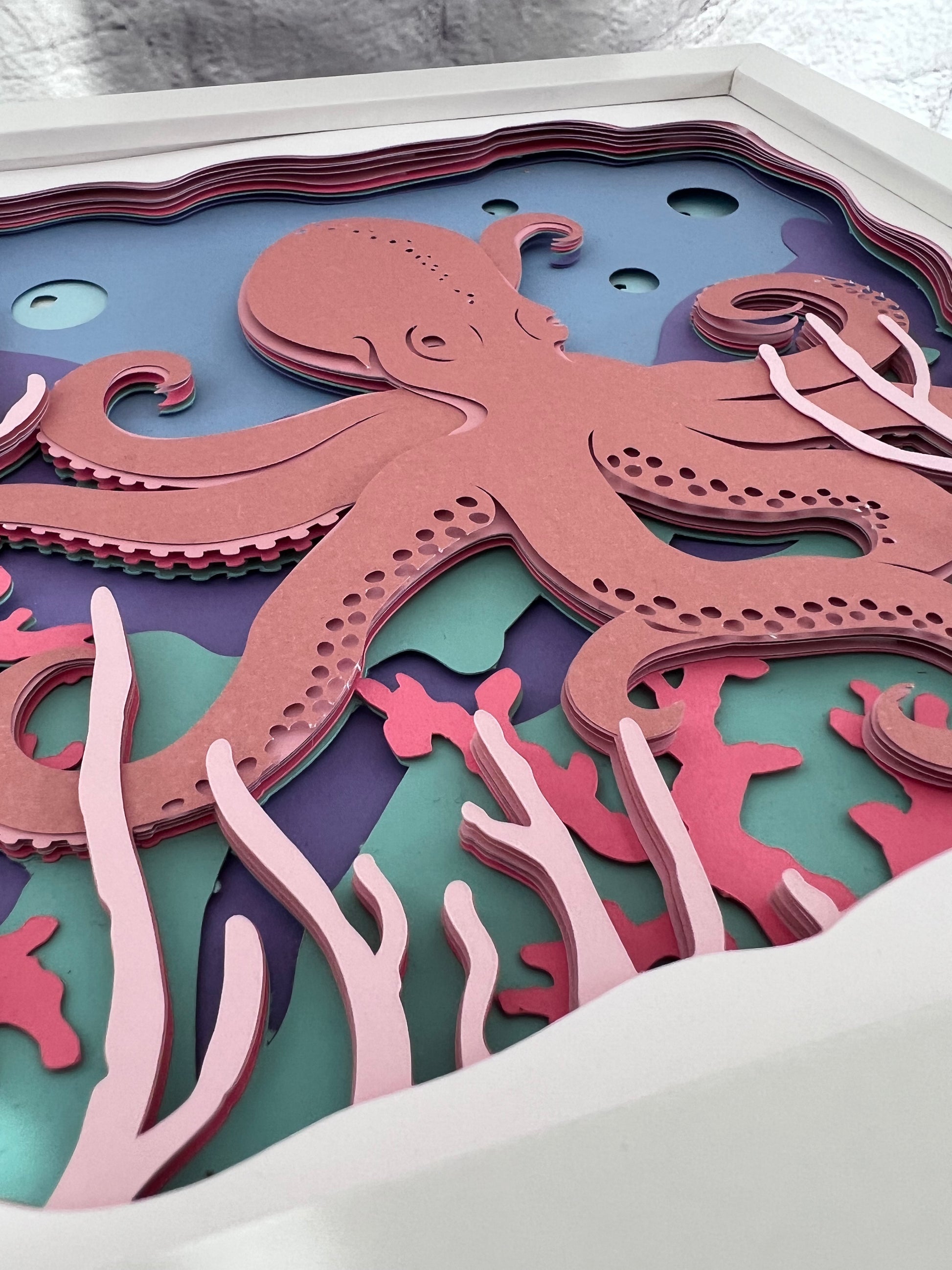 Witness the majestic majesty of the sea with this unique 3D paper art! This "Octopus in a Box" features a multi-layered paper octopus art encased in an 8"x8" shadowbox for an eye-catching display. Watch as this charismatic cephalopod transforms your space, bringing a splash of sea life to any room! ππ¦