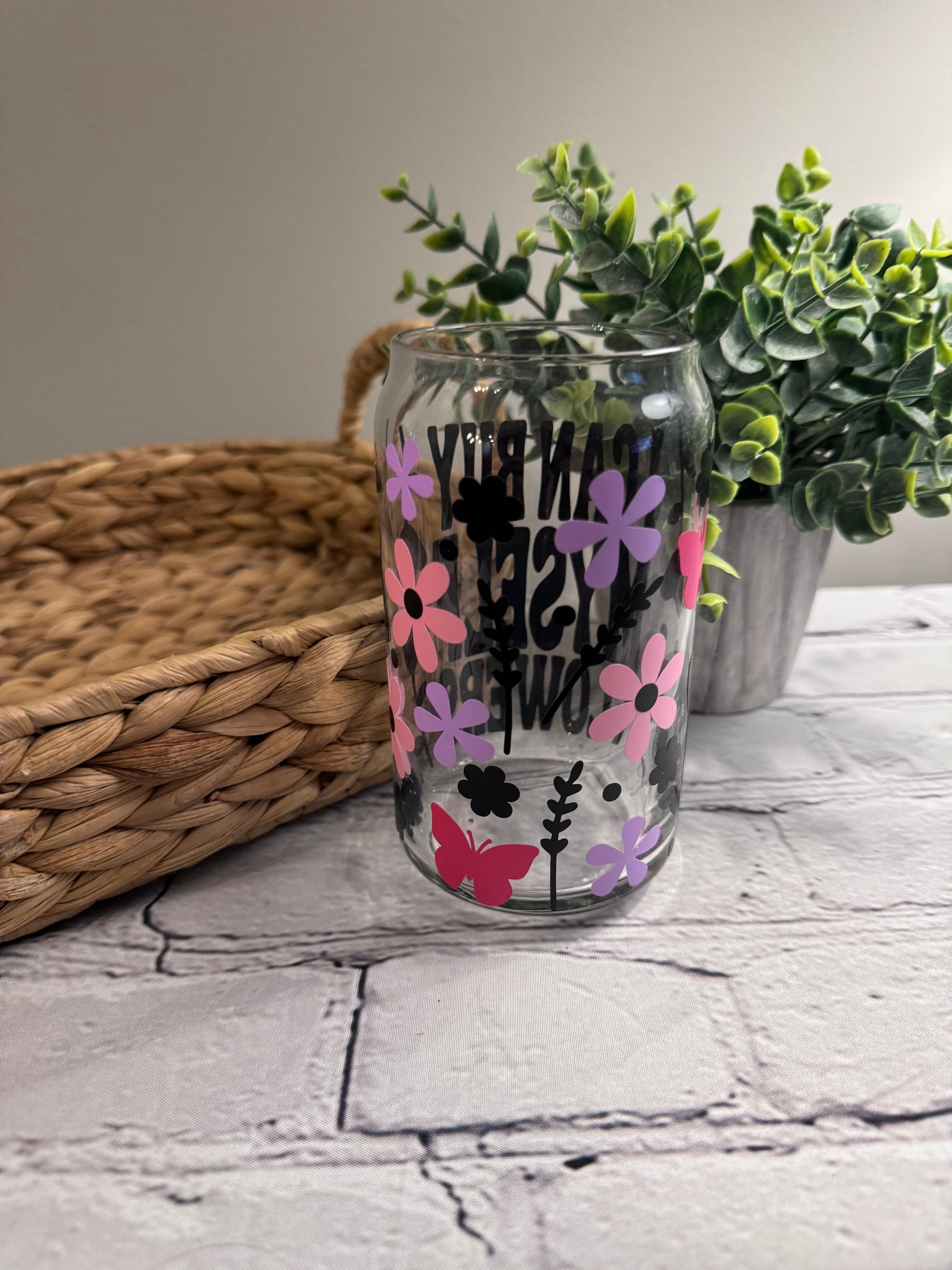 Beer can style glass. Perfect for iced coffee or any other type of cold drink! Designs are made from premium permanent vinyl and hand applied. Placement and color of designs may vary slightly from glass to glass. Bamboo lid and glass straw are included. This glass makes the perfect gift!