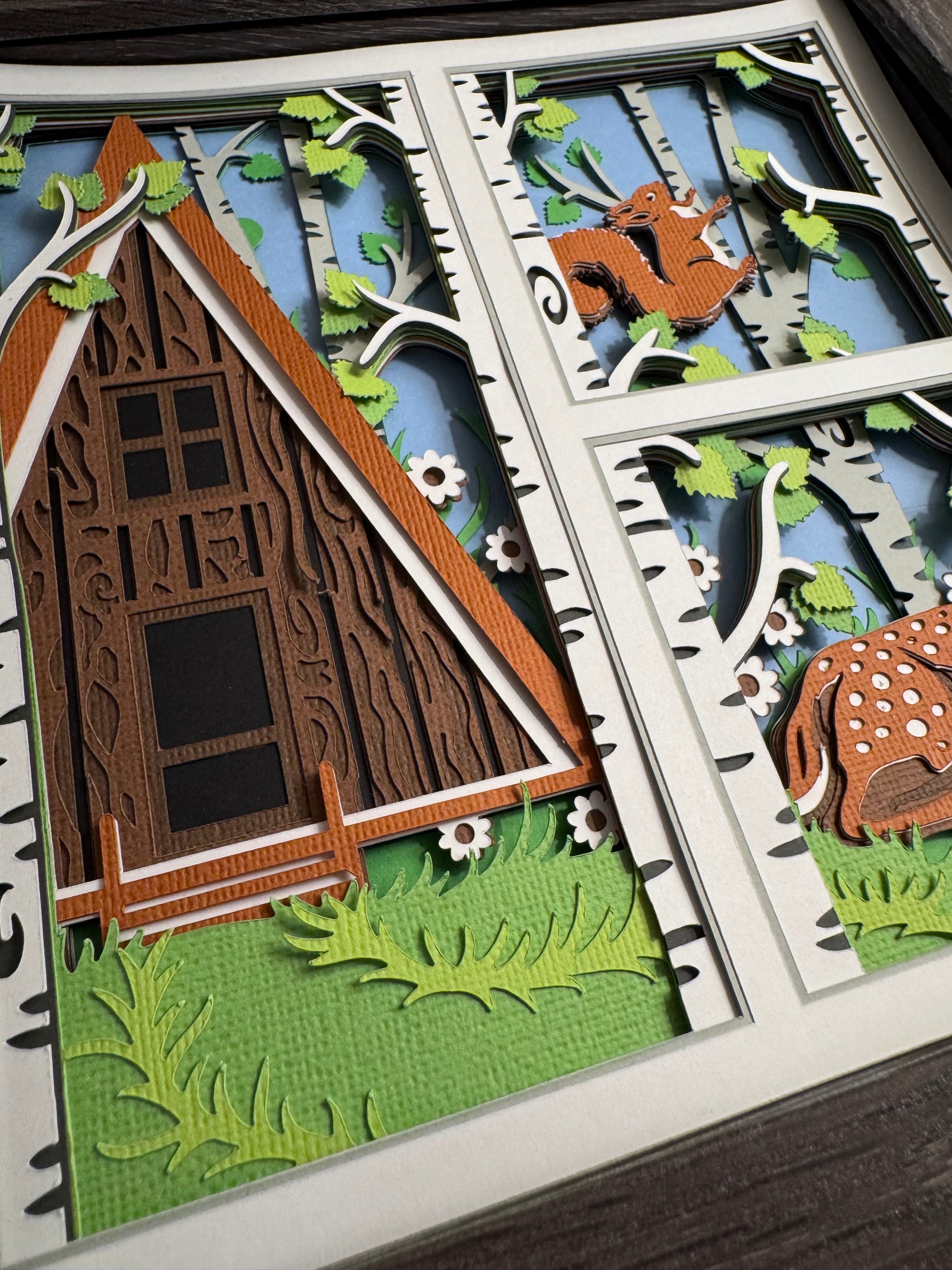 Multi-layered cardstock art. Cut and assembled by hand, this art has adhesive foam in between the layers to give it a 3-dimensional look. This listing is for the art in an 8”x8” shadowbox.