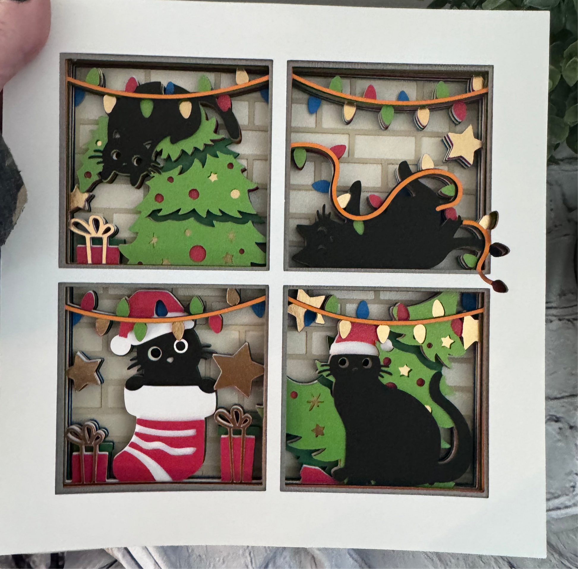 Christmas black cat causing trouble 3D paper art in a shadowbox