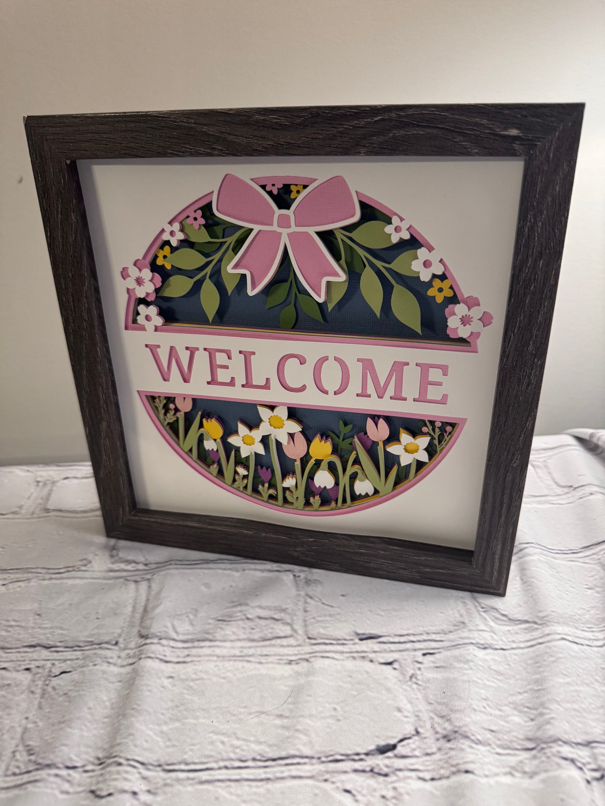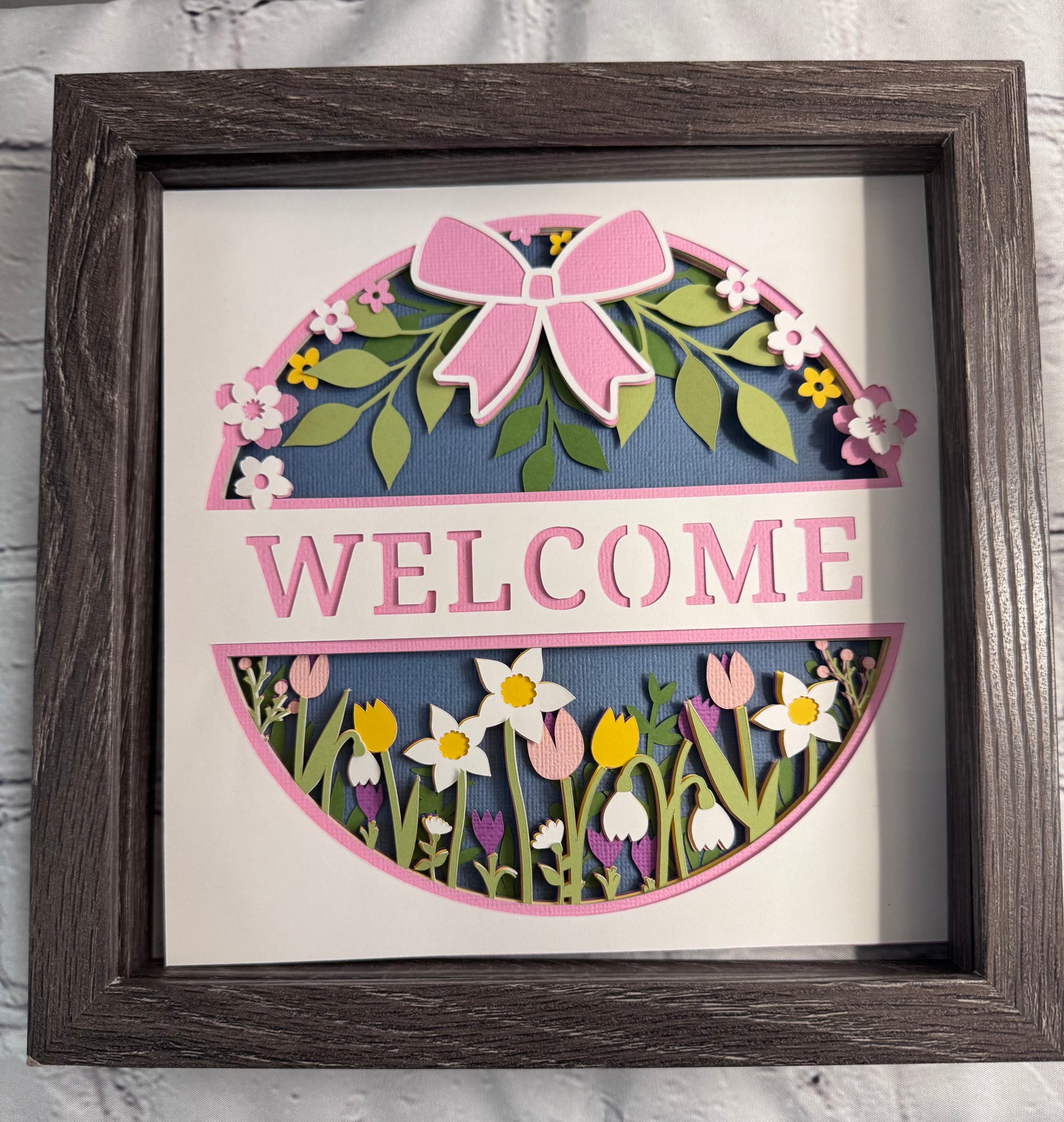 Multi-layered cardstock art. Cut and assembled by hand, this art has adhesive foam in between the layers to give it a 3-dimensional look. This listing is for the art in an 8”x8” shadowbox.