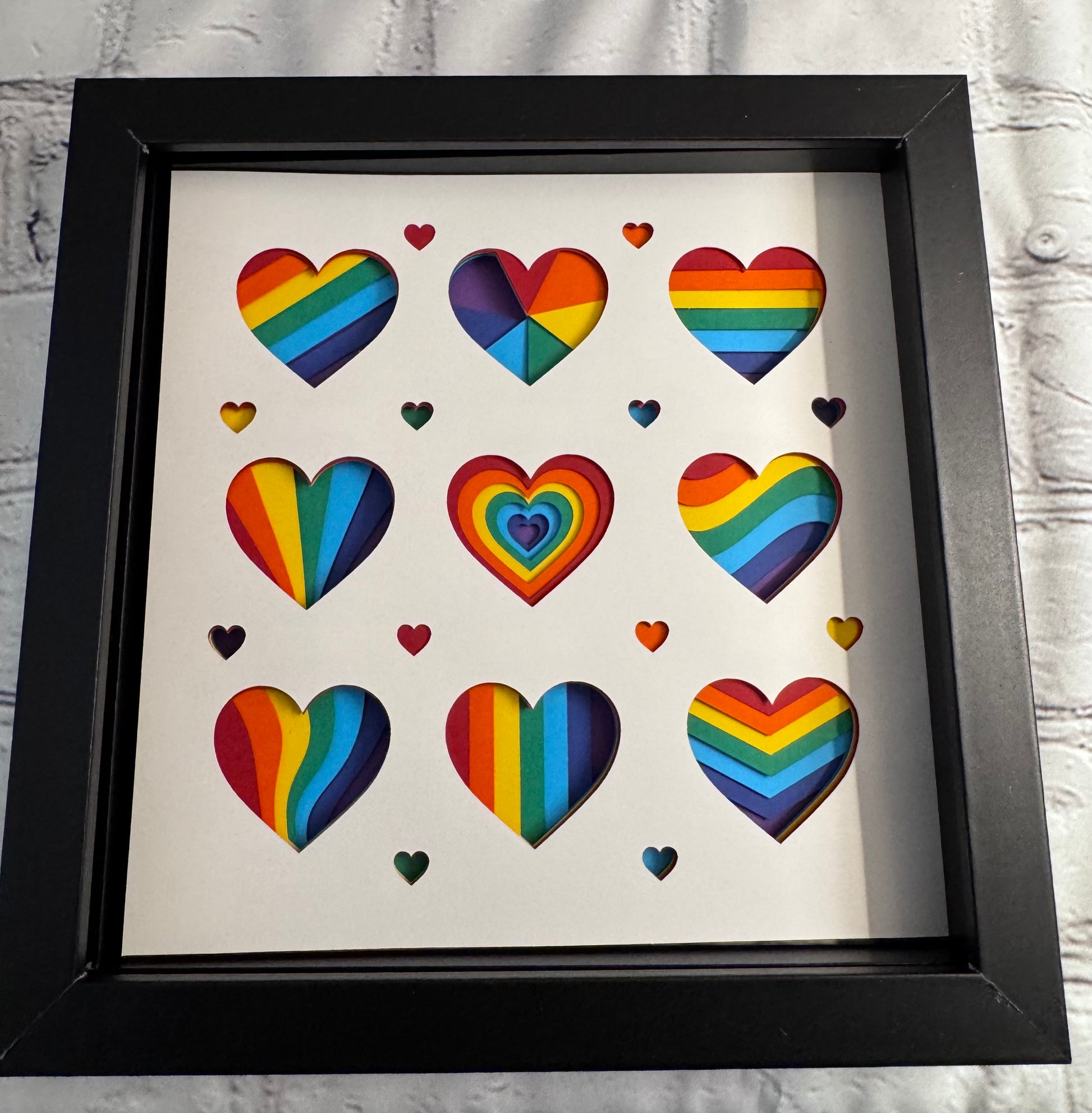 Multi-layered cardstock art. Cut and assembled by hand, this art has adhesive foam in between the layers to give it a 3-dimensional look. This listing is for the art in an 8”x8” shadowbox.