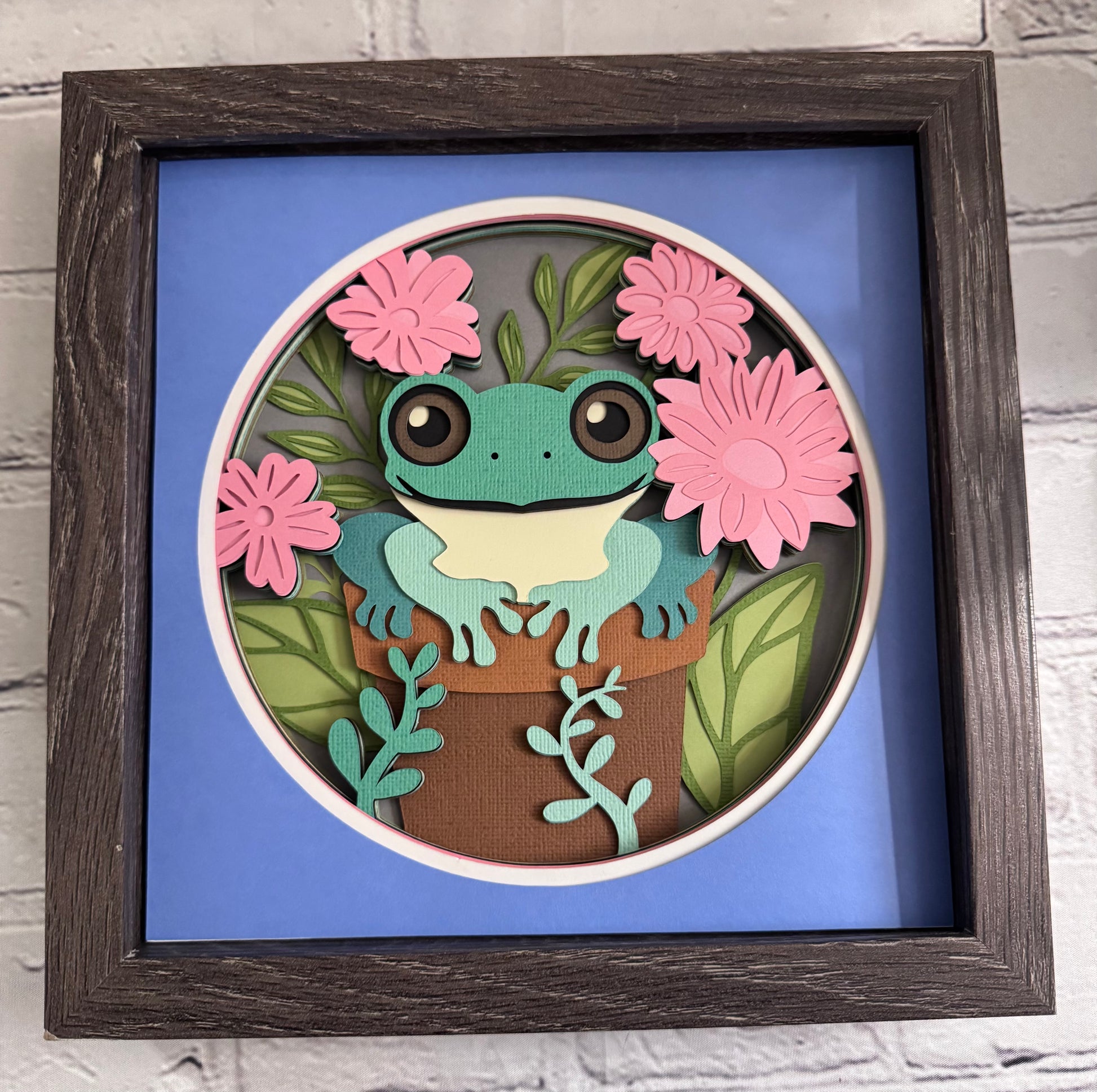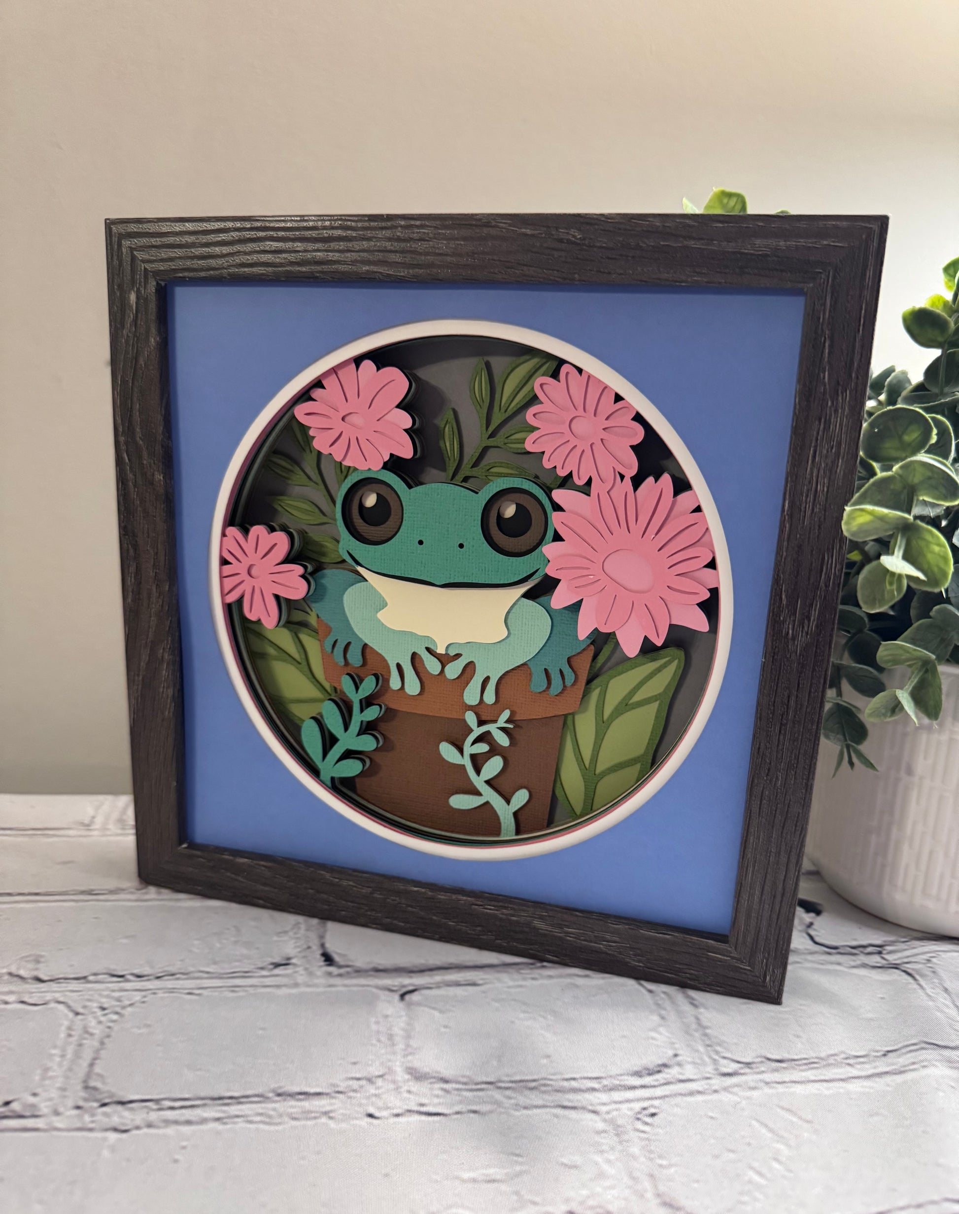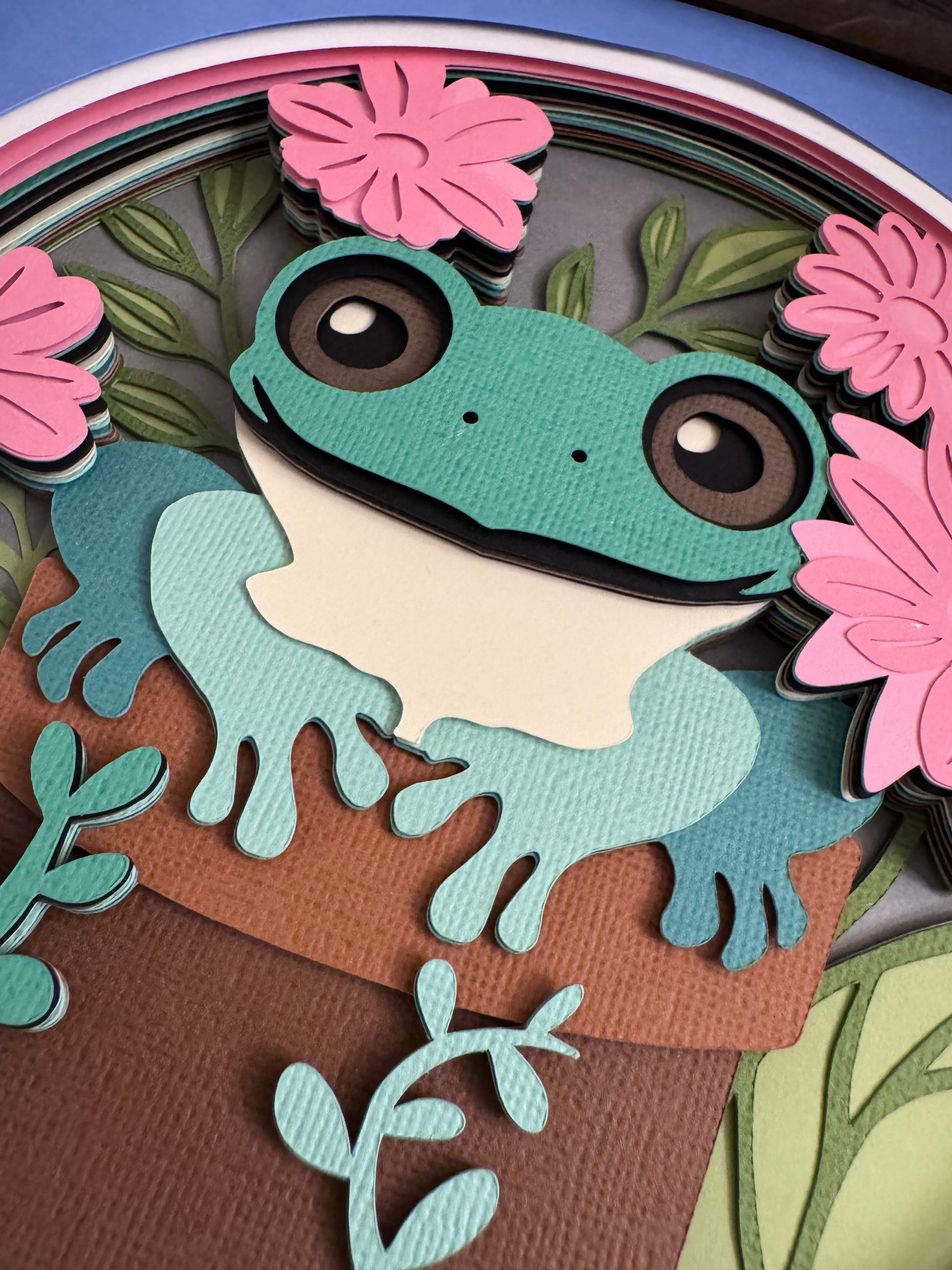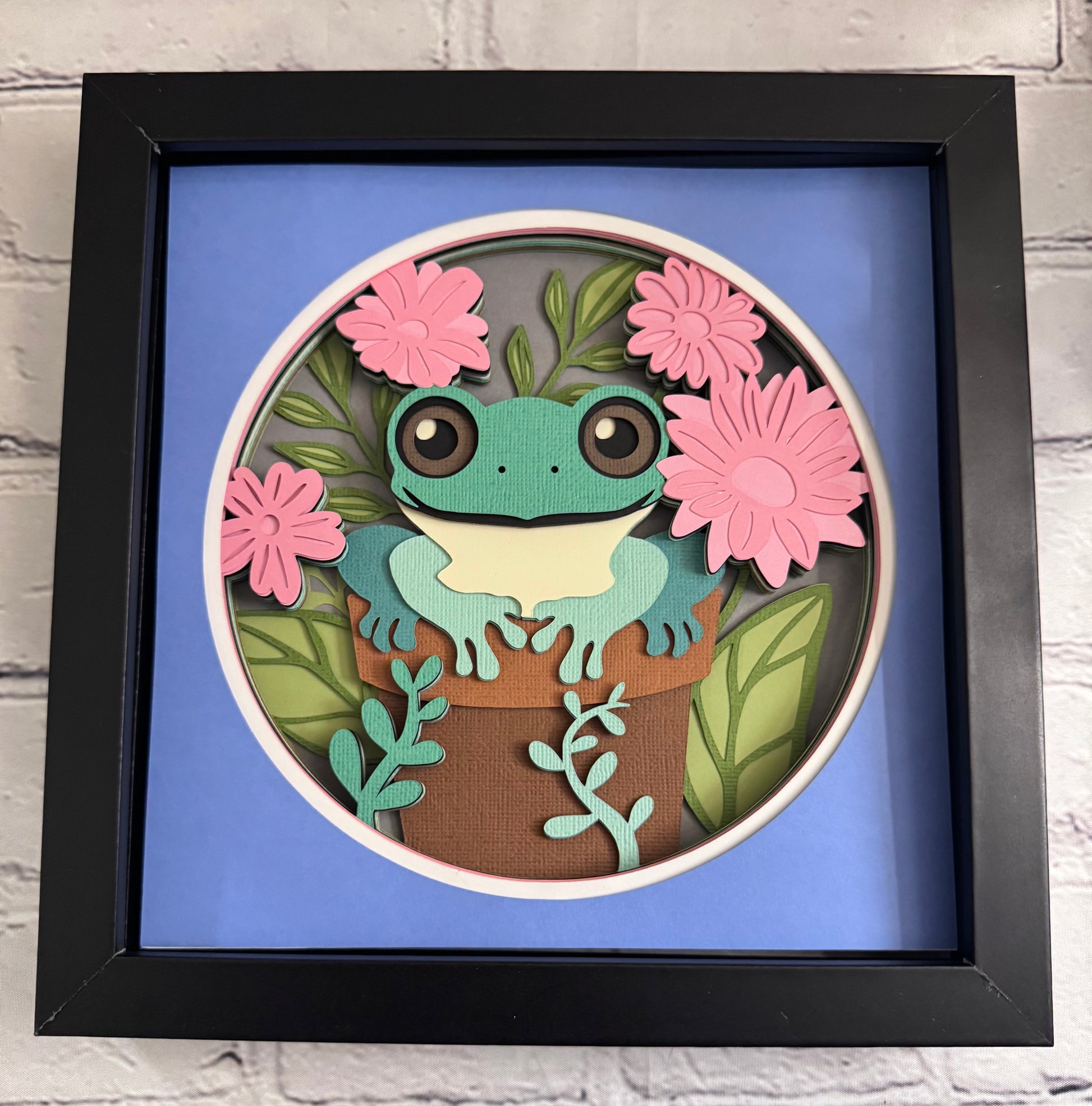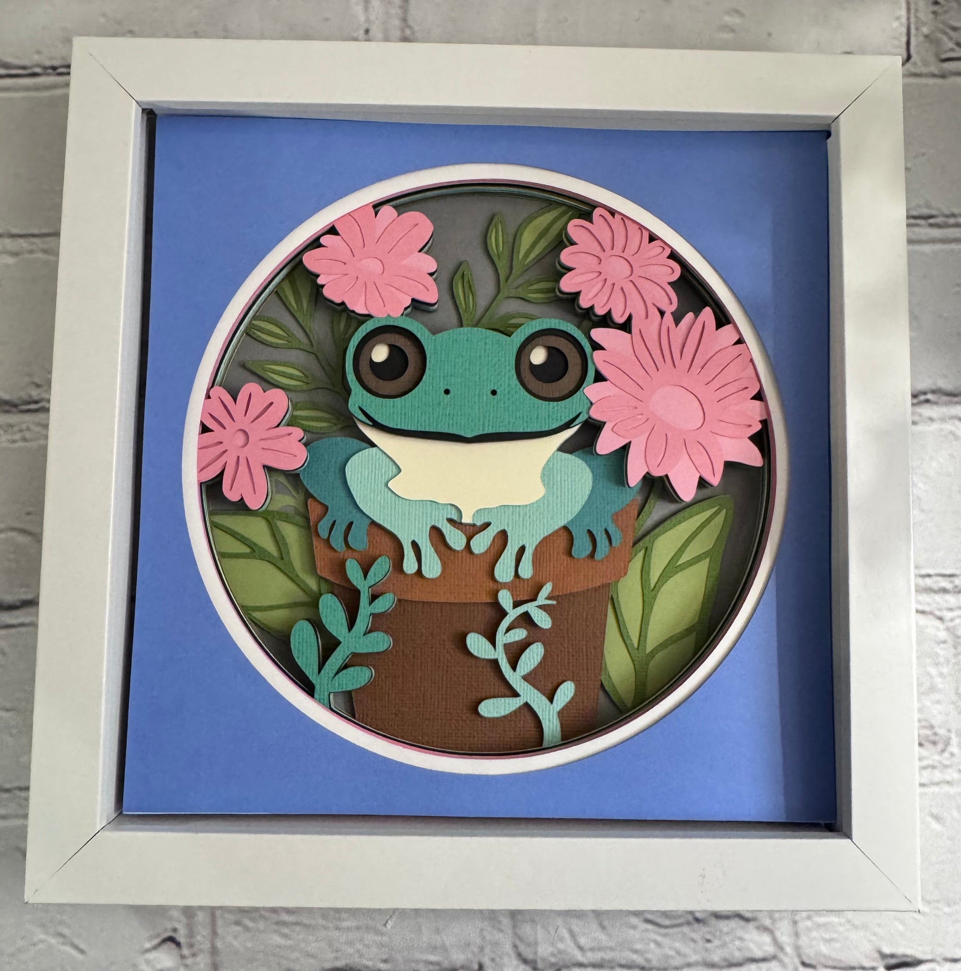Multi-layered cardstock art. Cut and assembled by hand, this art has adhesive foam in between the layers to give it a 3-dimensional look. This listing is for the art in an 8”x8” shadowbox.