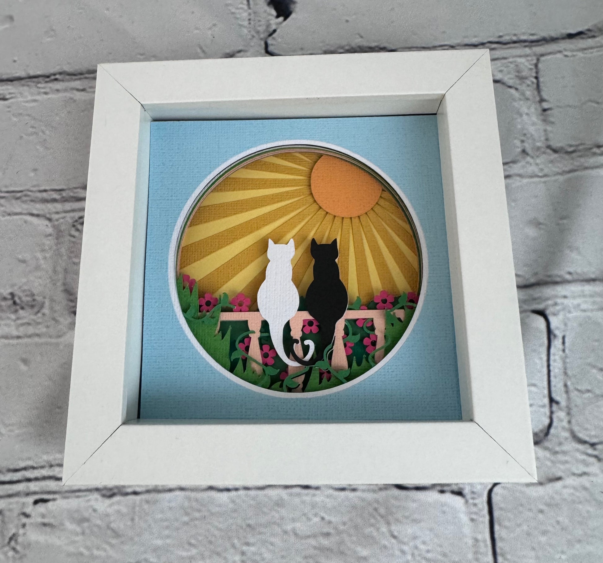 Two cats on fence with heart tails 3D paper art in a shadowbox