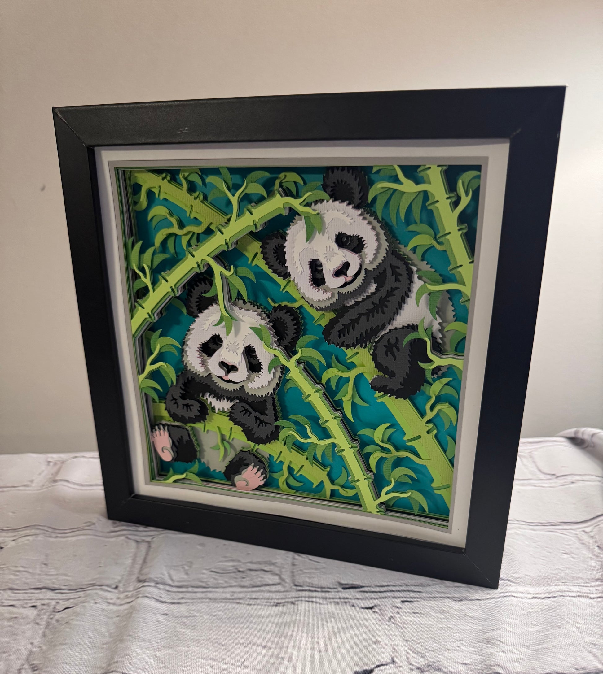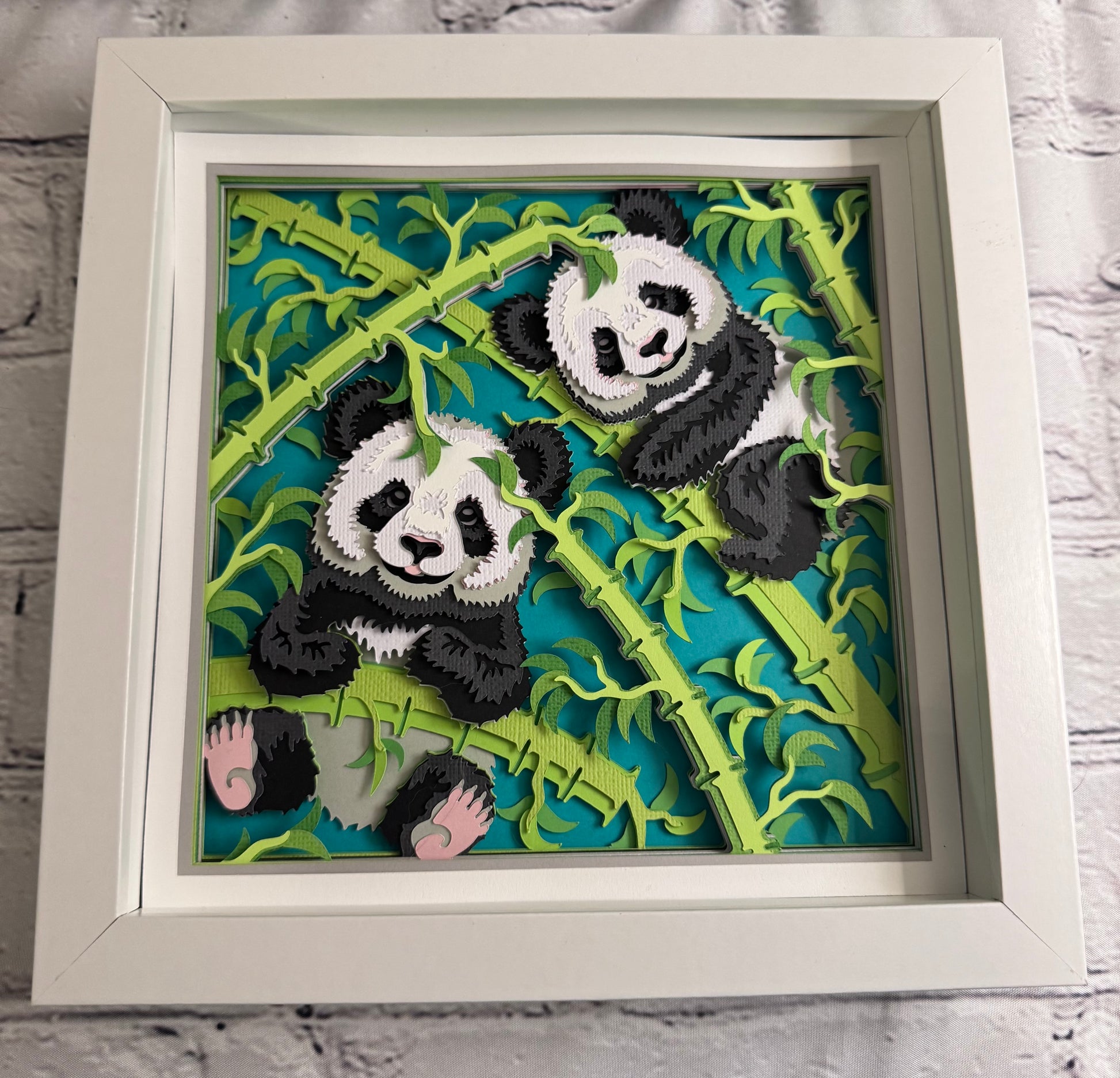 Multi-layered cardstock art. Cut and assembled by hand, this art has adhesive foam in between the layers to give it a 3-dimensional look. This listing is for the art in an 8”x8” shadowbox.