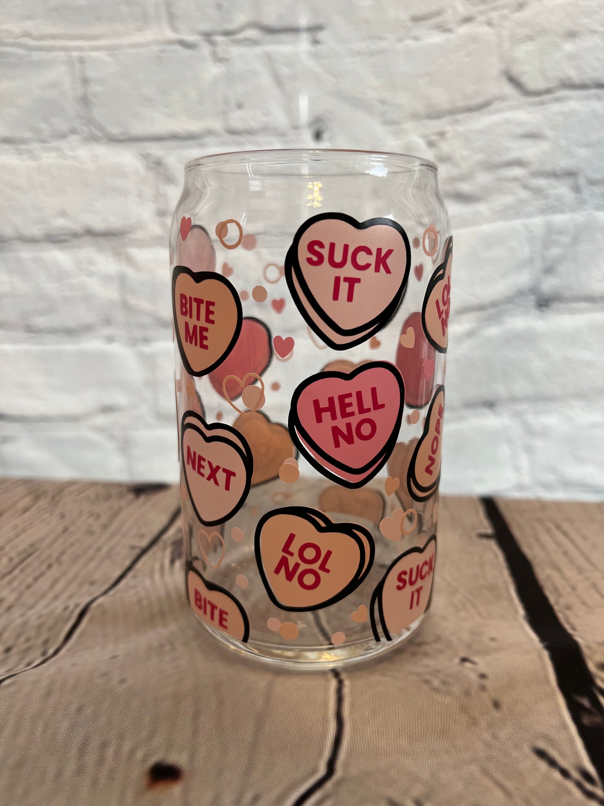 Beer can style glass. Perfect for iced coffee or any other type of cold drink! Designs are made from premium permanent vinyl and hand applied. Placement and color of designs may vary slightly from glass to glass. Bamboo lid and glass straw are included. This glass makes the perfect gift!
