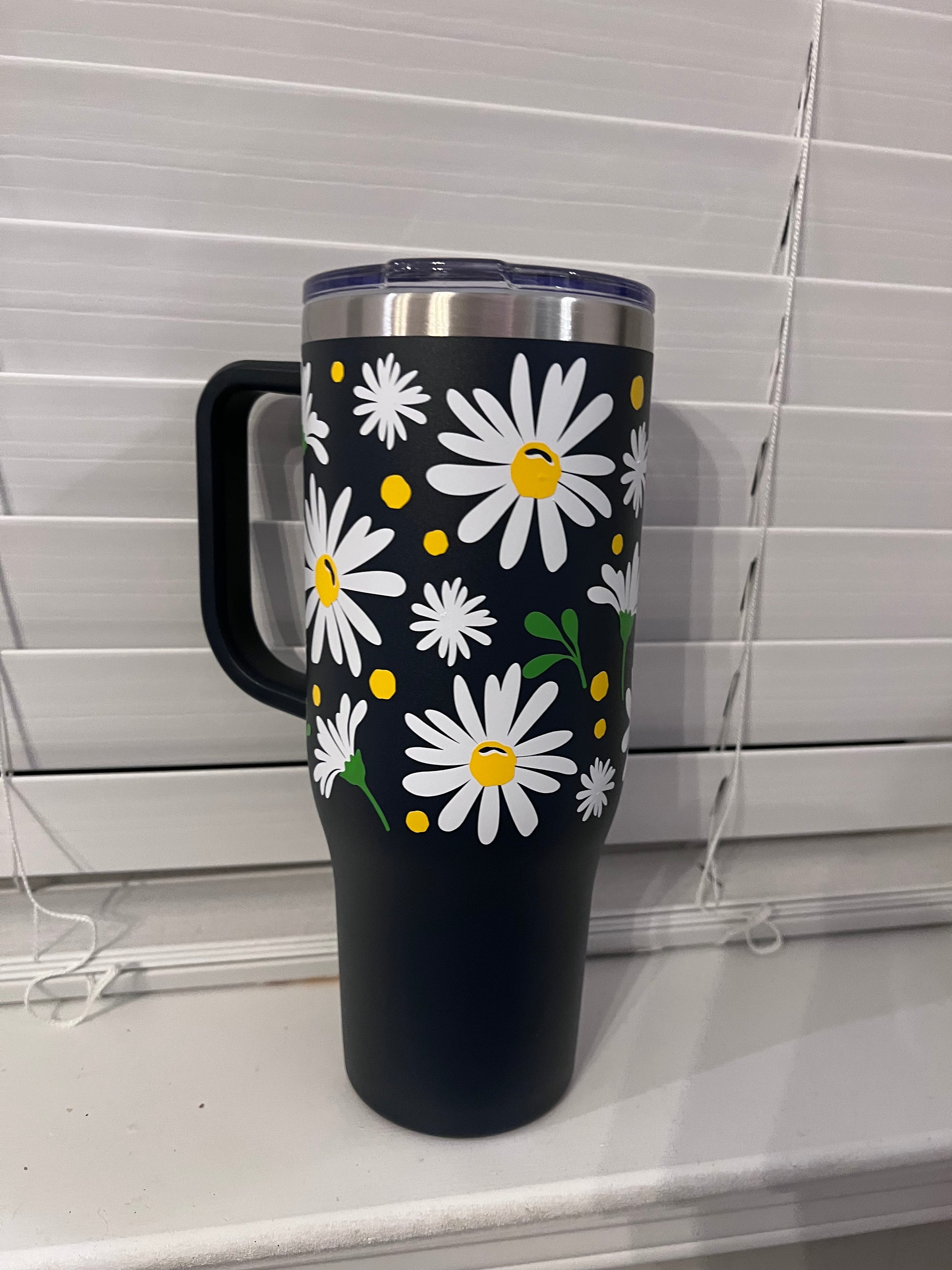 This 40 Oz Tumbler is a top-of-the-line beverage container designed for those who love to stay hydrated on-the-go. Constructed with food grade 18/8 stainless steel and double-walled vacuum insulation, this tumbler is the perfect solution for keeping your drinks hot or cold for hours. The 40-ounce capacity allows you to stay refreshed throughout the day without having to constantly refill. It has a large, ergonomic handle, making it easy to carry and hold while you are out and about. The twist-on, slide lid ensures your drink stays securely inside the tumbler while also preventing any accidental spills or splashes. It's also designed with it's tapered bottom, so that it fits into your vehicle's cupholder.