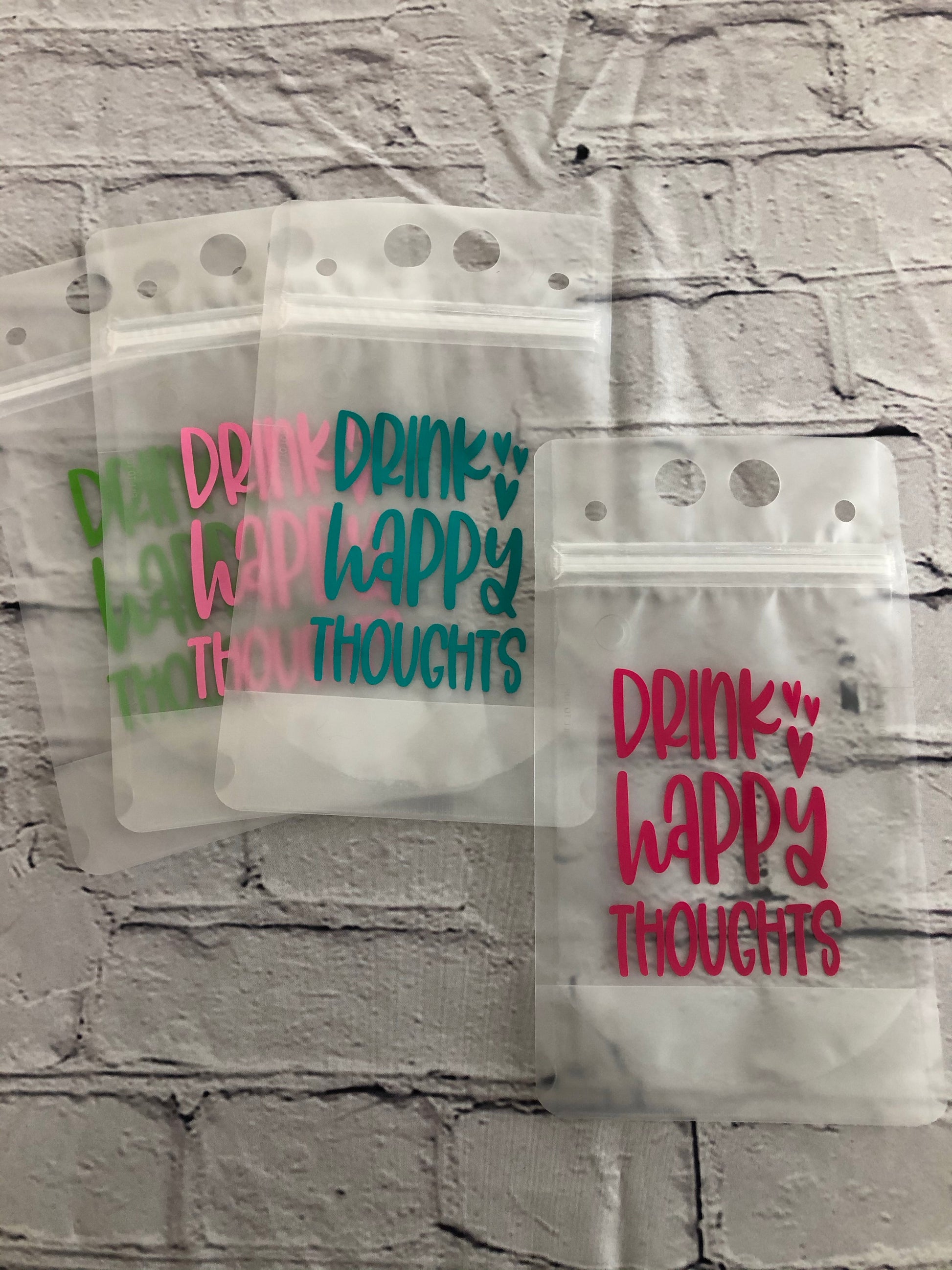 These reusable juice pouches are perfect for beside the pool, at the beach, around the campfire, or just having a staycation in your backyard! They are designed with two holes on top for hanging, and one on the back to insert the straw. No need to have your straw sticking out of the zippered top, so no spilling! Filled pouches have a sturdy bottom that allows them to stand on a table or other flat surface. Comes with a straw and the permanent vinyl design pictured. Pouch should only be hand washed and can be reused. DO NOT place in the dishwasher or microwave. May also be frozen!