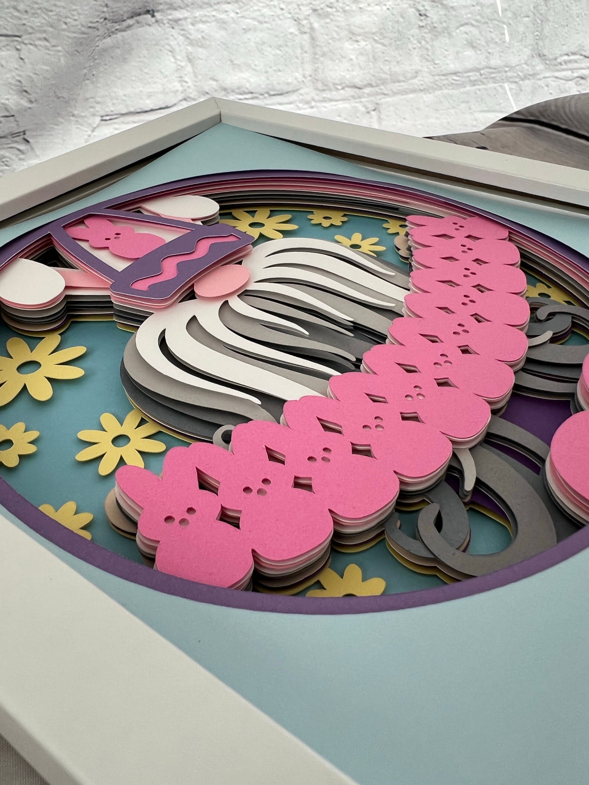 Multi-layered cardstock art. Cut and assembled by hand, this art has adhesive foam in between the layers to give it a 3-dimensional look. This listing is for the art in an 8”x8” shadowbox.