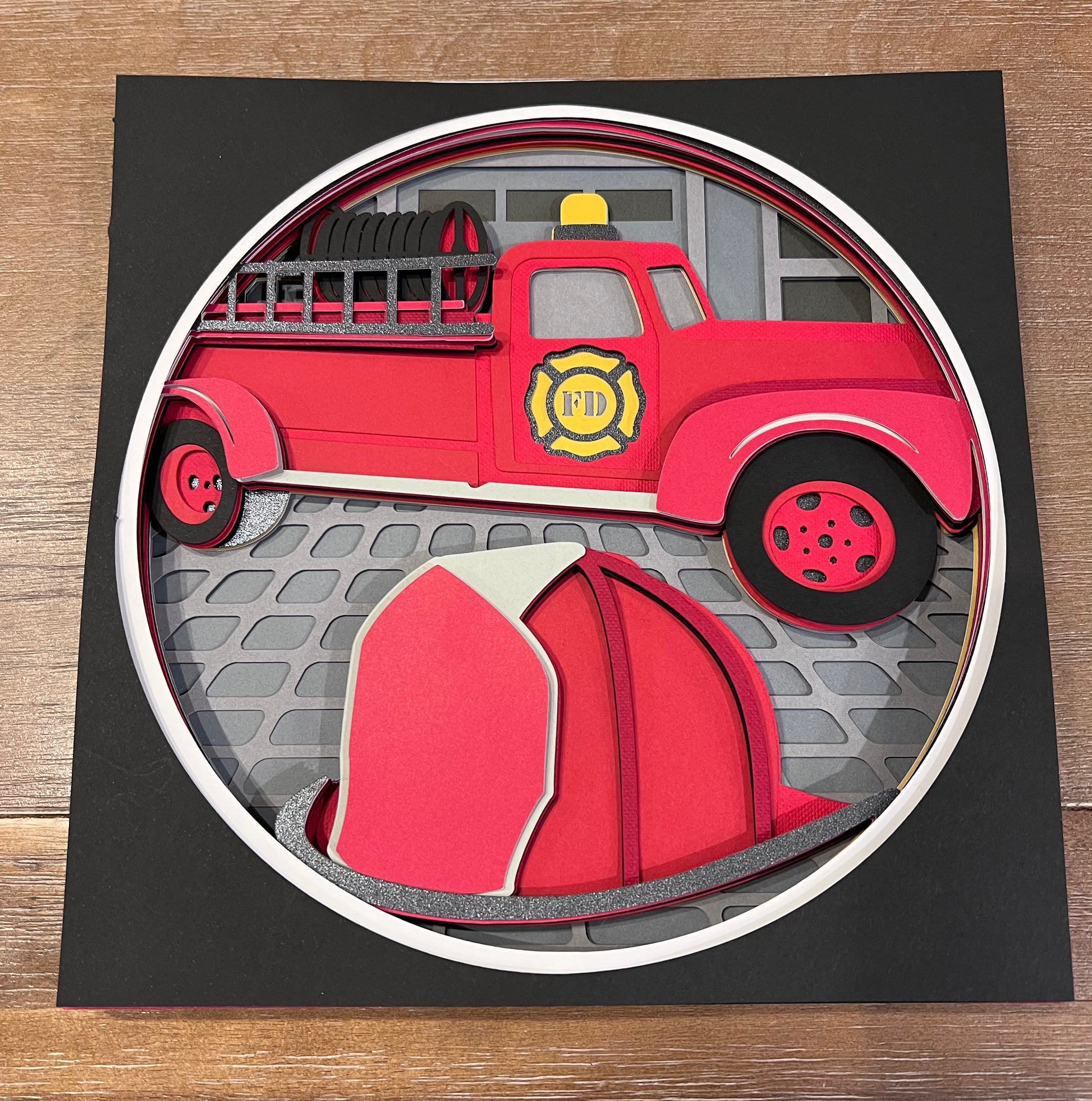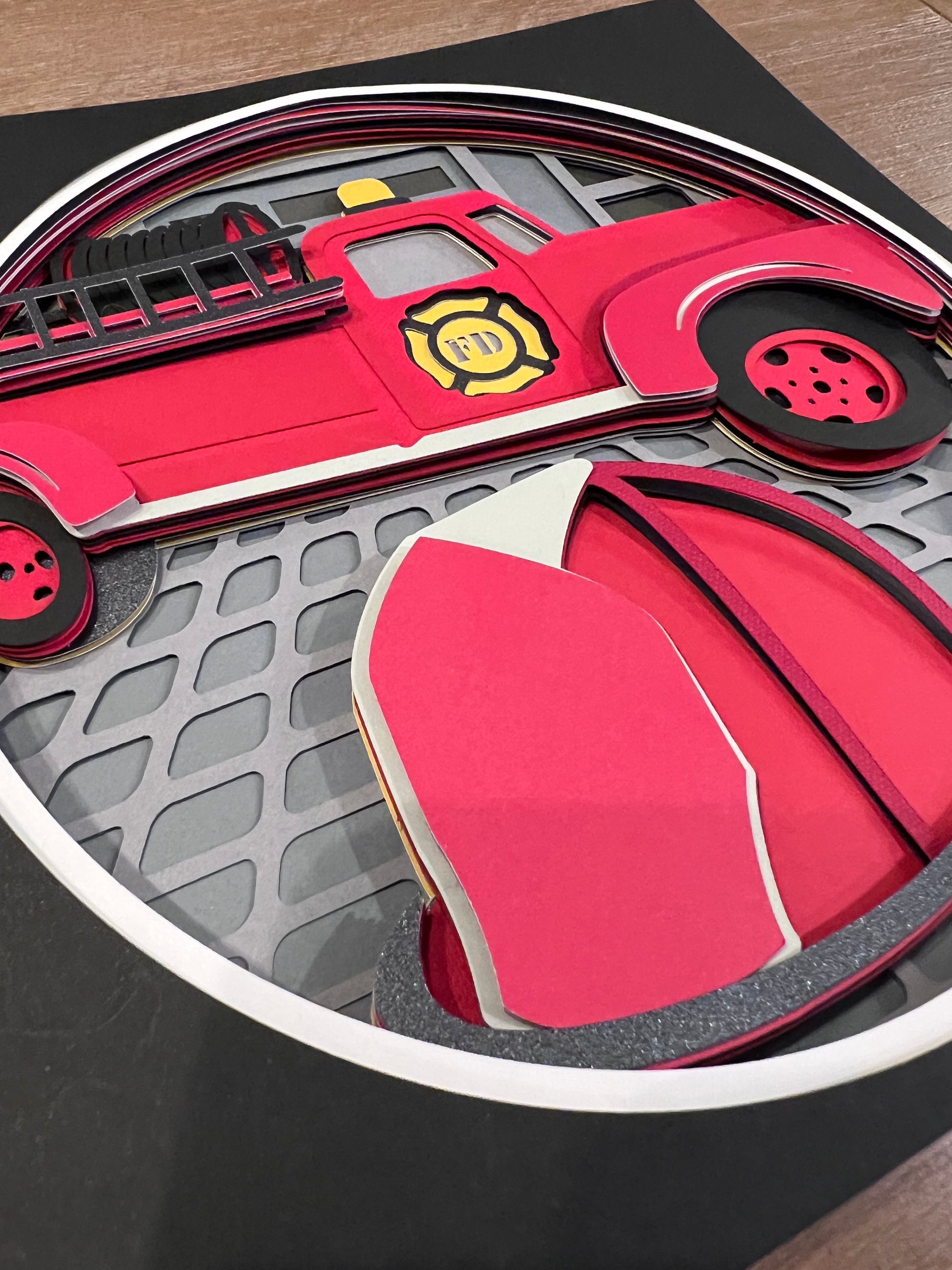 Fire station with truck and helmet 3D paper art in a shadowbox