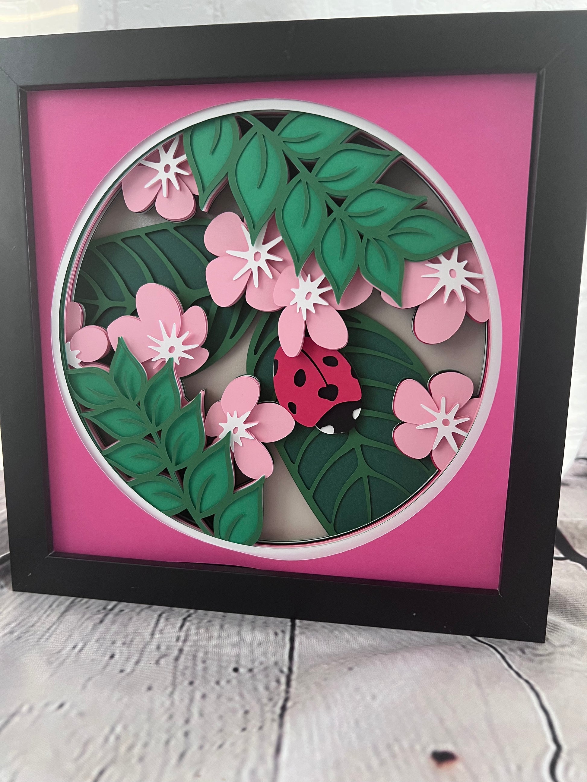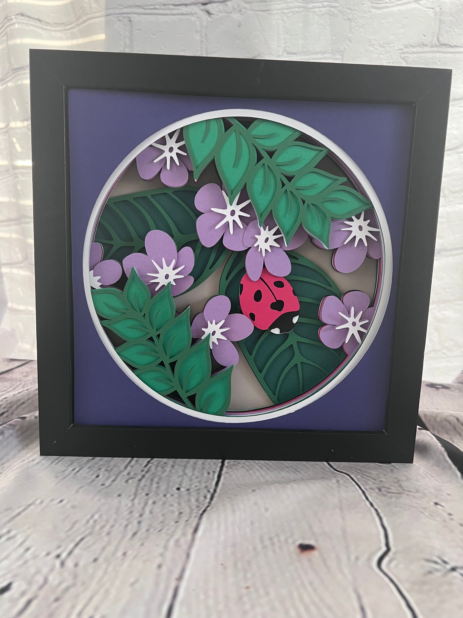 Multi-layered cardstock art. Cut and assembled by hand, this art has adhesive foam in between the layers to give it a 3-dimensional look. This listing is for the art in an 8”x8” shadowbox.