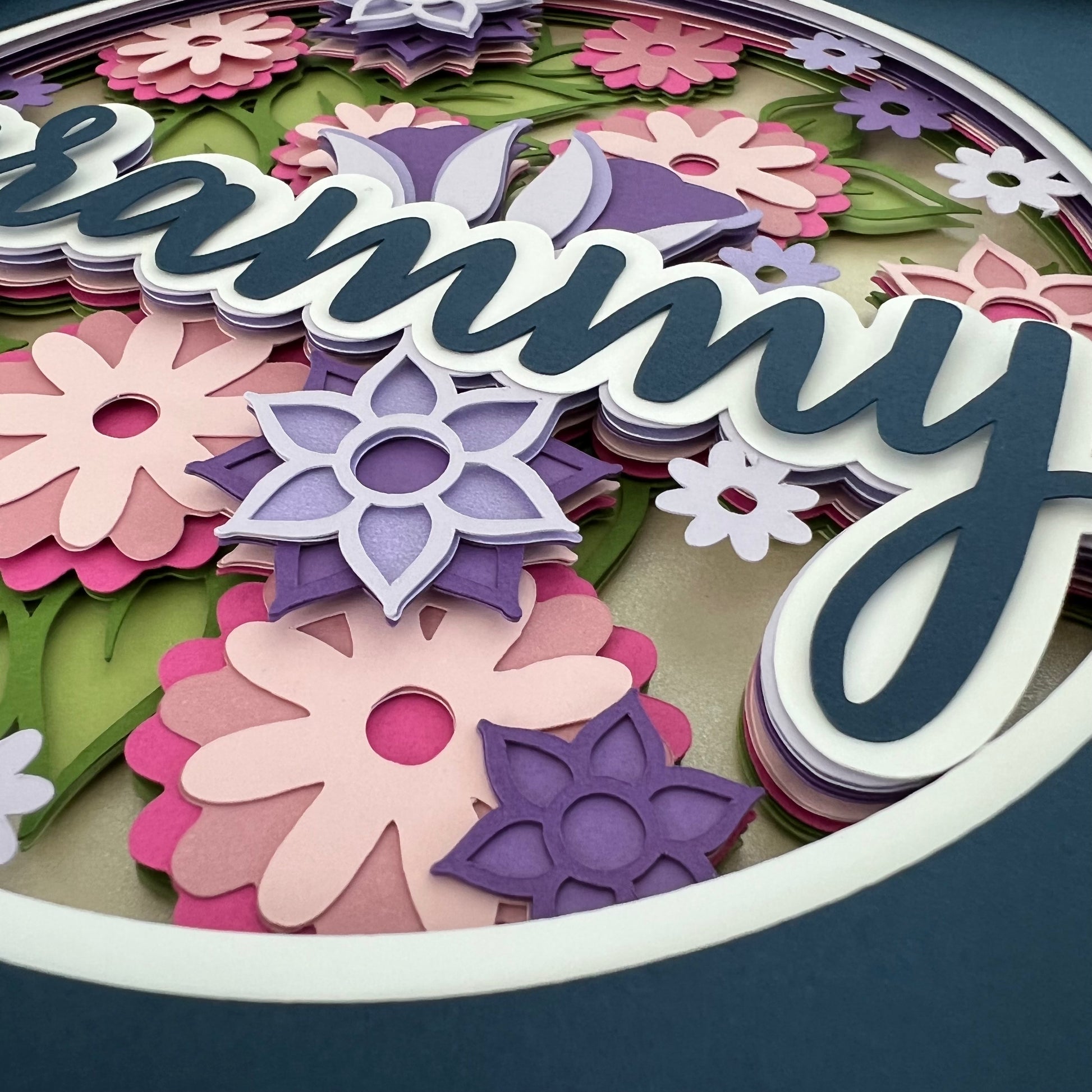 Multi-layered cardstock art. Cut and assembled by hand, this art has adhesive foam in between the layers to give it a 3-dimensional look. This listing is for the art in an 8”x8” shadowbox.